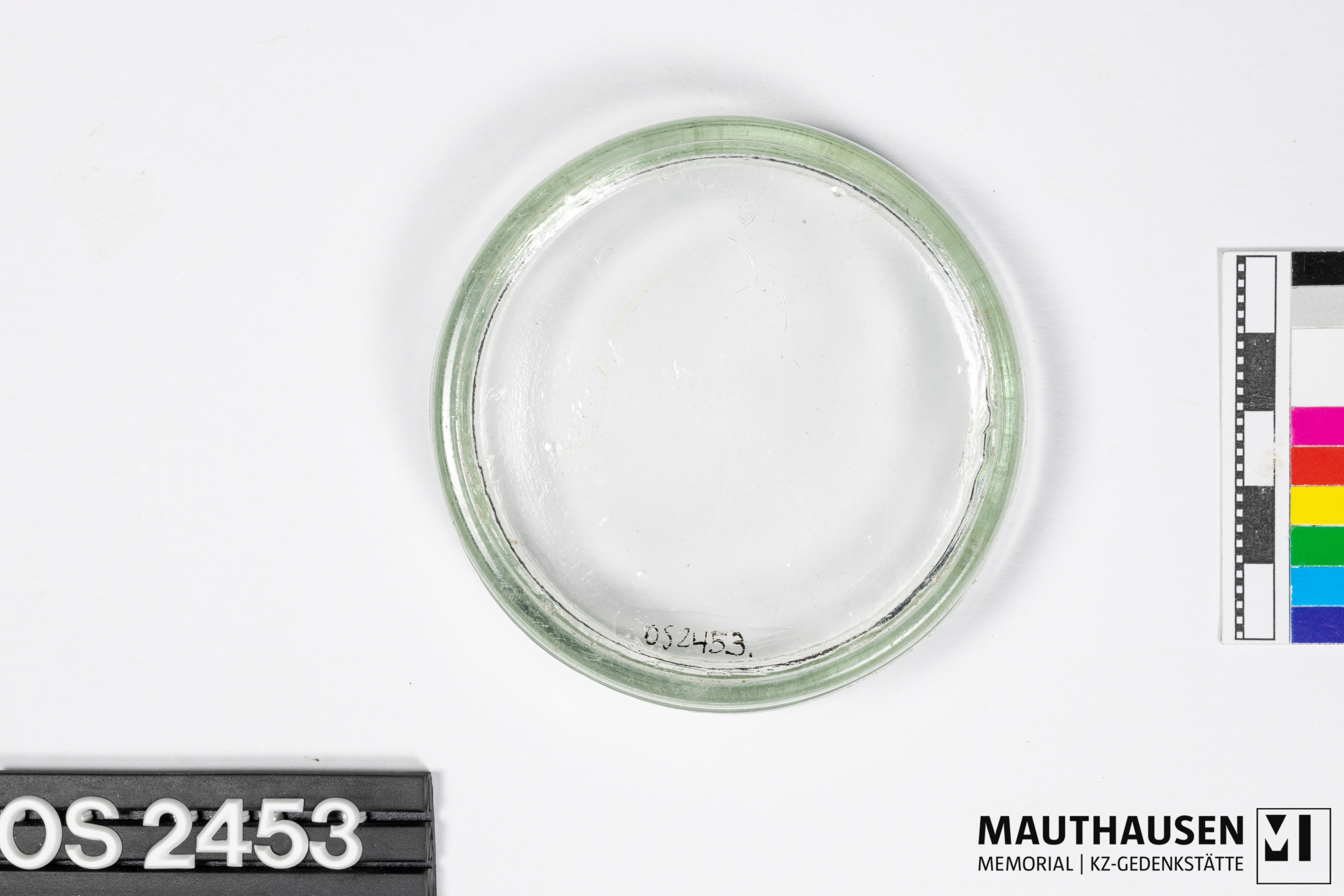 Glas; Weißglas, transparent; Boden rund, abgesetzt; Standring; Randwulst für Deckel; dickwandig