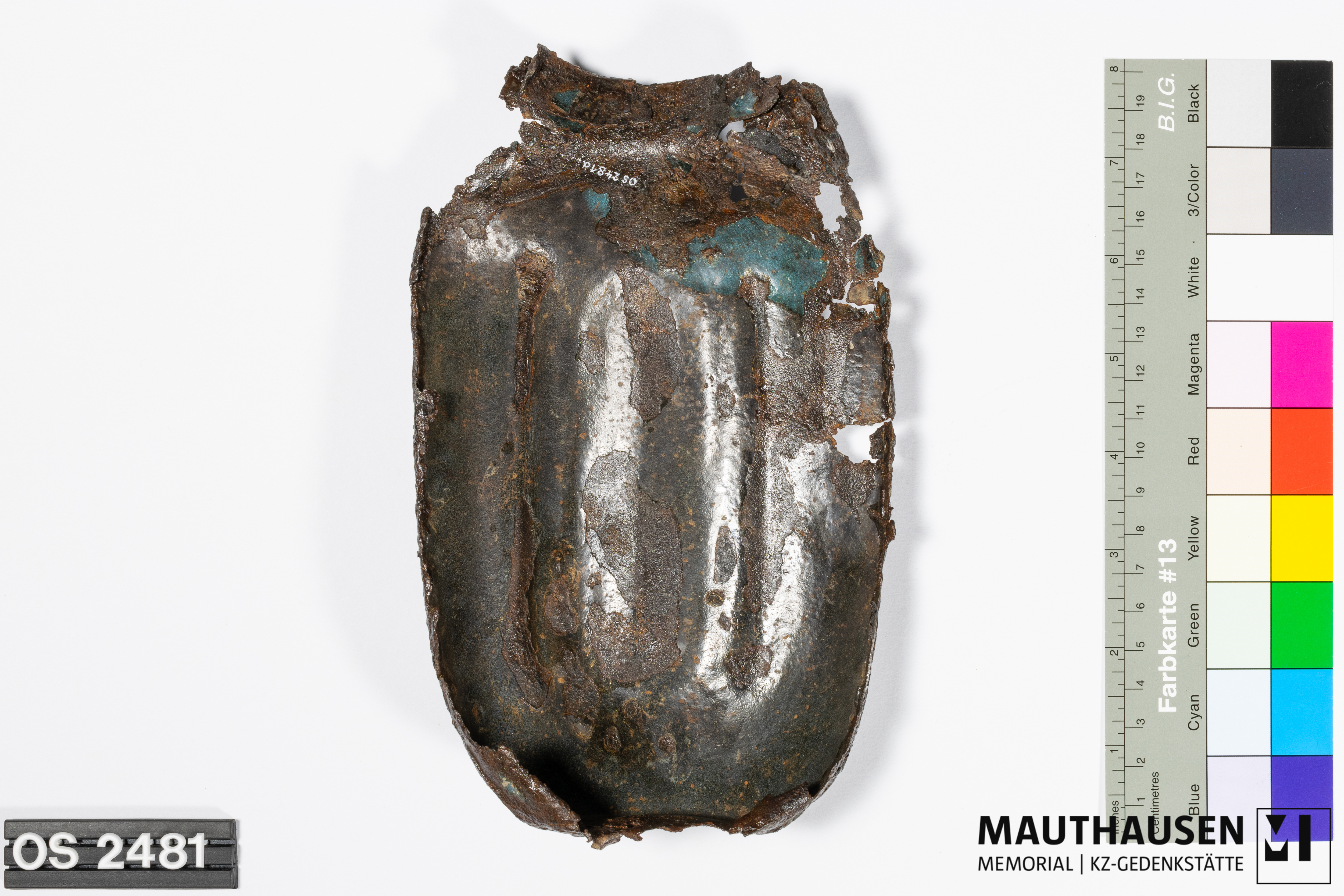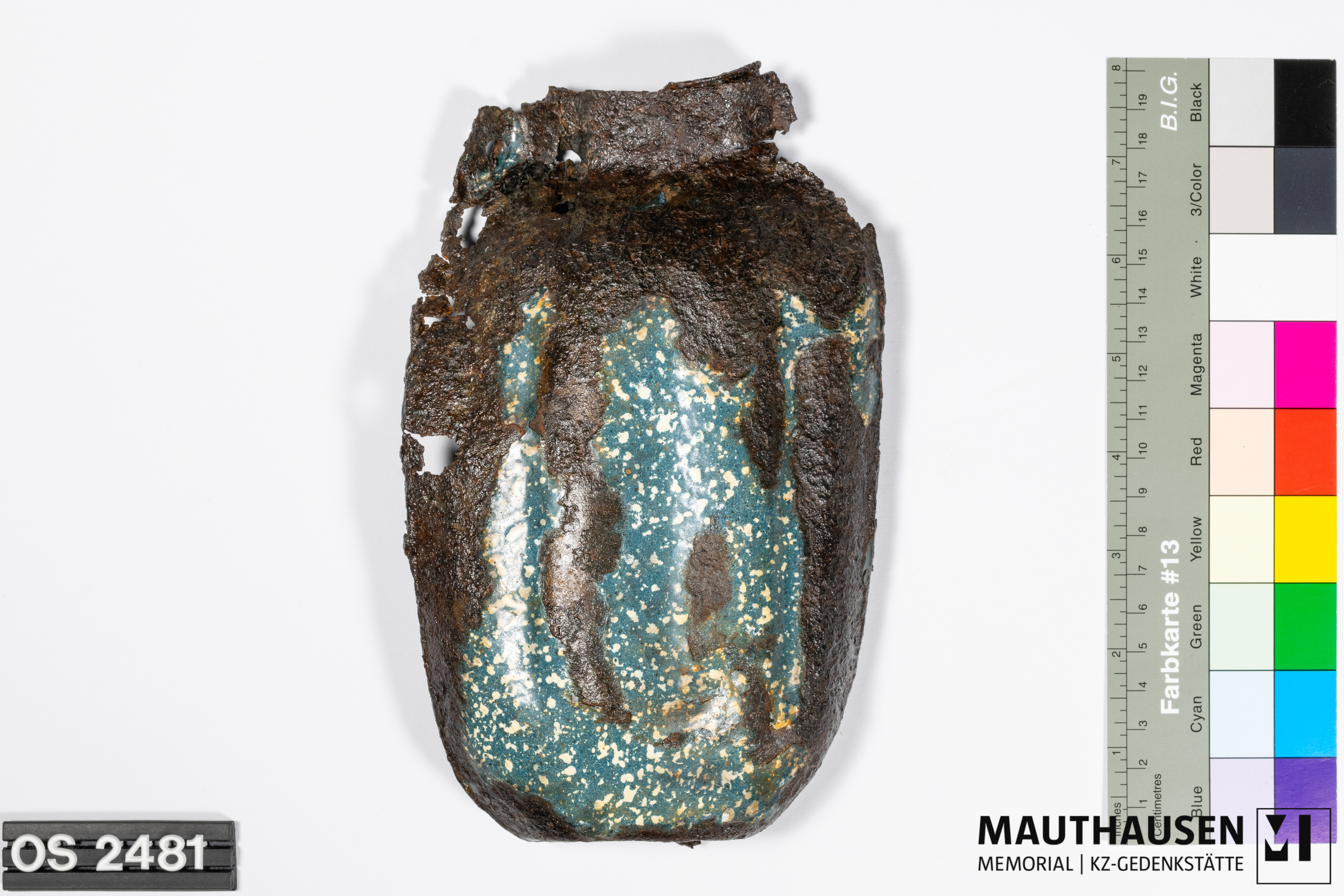 OS-Nr. geteilt in a und b; Feldflasche; fragmentarisch erhalten; OS2481a: eine Hälfte der Flasche erhalten von Boden über Körper bis Ausguss; deformiert; Außen bläulicher Emailüberzug mit weißen Sprenkeln partiell erhalten; Innen: blauer Emailüberzug partiell erhalten; Wand mit drei länglichen Wölbungen nach innen; zwischen Schulter und Ausguss Durchlochung/Henkel; An Ausguss zweilagiges Metall und Lochung; Ausguss Rand leicht umgerollt. OS2481b: Fragment, welches zur Feldflasche gehört, vermutlich zum Ausguss/Rand, Teile von Rand und Wand erhalten.