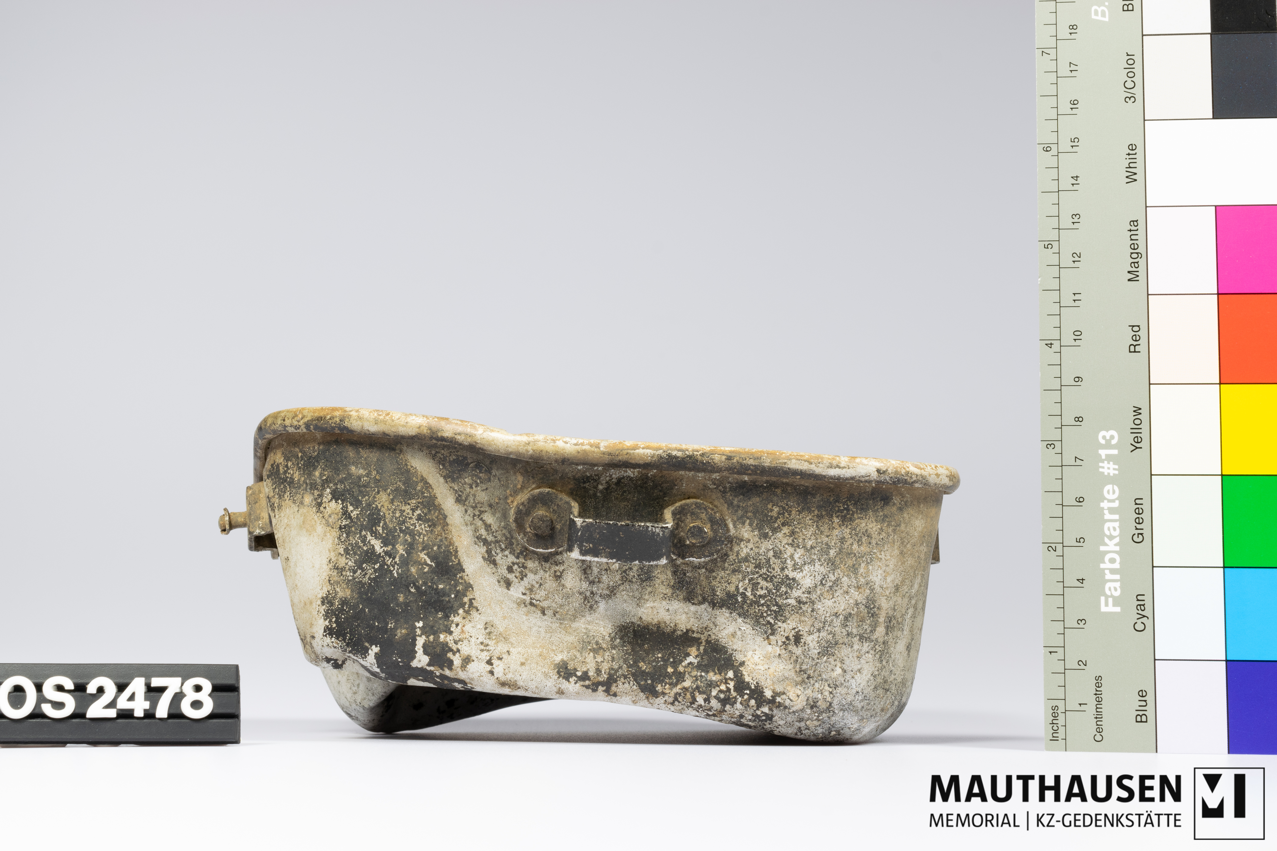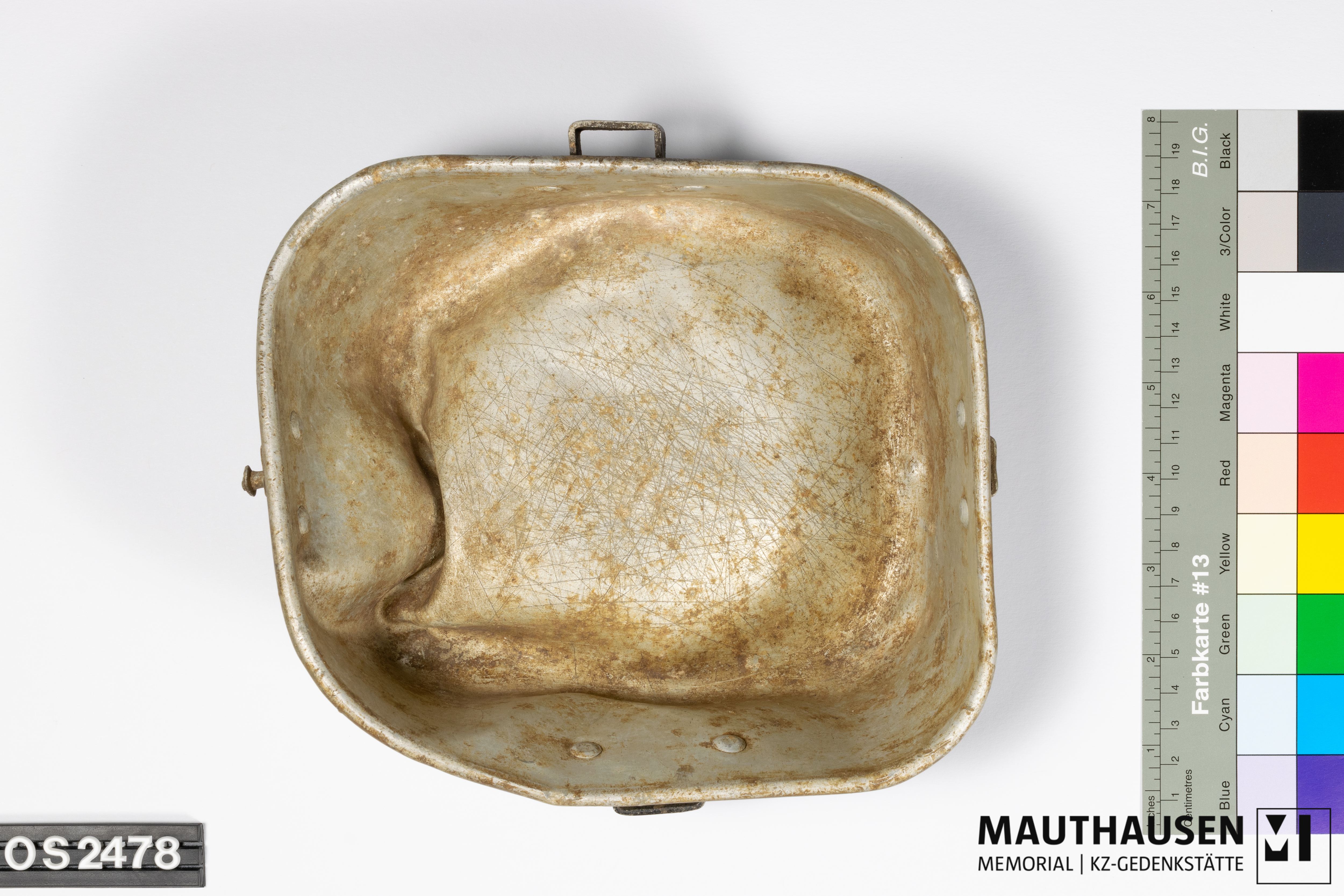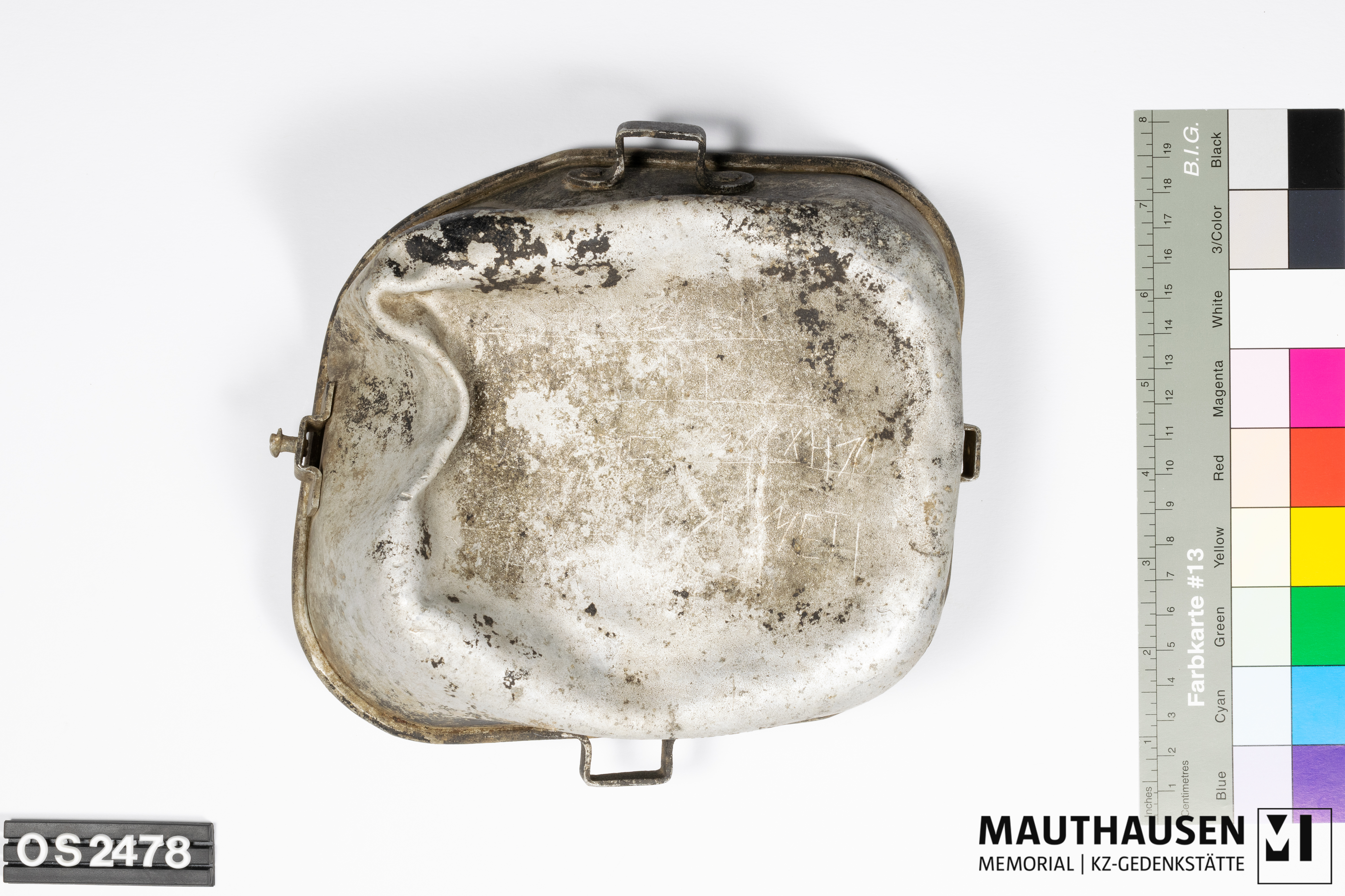 militärisches Feldgeschirr/Topf; Kratzer im Innern (Schneiden mit Messer) und Rußspuren vom Gebrauch; Handhaben für Anbringung eines Bandes zum Anbringen an der Kleidung/Rucksack; siehe Vergleichsobjekt OS2408; Einritzung Boden Außenseite: persönliche Kennzeichnung mit Namen, Geburtsdatum, Adresse (?): SZARKUZUIAK könnte der Name der Stadt Sárközújlak sein, heute Livada Mica in Rumänien; Name: SCHVARTZ (Nachname) JOSZEF (Vorname), "Schwarz" wäre die ungarische Schreibweise; 1916XII10 könnte Geburtsdatum sein; Adresse: "SZATMAR NEMETH (Szatmárnémeti, Satu Mare, Sathmar) BATHOR MUTH 3 (Straße Báthory út 3)