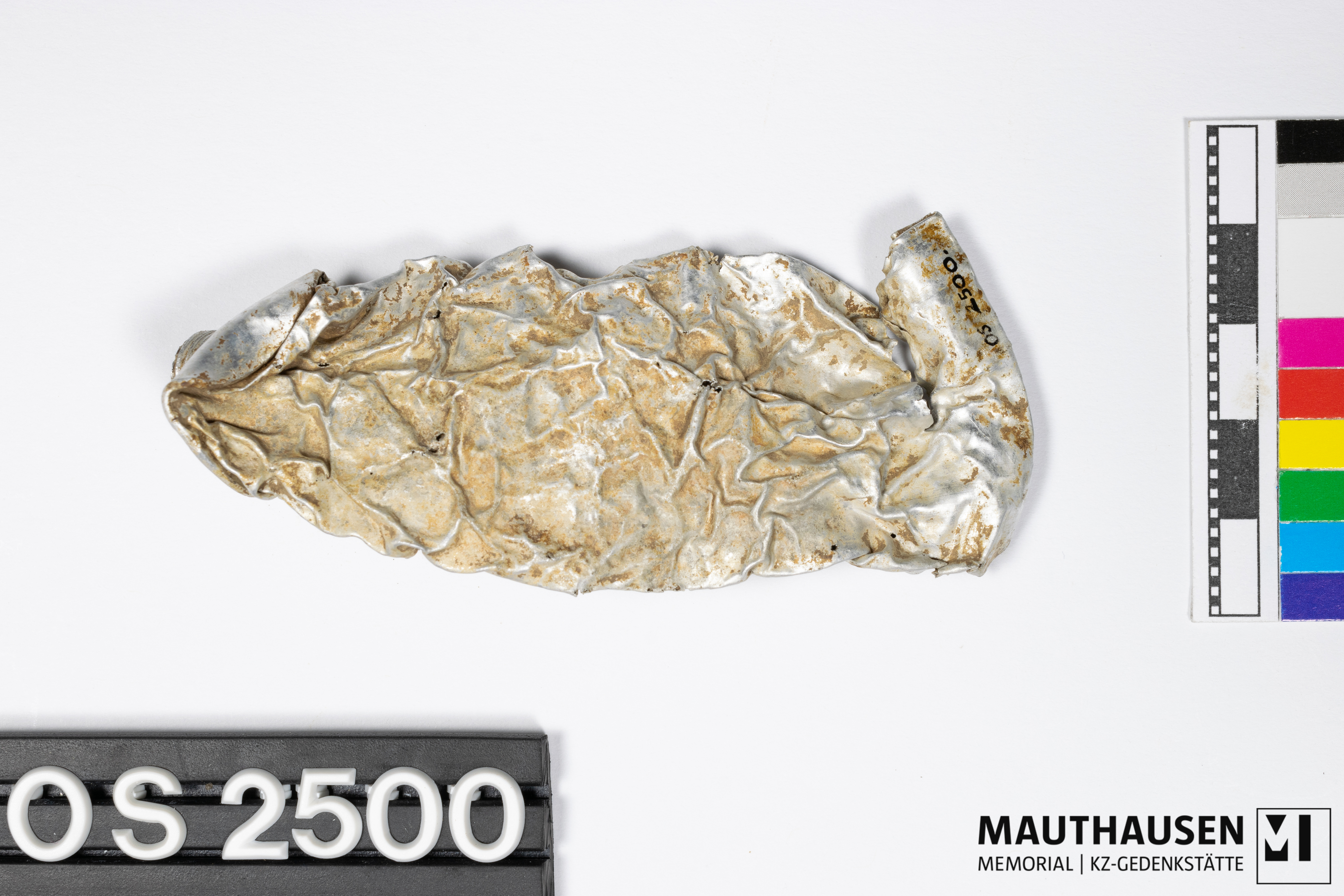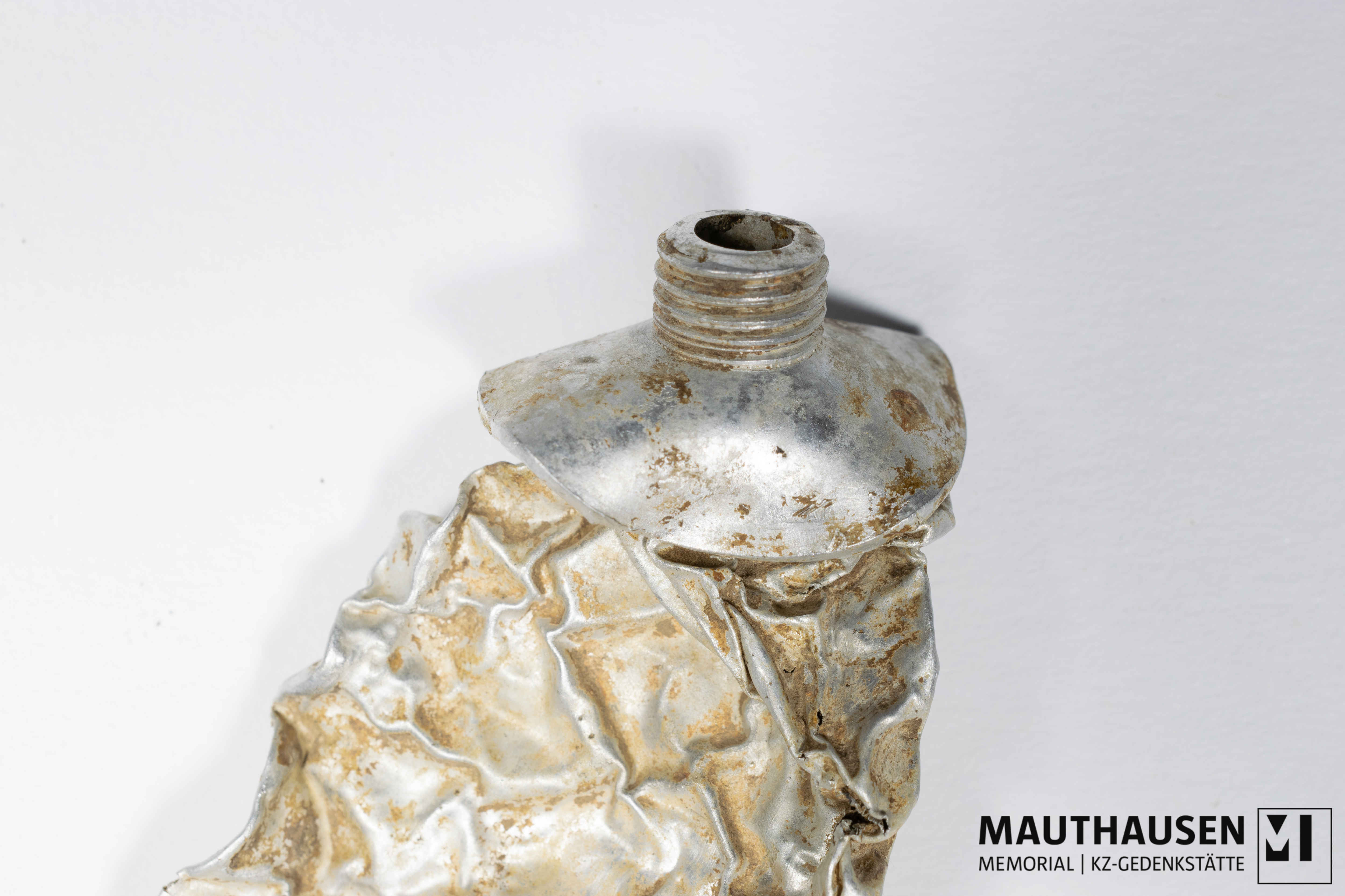 DescriptionTube; deformiert, zusammengedrückt; oben Öffnung mit Gewinde; unterer Rand umgebogen (Tubenfalz); zwei kleine feste braune Klumpen (Tubeninhalt?) separat in einer Tüte verpackt