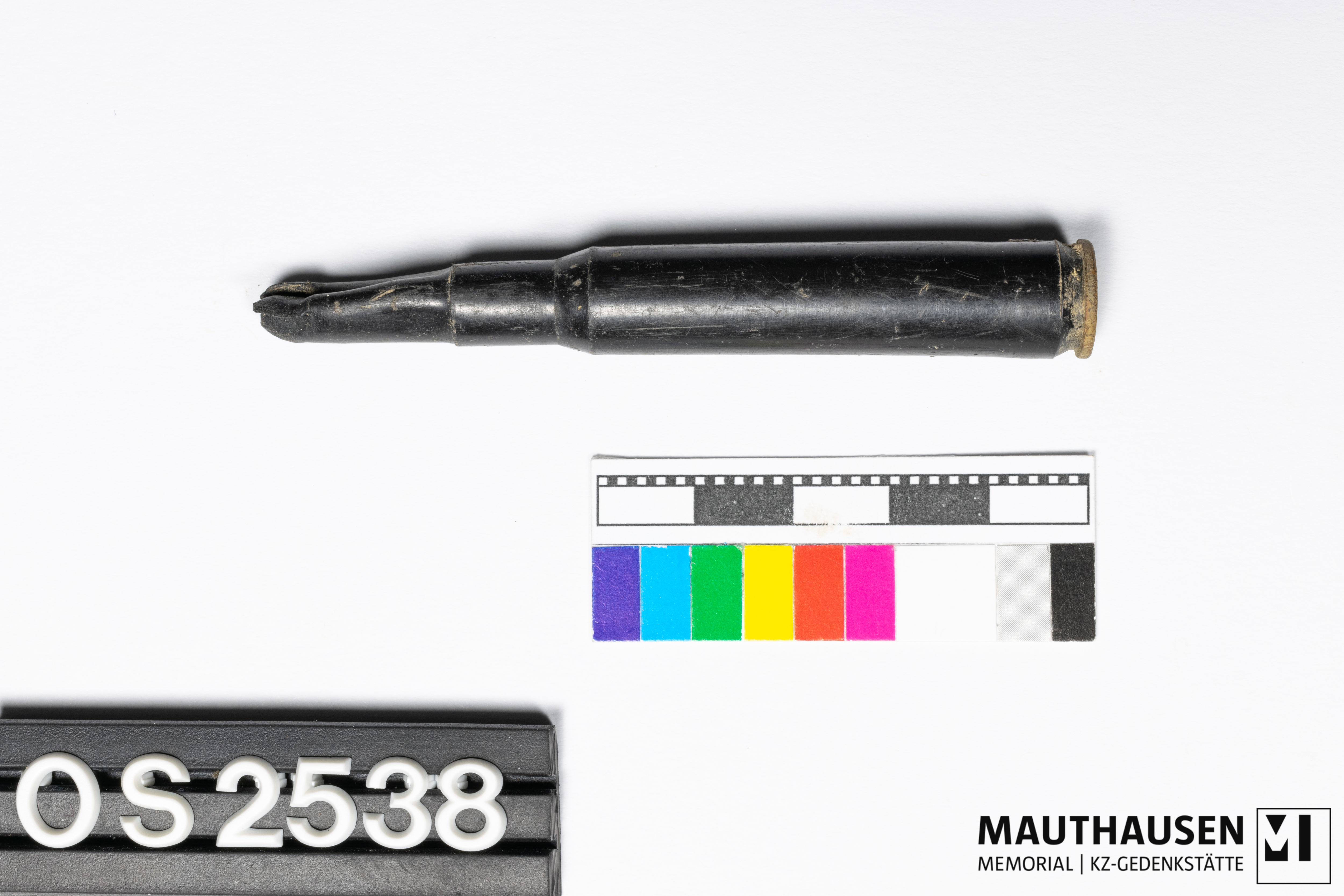 DescriptionFlaschenhalshülse, längliche Form, Hülse aus Kunststoff; unten rundes Metallblech/Anzündhütchen; Hülse verjüngt sich nach oben hin; oberes Ende aufgebrochen