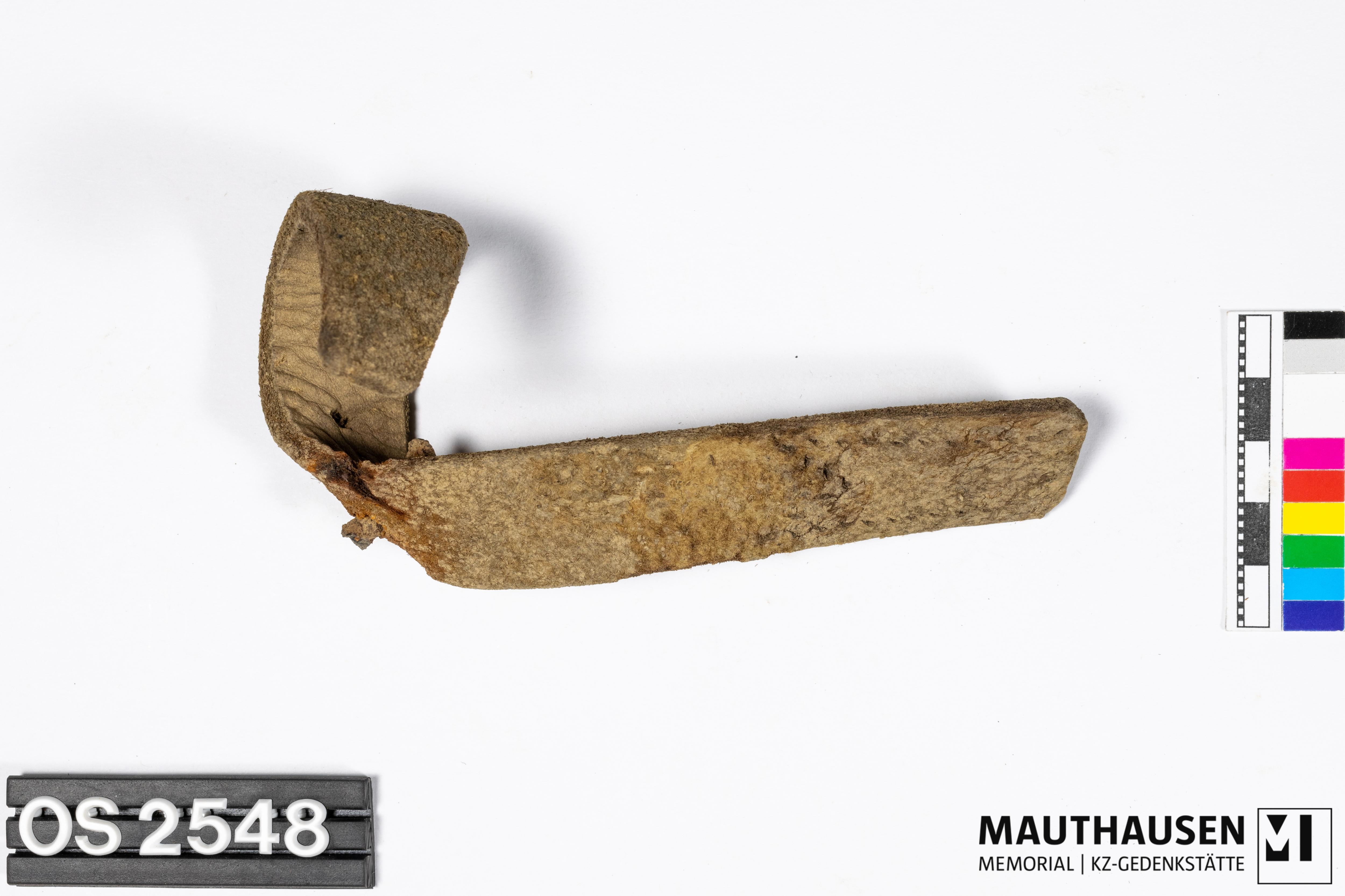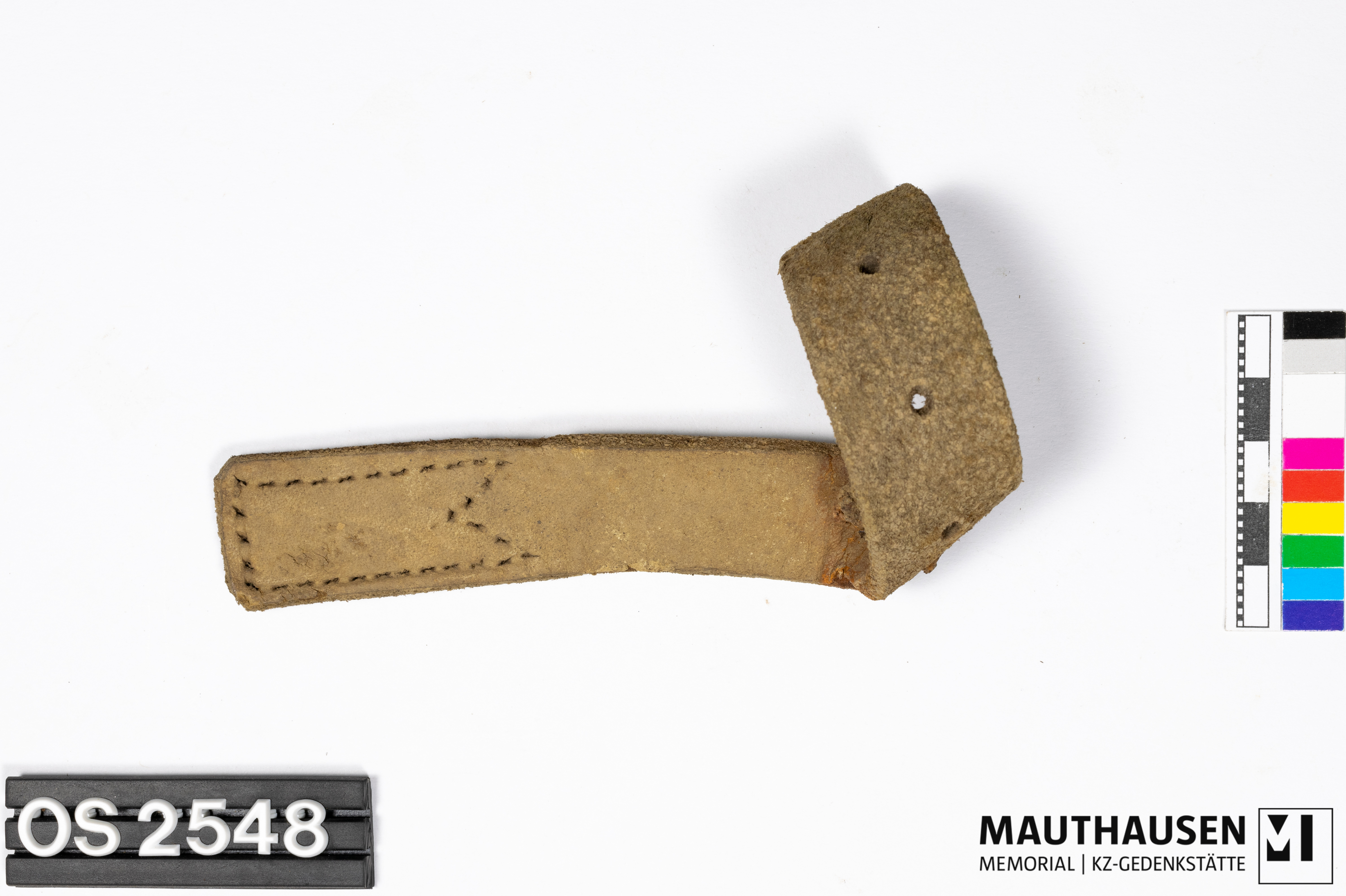 DescriptionGürtel/Riemen; ein Ende rechteckig, das andere Ende läuft Spitz zu; etwa mittig biegt sich der Gürtel; 4 Durchlochungen, in einer Durchlochung steckt ein Metalldorn; Nahtspuren in der Form eines "M"