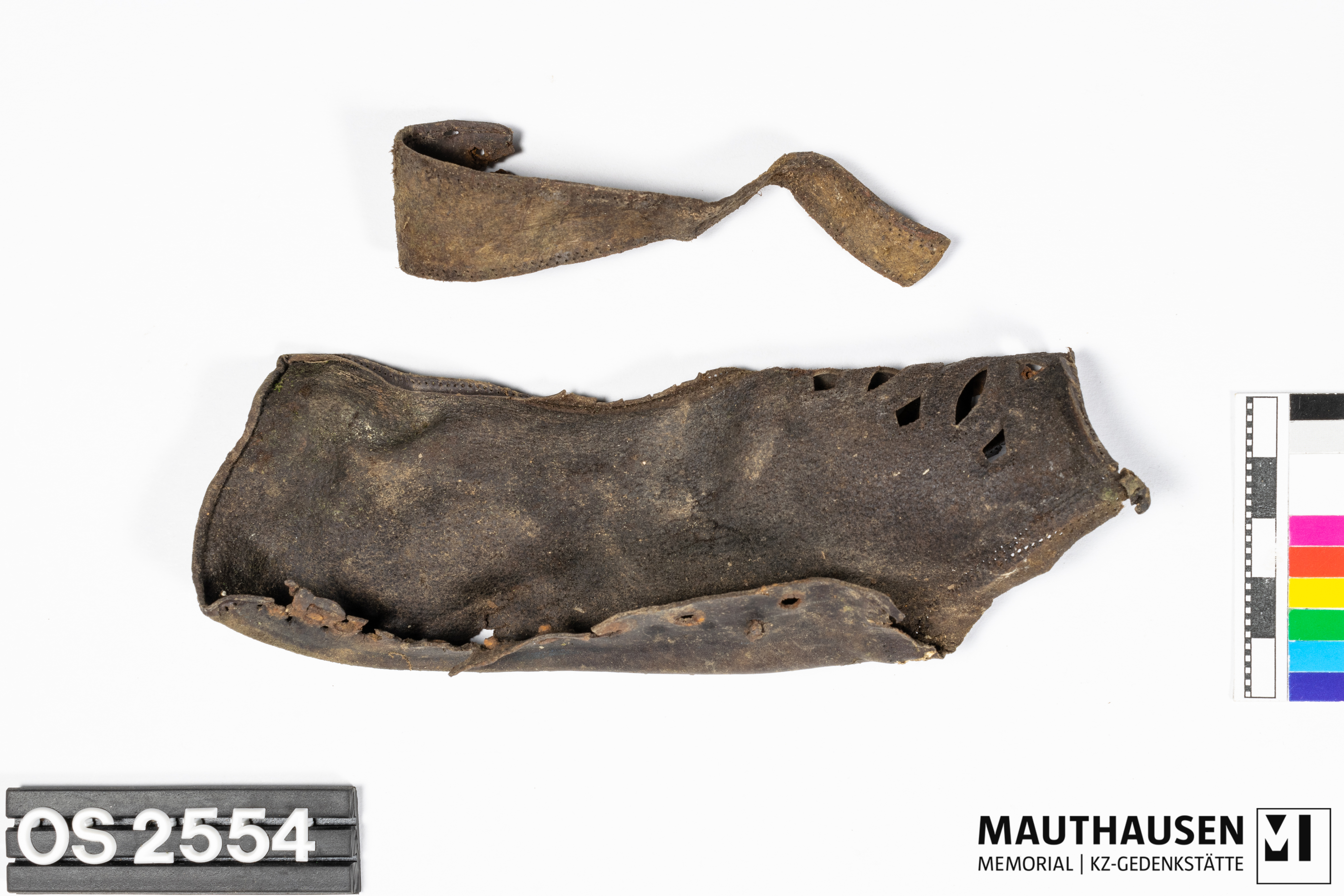 BeschreibungSchuhoberleder und Riemen; Teilung in a (Schuhoberleder) und b (Riemen) OS2554a: Schuhoberleder; deformiert; Farbe braun; Nagellöcher; 3 Metallnägel; Dekorstanzung; Nahtspuren; OS2554b: Riemen; deformiert; länglich; ein Ende gerader Abschluss, verbreitert sich zum anderen Ende hin, dort mehrere Durchlochungen; Farbe braun; Nahtspuren