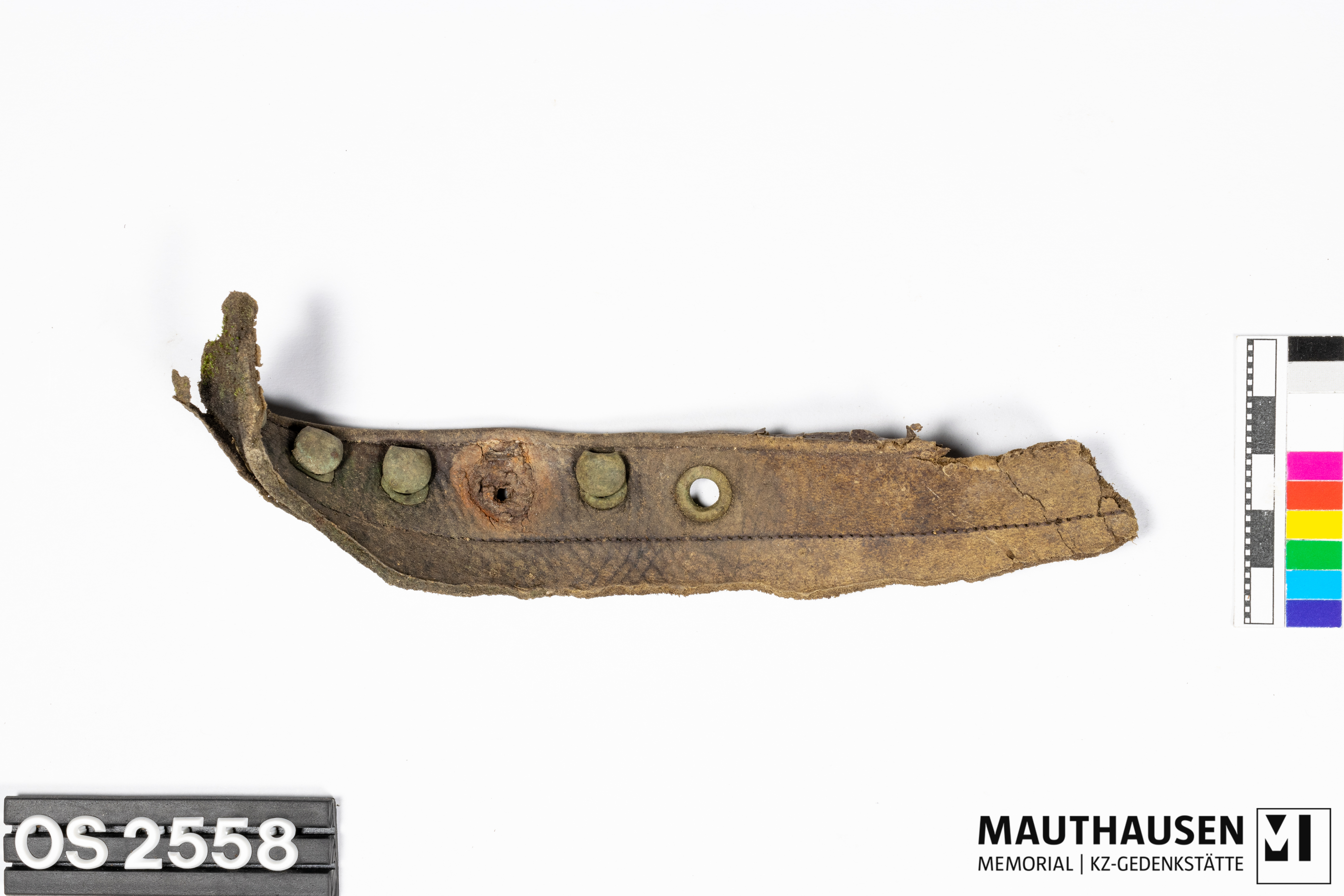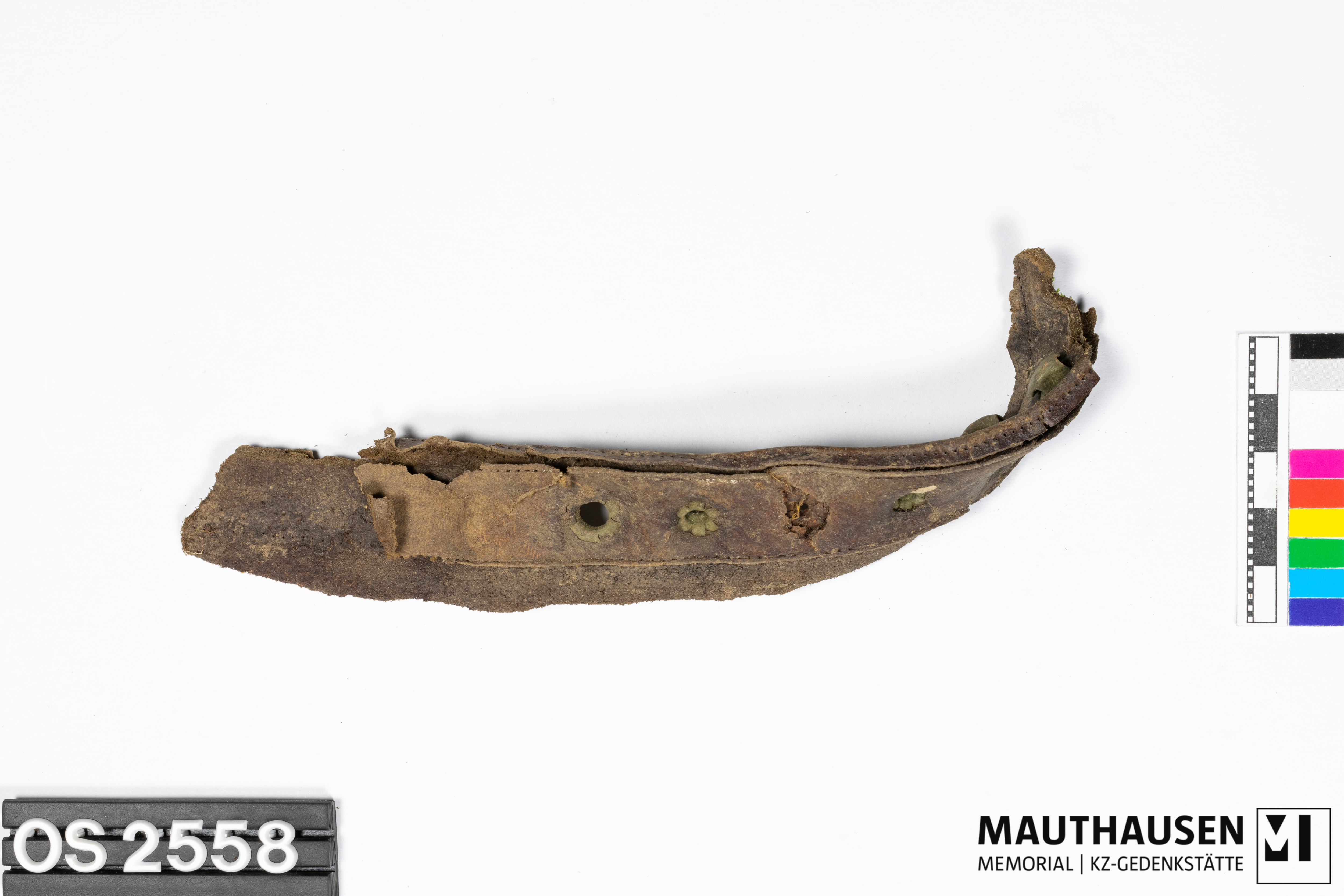 BeschreibungSchuhoberleder; deformiert; längliches Stück; Farbe braun; 6 Durchlochungen für Schnürösen; 4 hakenförmige Metallschnürösen erhalten; bei zwei Durchlochungen nur mehr Metallring erhalten, davon einer stark korrodiert; auf der Rückseite zusätzliches Leder zur Verstärkung; Nahtspuren