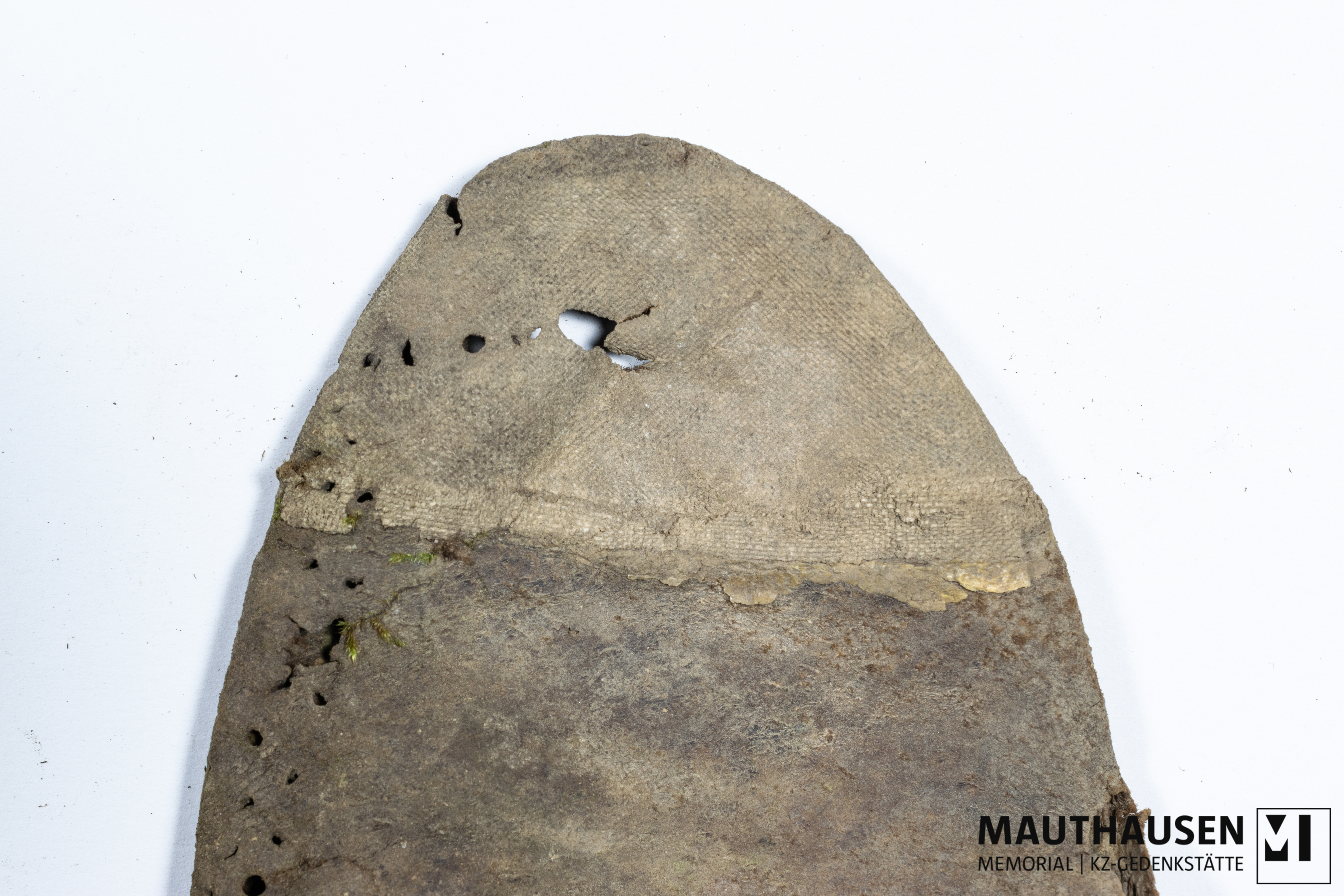 BeschreibungSchuhoberleder, Schuhkappe; deformiert; Farbe braun; Schuhkappe Außen mit Leinen versteift: Leinwandbindung, weiße Farbe; Nagellöcher; 1 Nagel erhalten; Nahtspuren