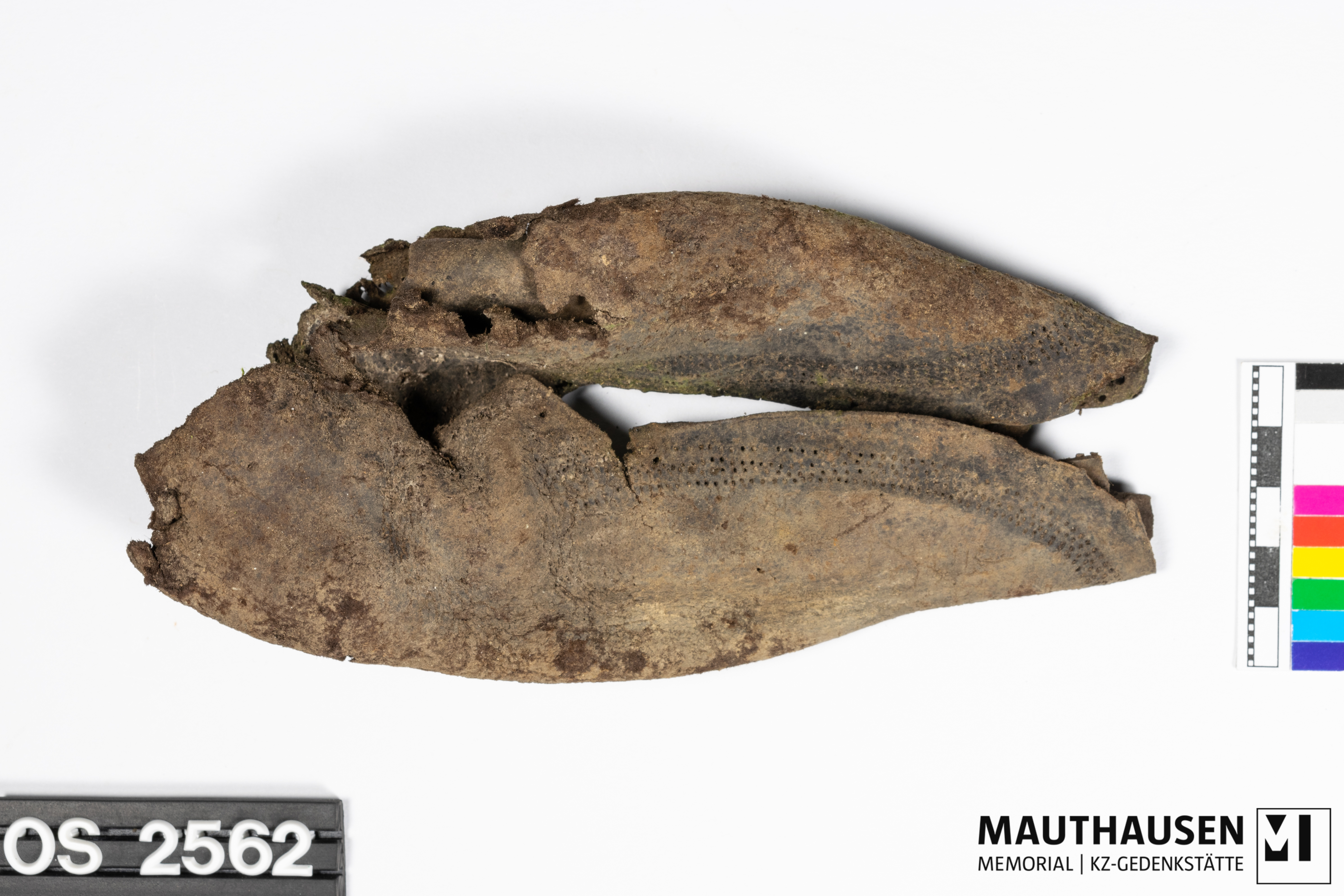 BeschreibungSchuhfragment/Schuhoberleder: Schuhkappe, Lederfutter, Rest von Brandsohle; deformiert; Farbe braun/schwarz; Nagellöcher; einzelne Metallnägel erhalten; Nahtspuren
