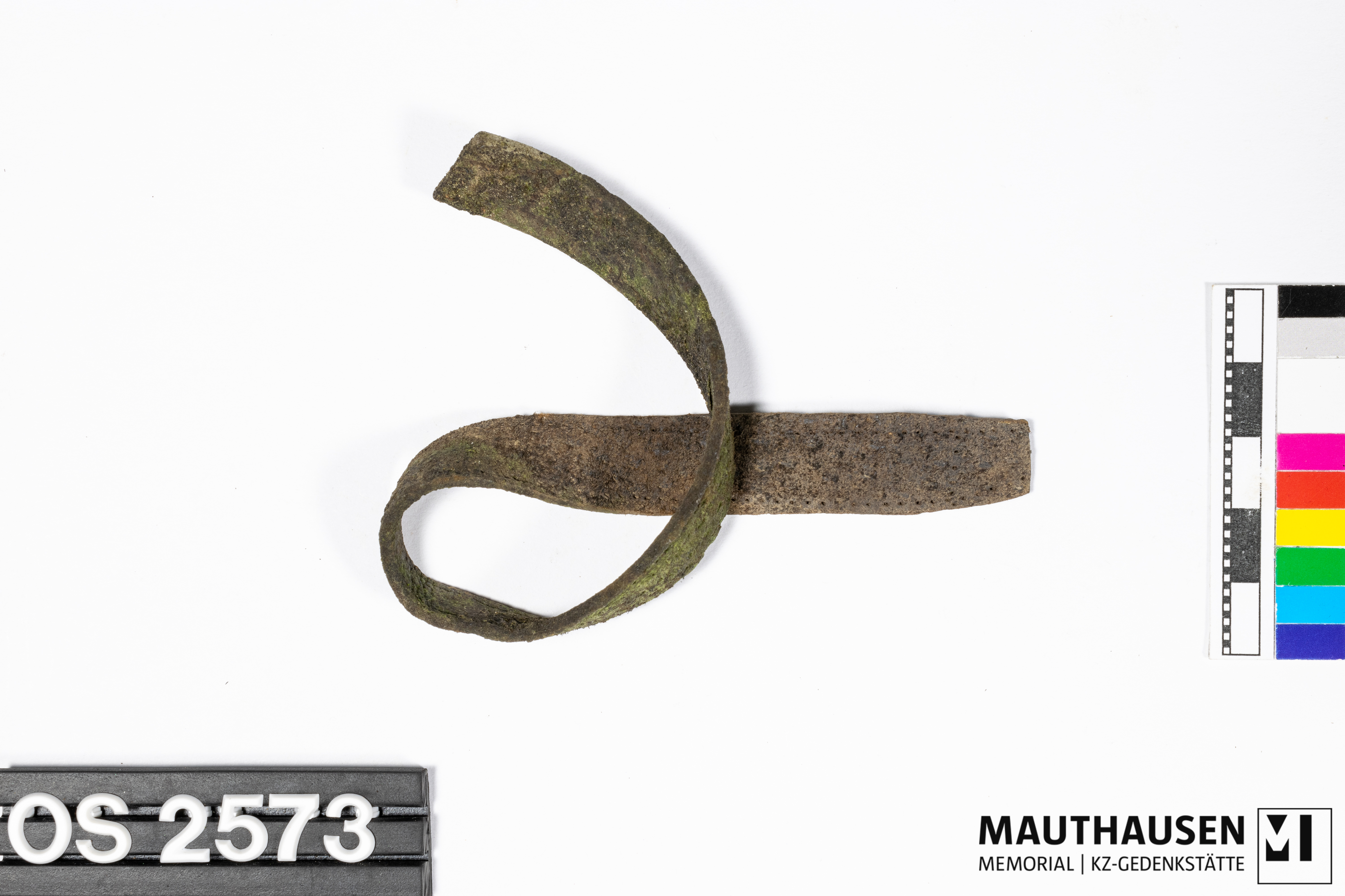 DescriptionGürtel/Riemen; deformiert; Frabe braun; gerade Abschluss an jedem Ende; Nahtspuren; Prägung am Riemen: "17"(?) oder "13"(?) oder "M"(?), daneben "68"(?) oder "63"(?) oder "83","86" oder "88" (?), nicht eindeutig lesbar