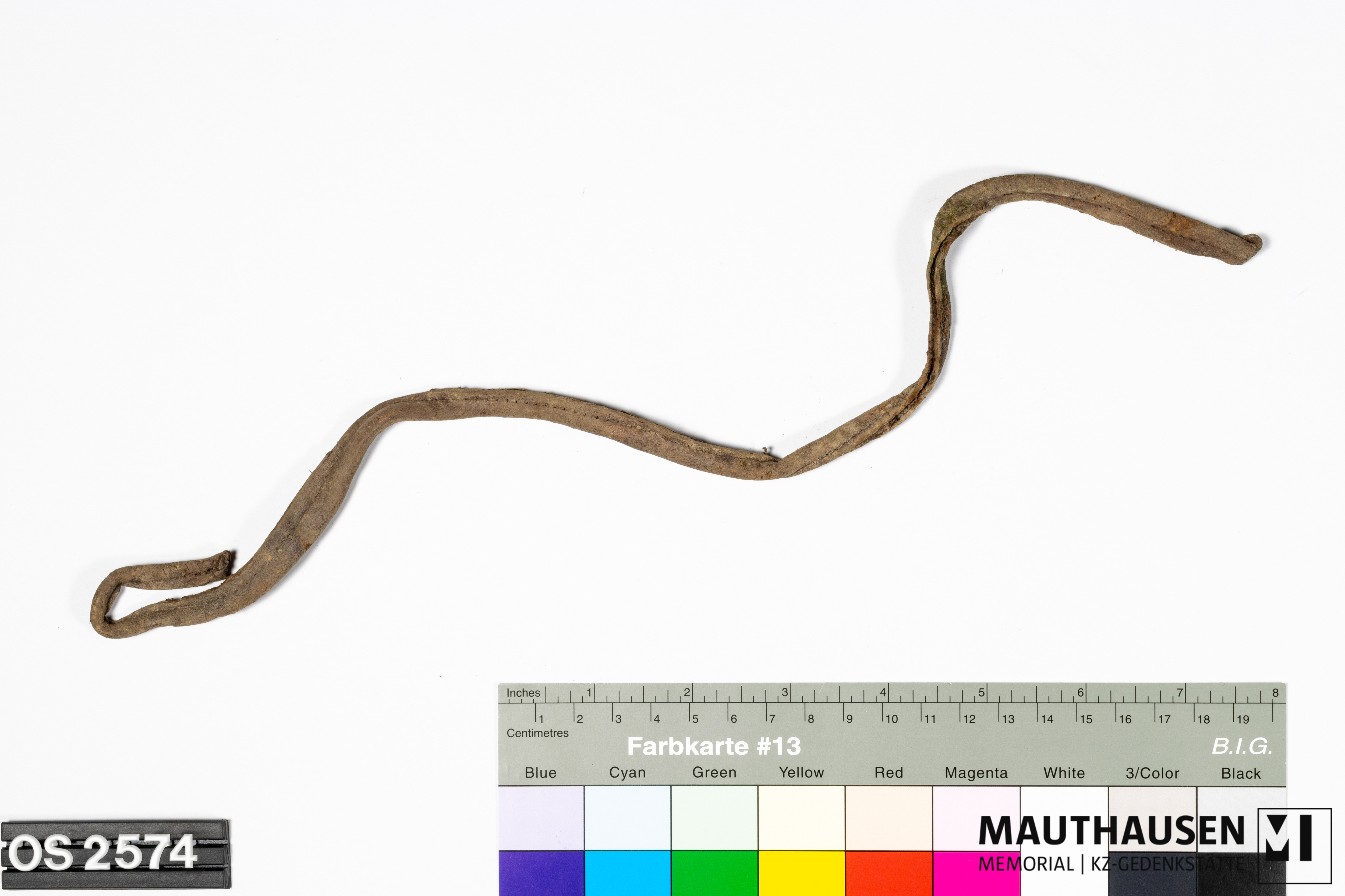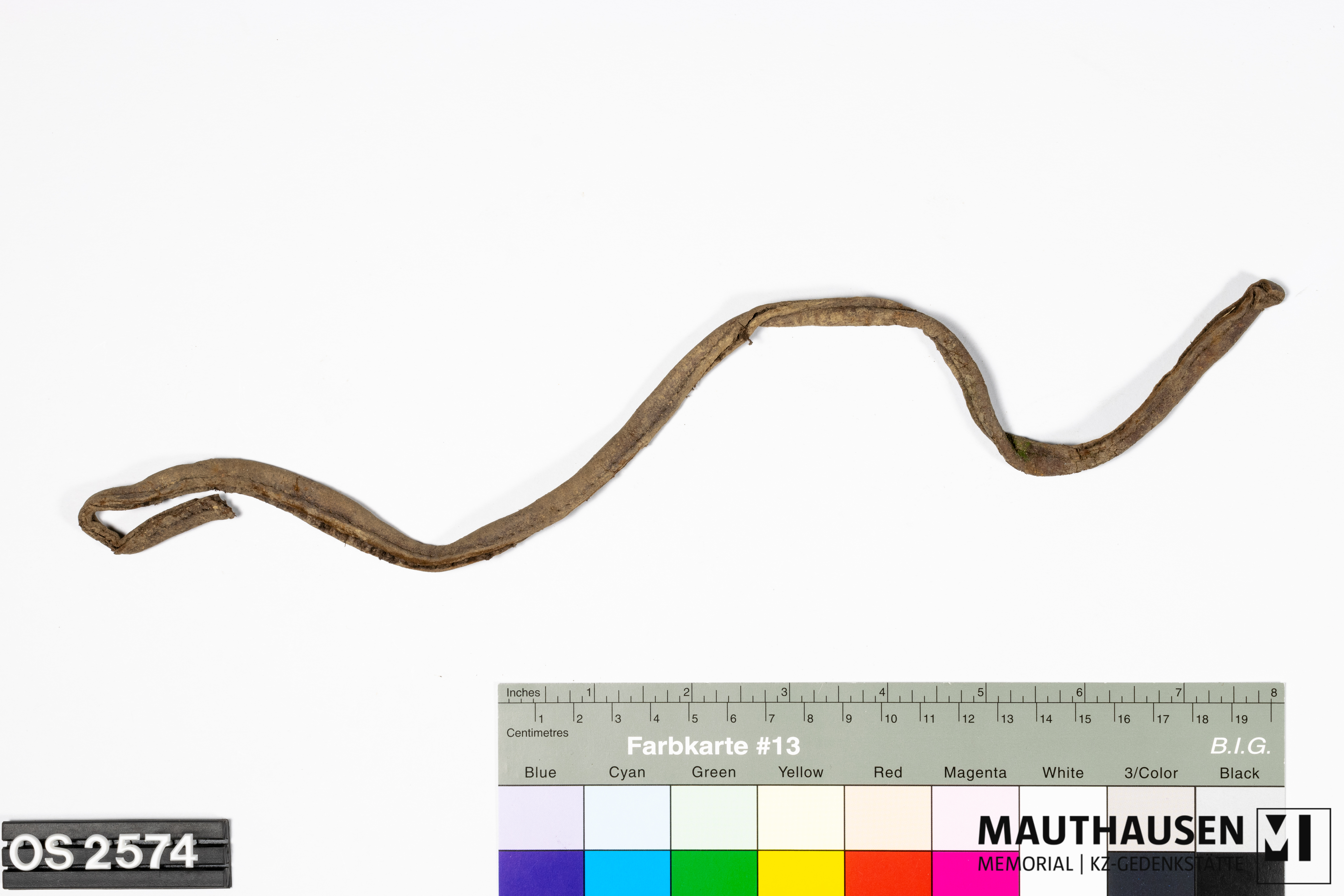 DescriptionGürtel/Riemen; Einfassband; deformiert; Farbe braun; Nahtspuren; Reste brauner Nähfaden