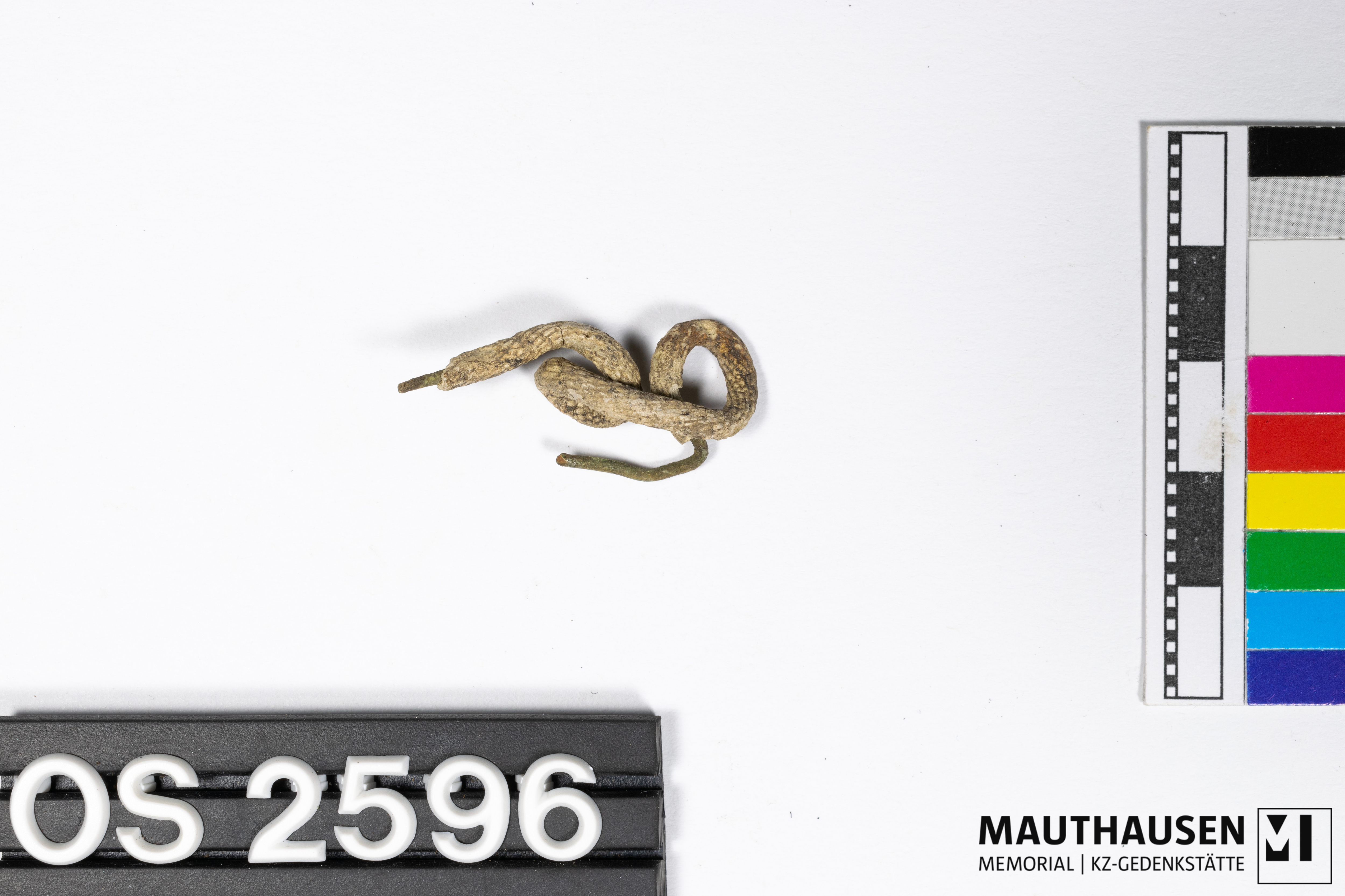 DescriptionKabel; Fragment; deformiert und zusammengeschlungen; Draht aus Metall (Kupfer?) ist mit weißem Textil umwickelt; je am Ende ist Draht ohne Textil
