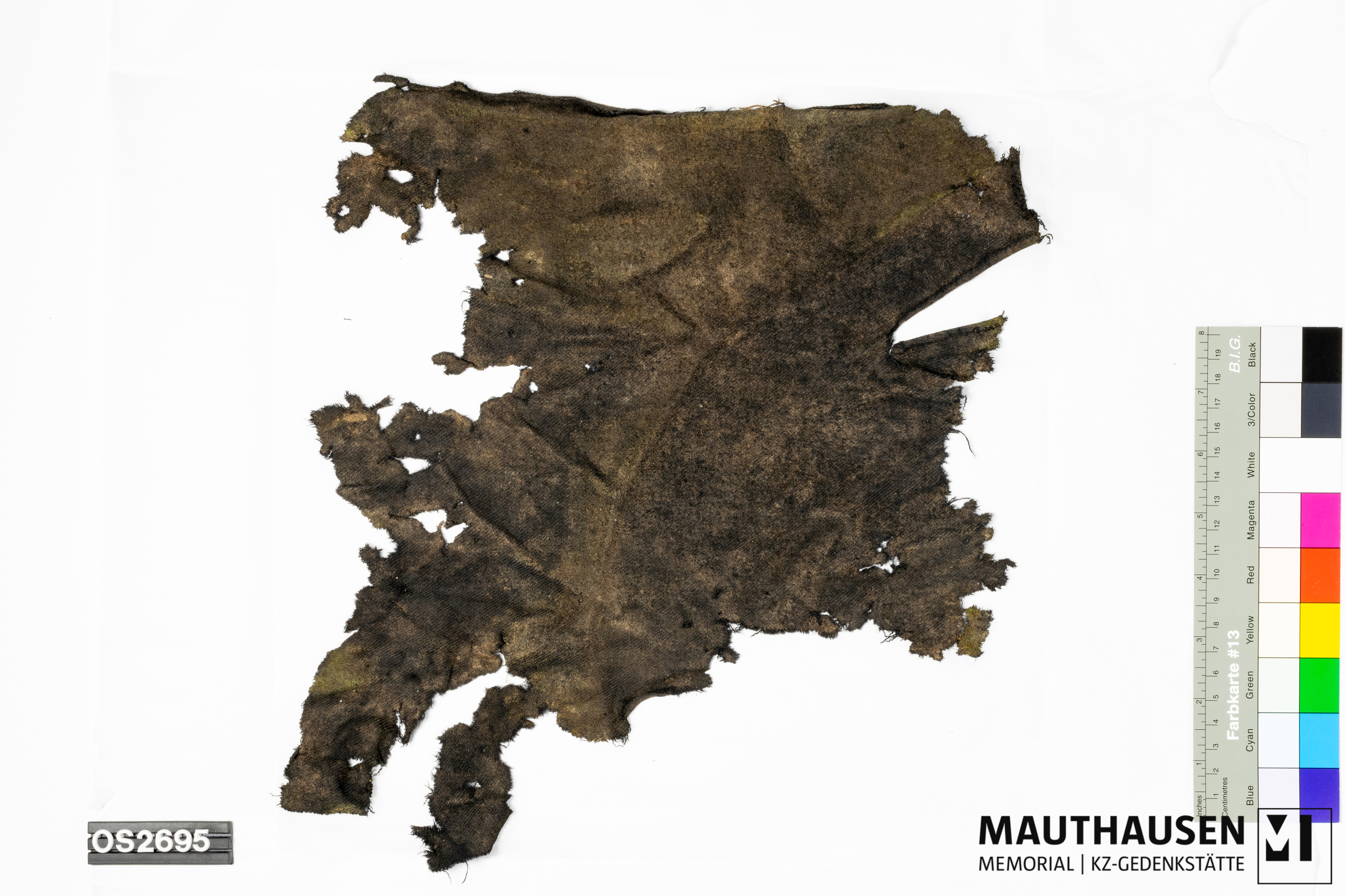 DescriptionHemd; großes Fragment; linkes Rückenteil: Naht, Abnäher; Oberstoff; Wolle; Bindung: Köper; Nahtspuren; Farbe braun-schwarz; Nähfadenrest braun