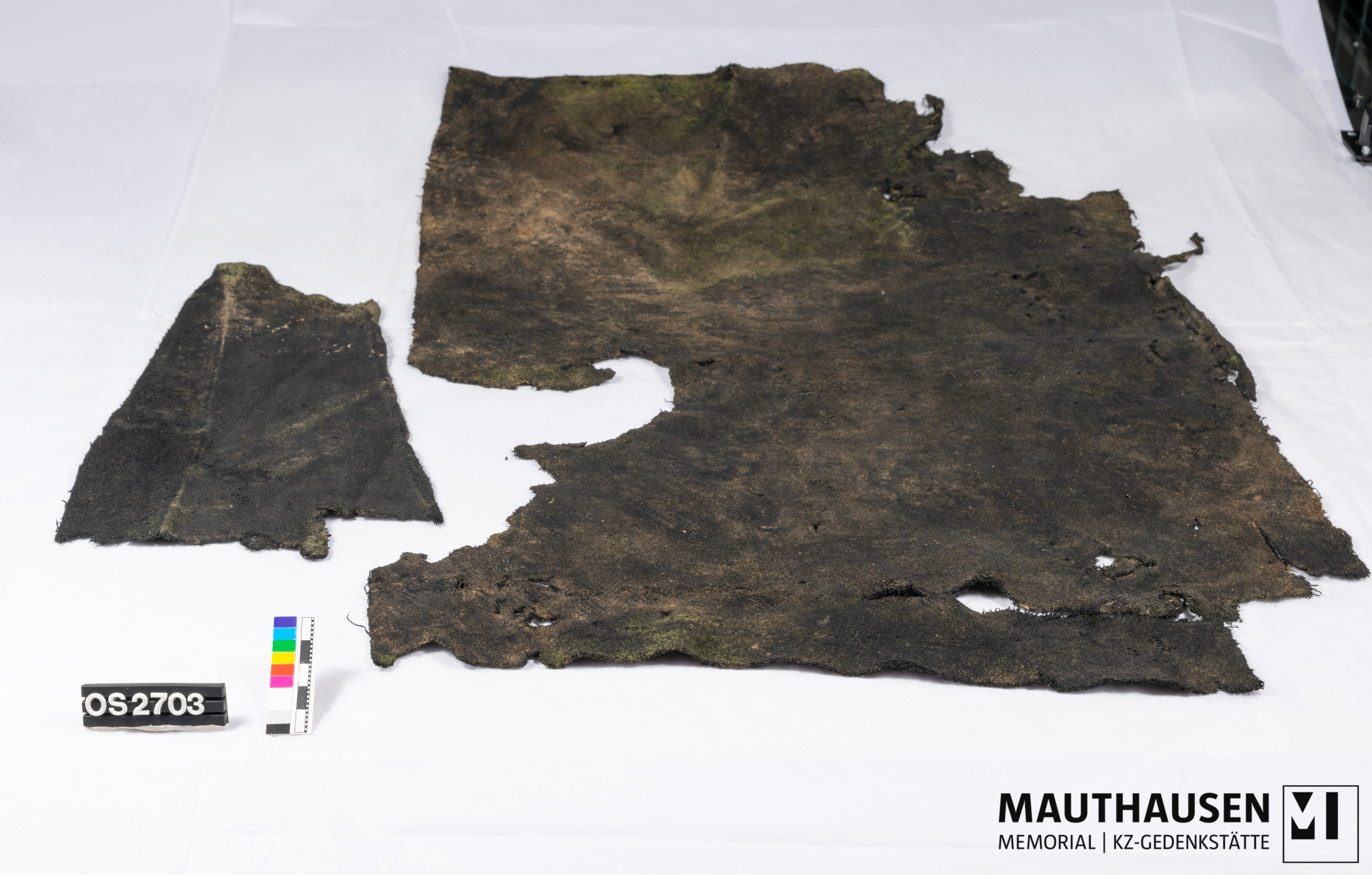 DescriptionMantel; 2 Fragmente; Teilung OS-Nr. in a und b; OS2703a: großes Fragment; Oberstoff; Wolle; Bindung: Doppelgewebe; Ausrüstung: geraut; Nahtspuren; Farbe dunkelbraun-schwarz; mehrere Einschnitte; OS2703b: kleineres längliches Fragment; Oberstoff; Wolle; Bindung: Doppelgewebe; Ausrüstung: geraut; Nahtspuren; Farbe dunkelbraun-schwarz; Falte in Längsrichtung über ganzen Stoff; halbkreisförmiger Ausschnitt
