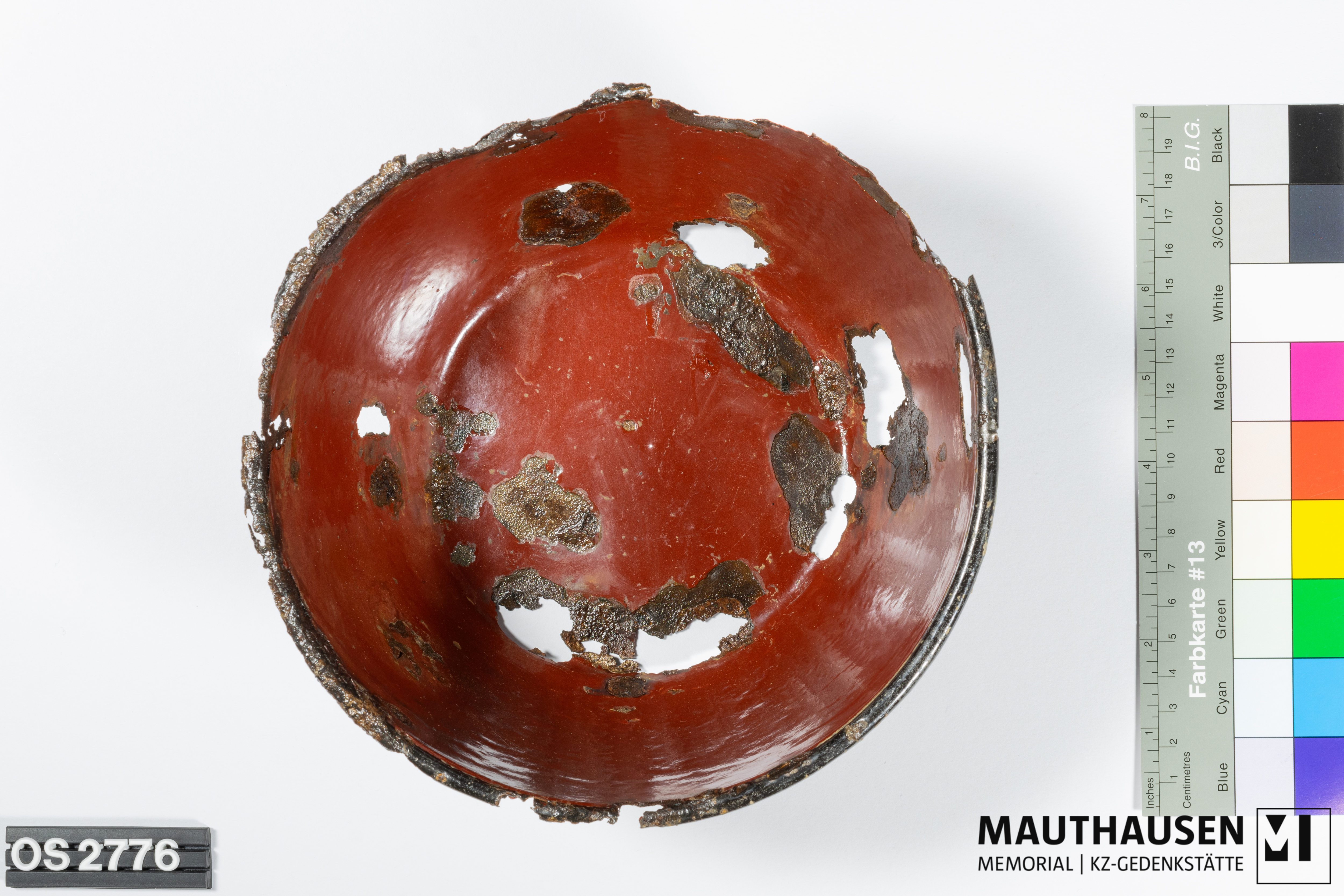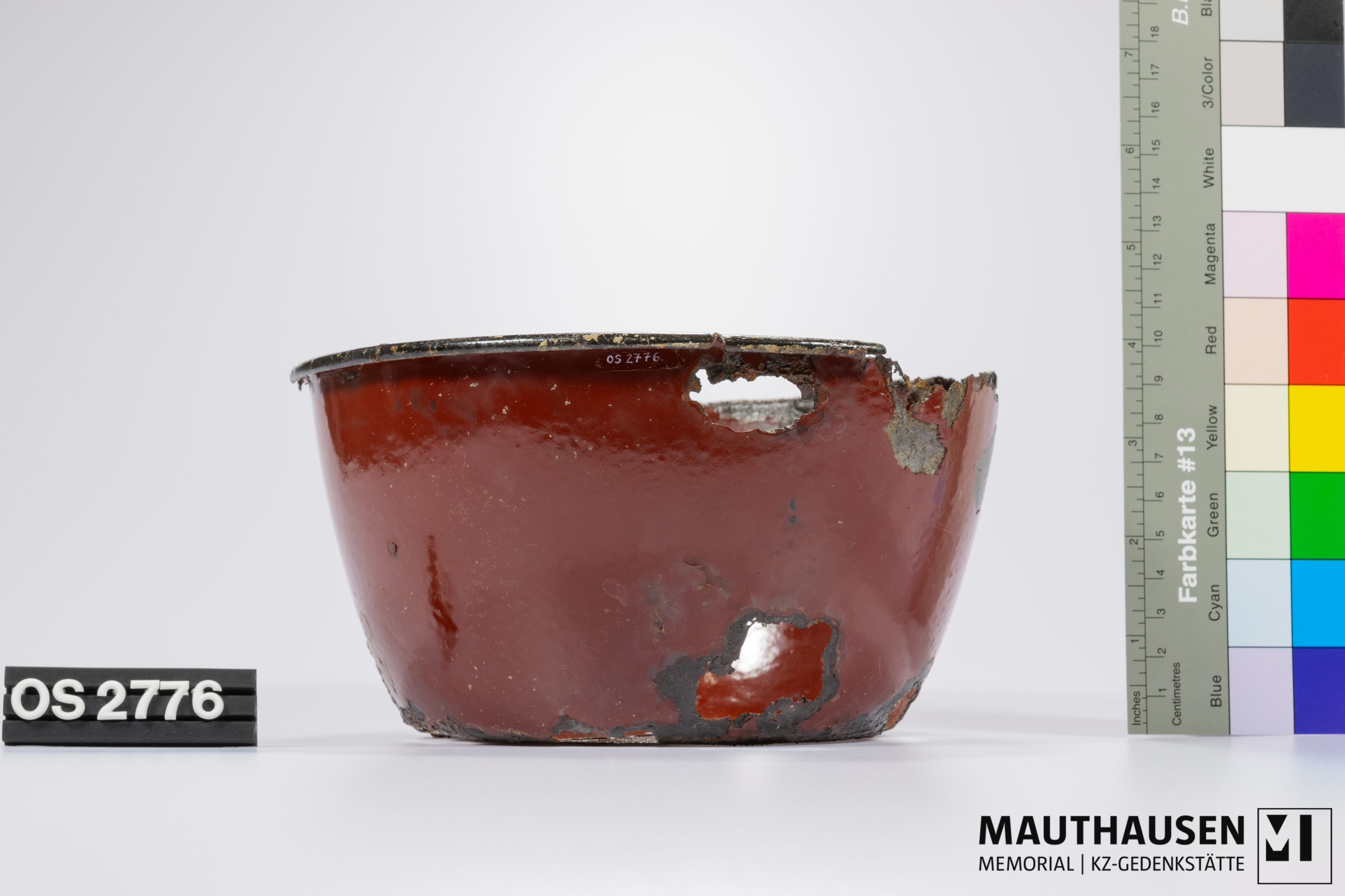 DescriptionTopf; roter Emailüberzug innen und außen; Rand nach außen gewölbt, leicht abstehend; Löcher im Boden und den Seitenwänden des Topfs durch Korrosion; oberer Rand aufgrund von Korrosion unvollständig; Email an der Außenseite abgeplatzt, Eisen sichtbar; am unteren Boden mittig weißer Stempel "18", leicht erhaben