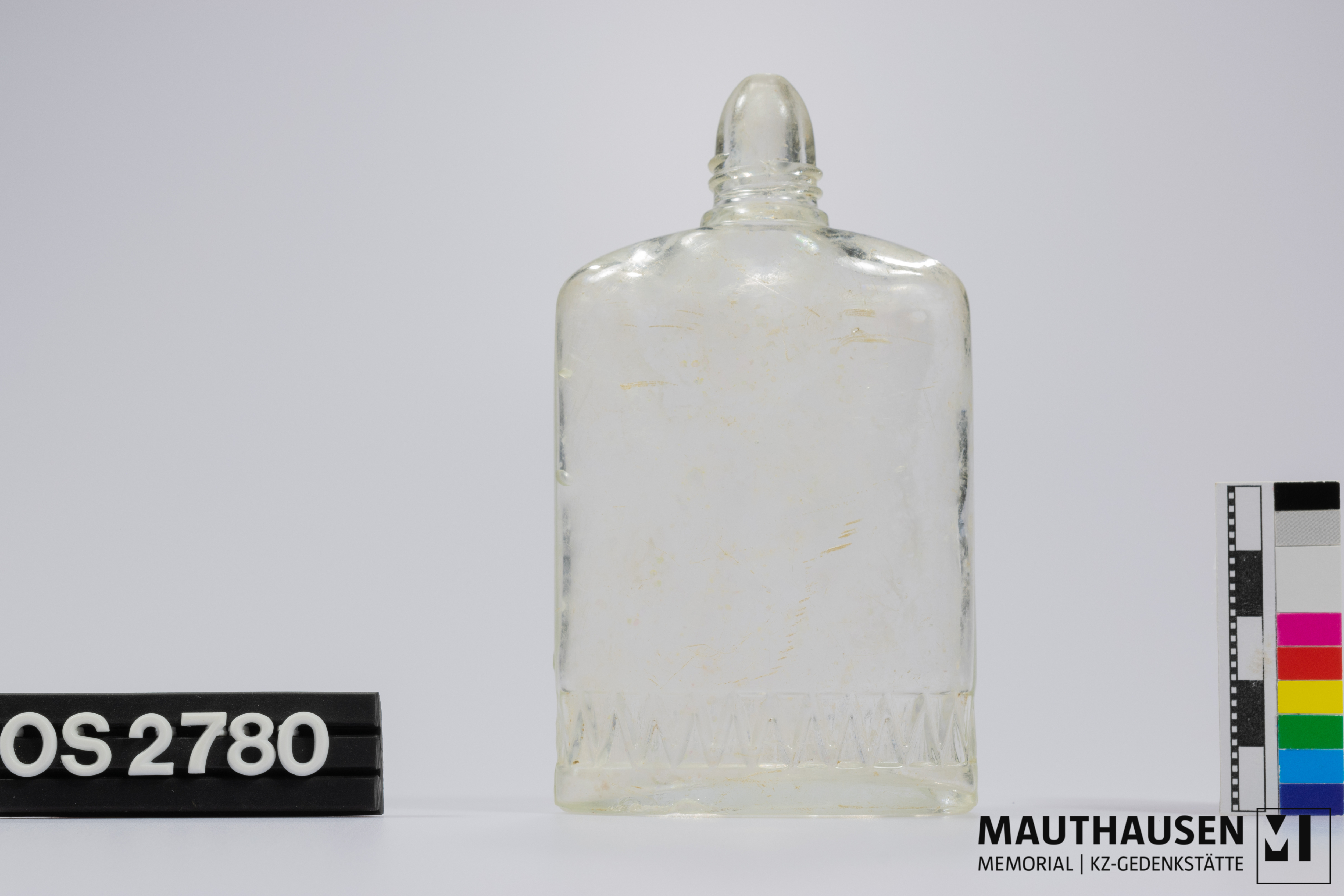 DescriptionFlasche aus durchsichtigem Weißglas; elipsenförmig; Zackenmuster am unteren Rand der Flasche ummantelt diese; Gewinde am Flaschenhals; die Flasche ist so konziepiert, dass die darin enthaltene Flüssigkeit nur tröpfchenweise entweichen kann; Durchmesser der Öffnung: 4mm; erhabene Prägung mittig am Boden; "W", darüber ein "V", an dessen Enden jeweils ein Adler-/ bzw. Wolfskopf angebracht ist