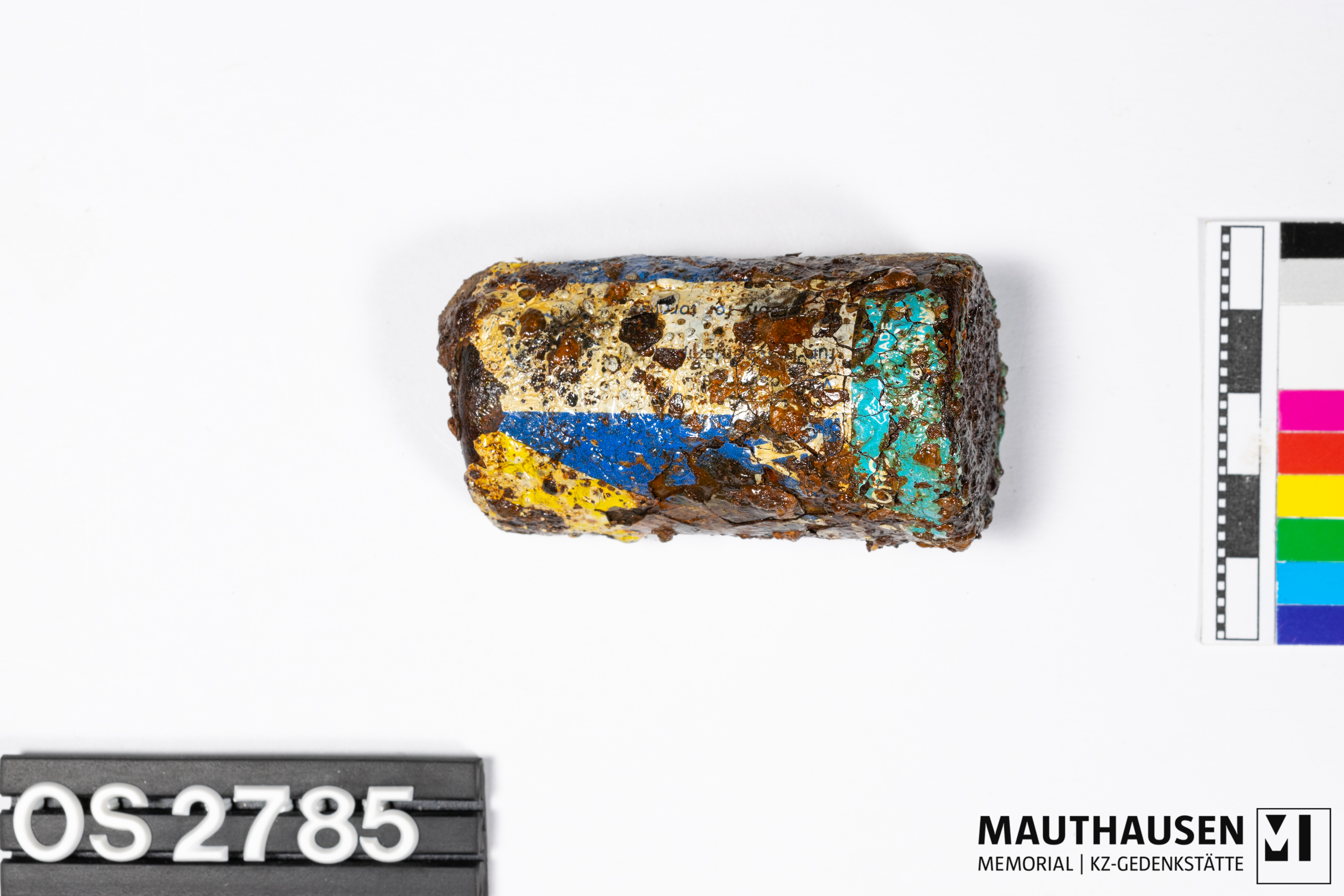 DescriptionBatterie aus Zink und Kohle; fragmentarisch; Mittig Metallstab mit 8mm Durchmesser sichtbar; feste Füllung der Batterie und Wandschichten des Fragments freigelegt; Außenhülse mit bunten Farbabschnitten versehen: Weiß, Dunkelblau, Türkis, Gelb; Logo der Herstellerfirma Varta ersichtlich (gelbes Dreieck auf dunkelblauem Grund), Schriftzug "Varta" darunter lesbar; Logo wiederholt sich nach weißem Zwischenfeld, auf dem "preferably for torch" lesbar ist; ein ca. 11mm breiter Rand an den Boden der Batterie grenzend weißt türkise Farbe mit weißer Schrift auf: "Made in Germany", "1,5V", "22 Mono"; am Boden der Batterie ist mittig ein kleiner Kreis mit einem Durchmesser von 12mm erkennbar; dieser markiert den Sitz des Metallstabs;