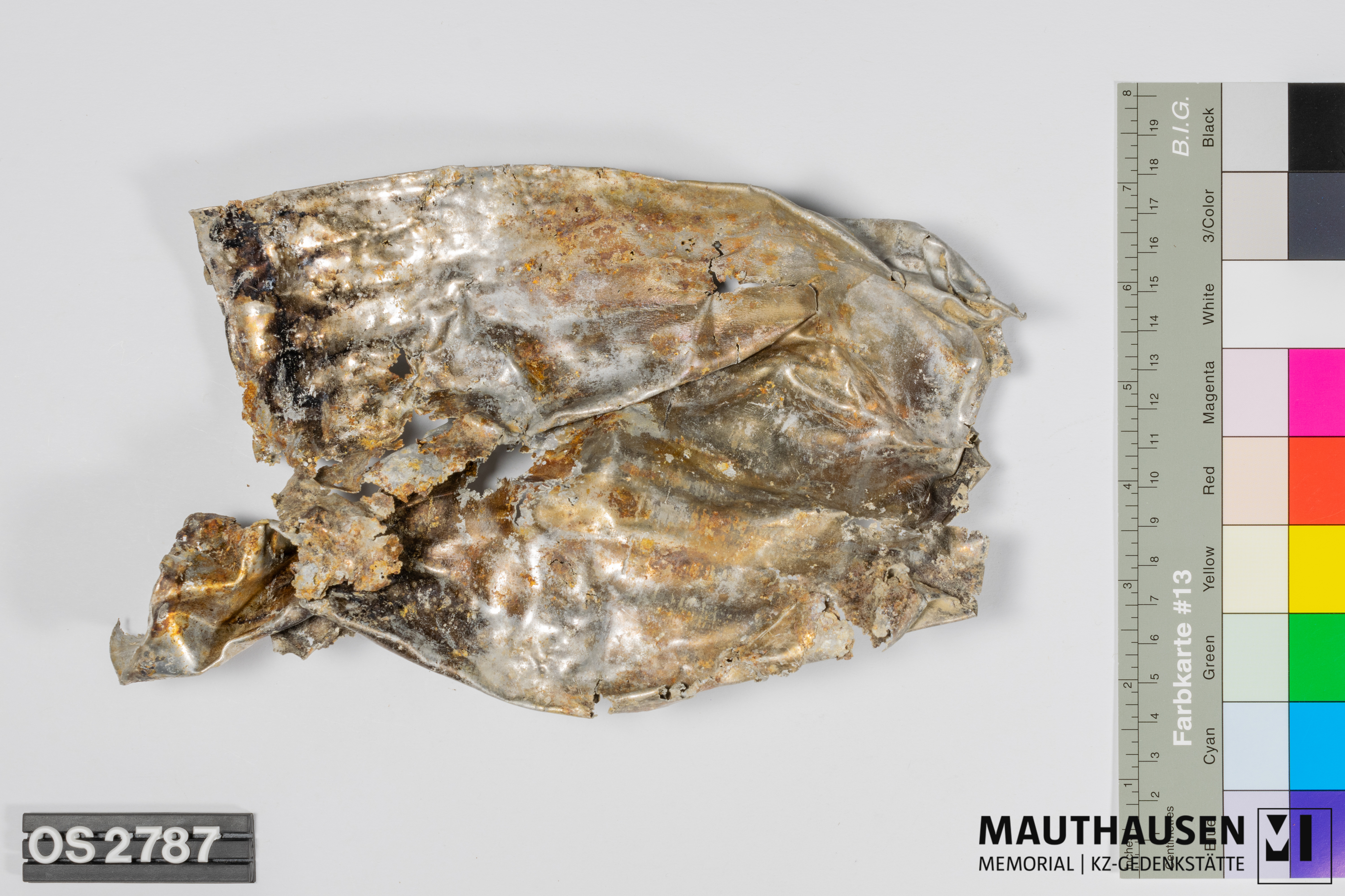 DescriptionFeldgeschirr, Fragment; Rand mit umgebogener Verdickung auf einer Seite erhalten; ausgefranste Elemente am gegenüberliegenden Ende; durch Korrosion entstandene Löcher im Aluminium, brüchige Falzkante;