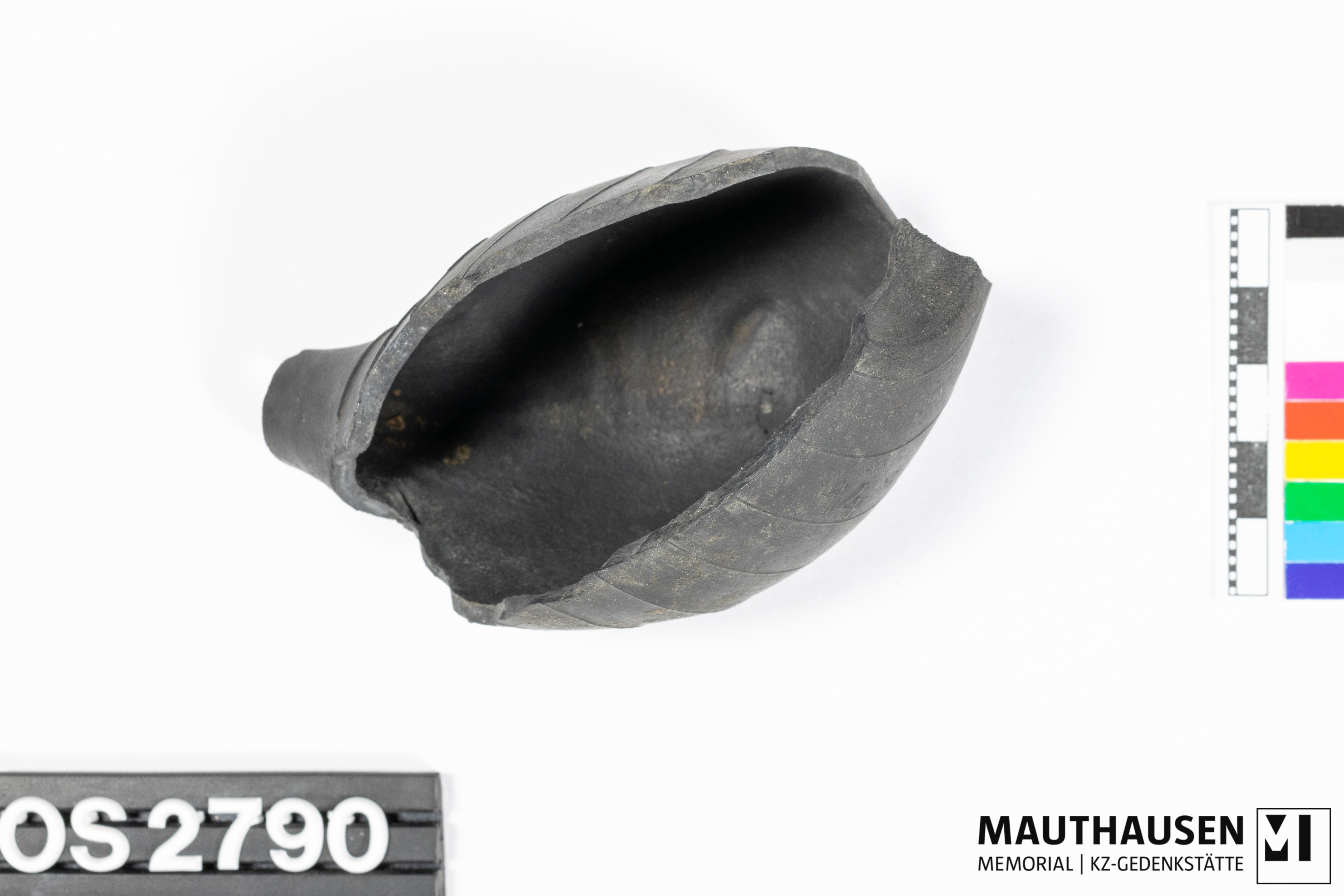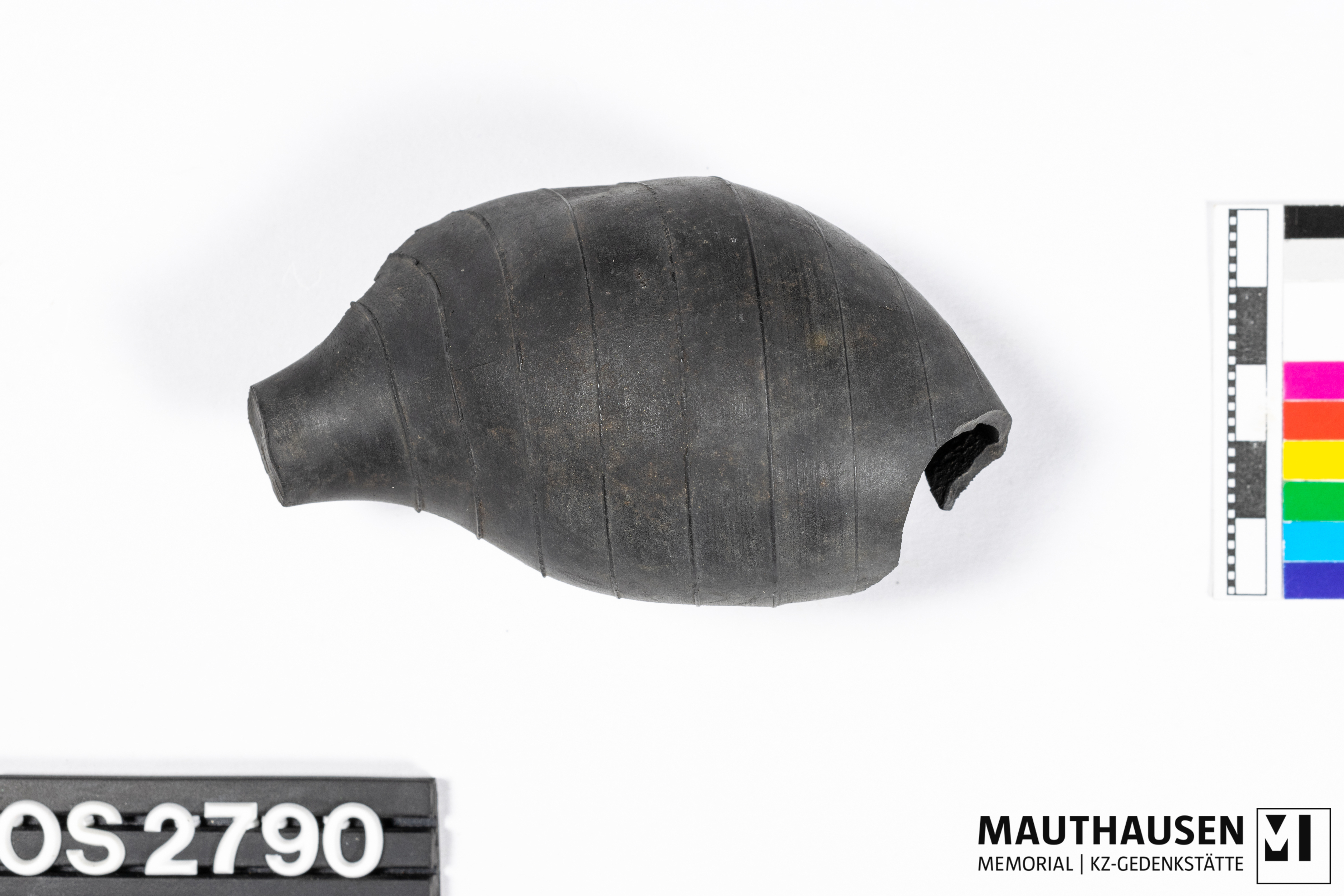 DescriptionPumpball, aus schwarzem Gummi, Dicke: 3mm; fragmentiert; oval; erhabene konzentrische Kreise auf Außenseite erkennbar; schmaler Zulauf an einem Ende (Saug-Pump-Öffnung), Loch in der Mitte, Durchmesser: 4mm, Vergrößerung des Lochs auf 6,5mm, auf einer Seite gelöster Gummirand des ursprünglichen Lochs sichtbar; Prägung "14" auf Außenseite, zwischen konzentrischen Kreisen;