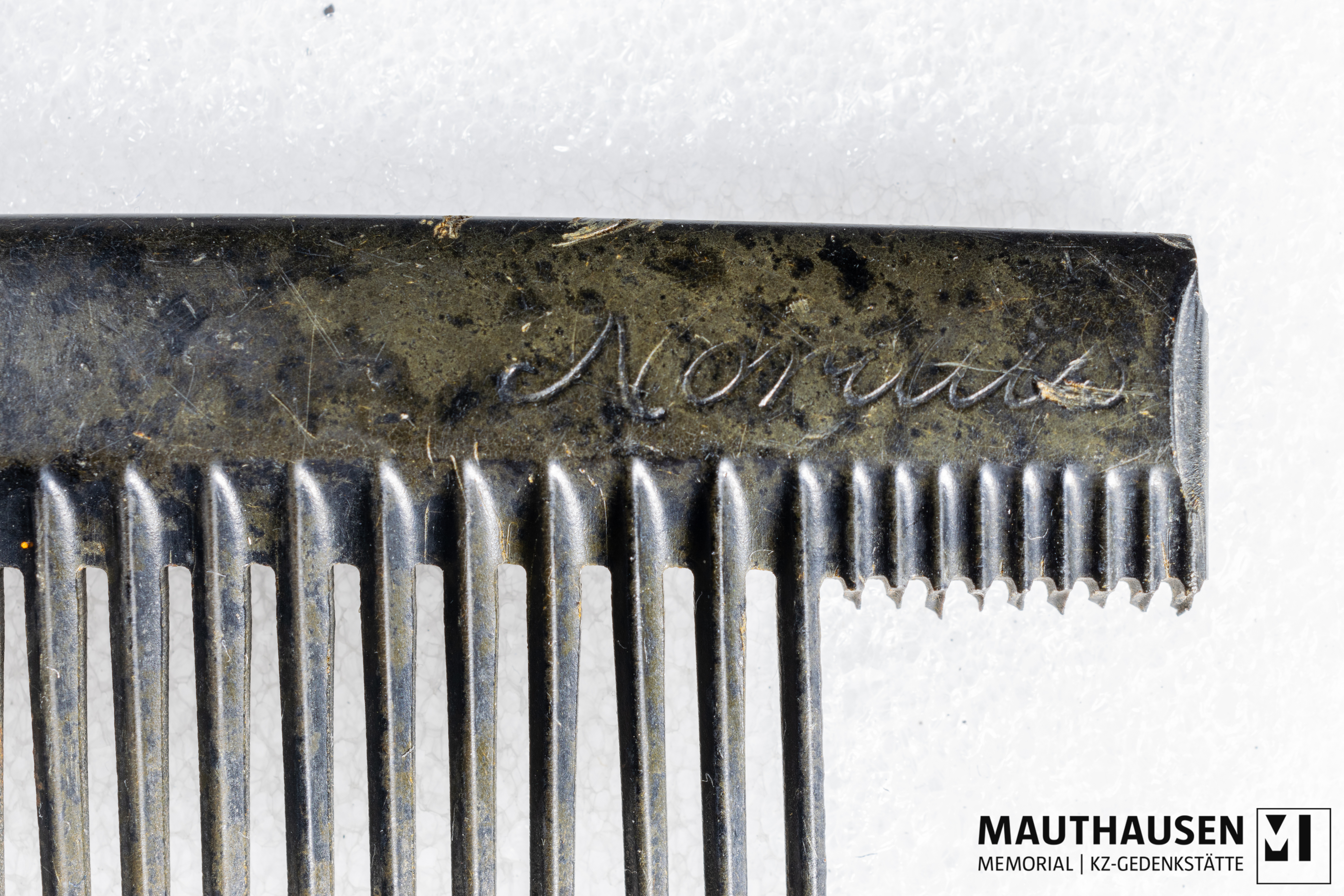 DescriptionKamm; schwarzer Kunststoff; 23 dickere Kammzähne erhalten, einer direkt am Rand abgebrochen; 9 dünnere, direkt am Rand abgebroche Kammzähne; fragmentiert, Rest des Kamms ist abgebrochen; Aufdruck auf verdickter Oberseite des Kamms: "Nordus" oder "Noraus"