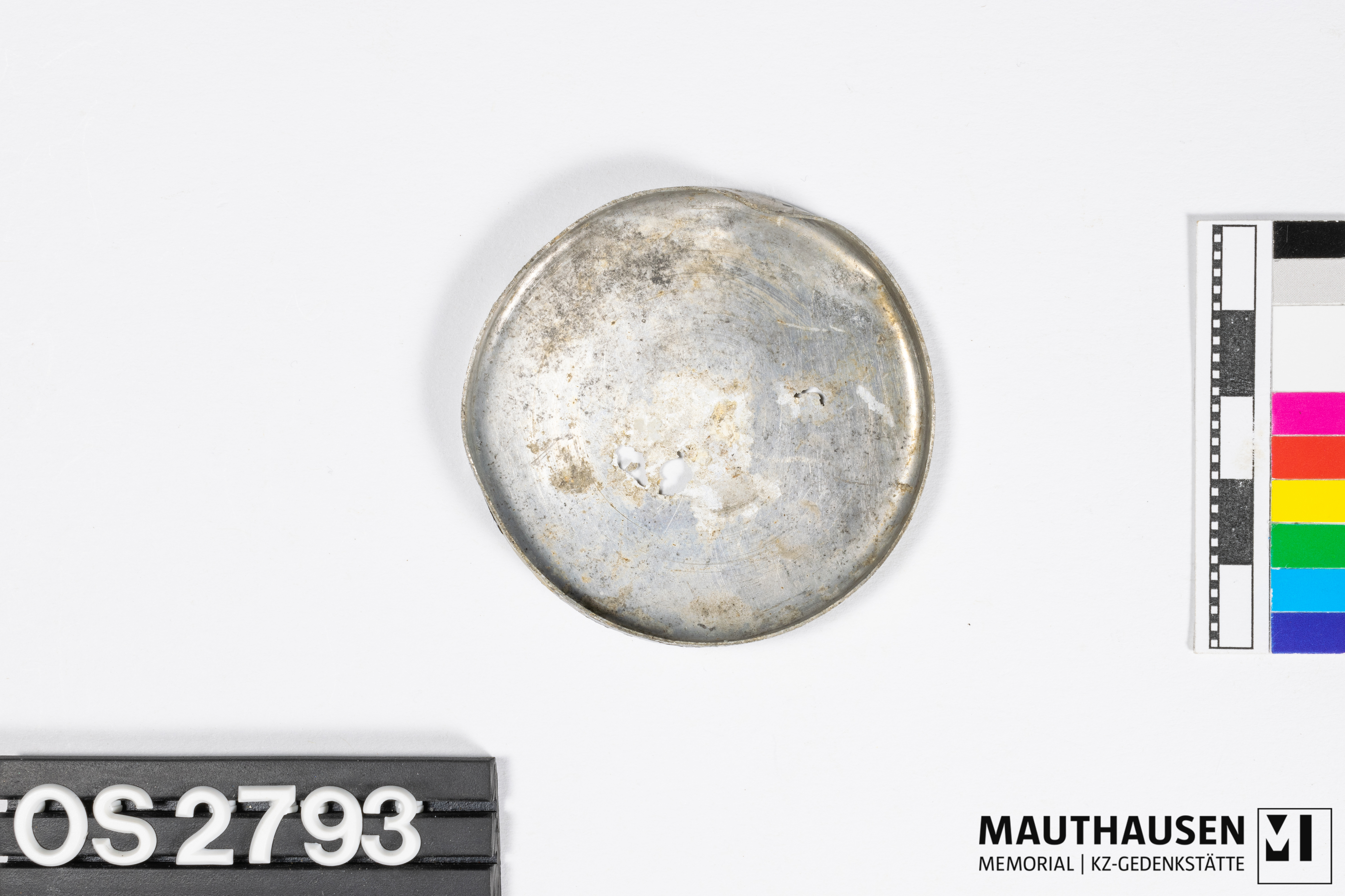 DescriptionDeckel einer Dose; silber; leichte Deformierung am äußeren Rand; 3 Löcher in Boden durch Korrosion; 6mm hoch aufgebogener Rand; fragmentarisch schwarze Farbreste auf der Außenseite des Deckels;