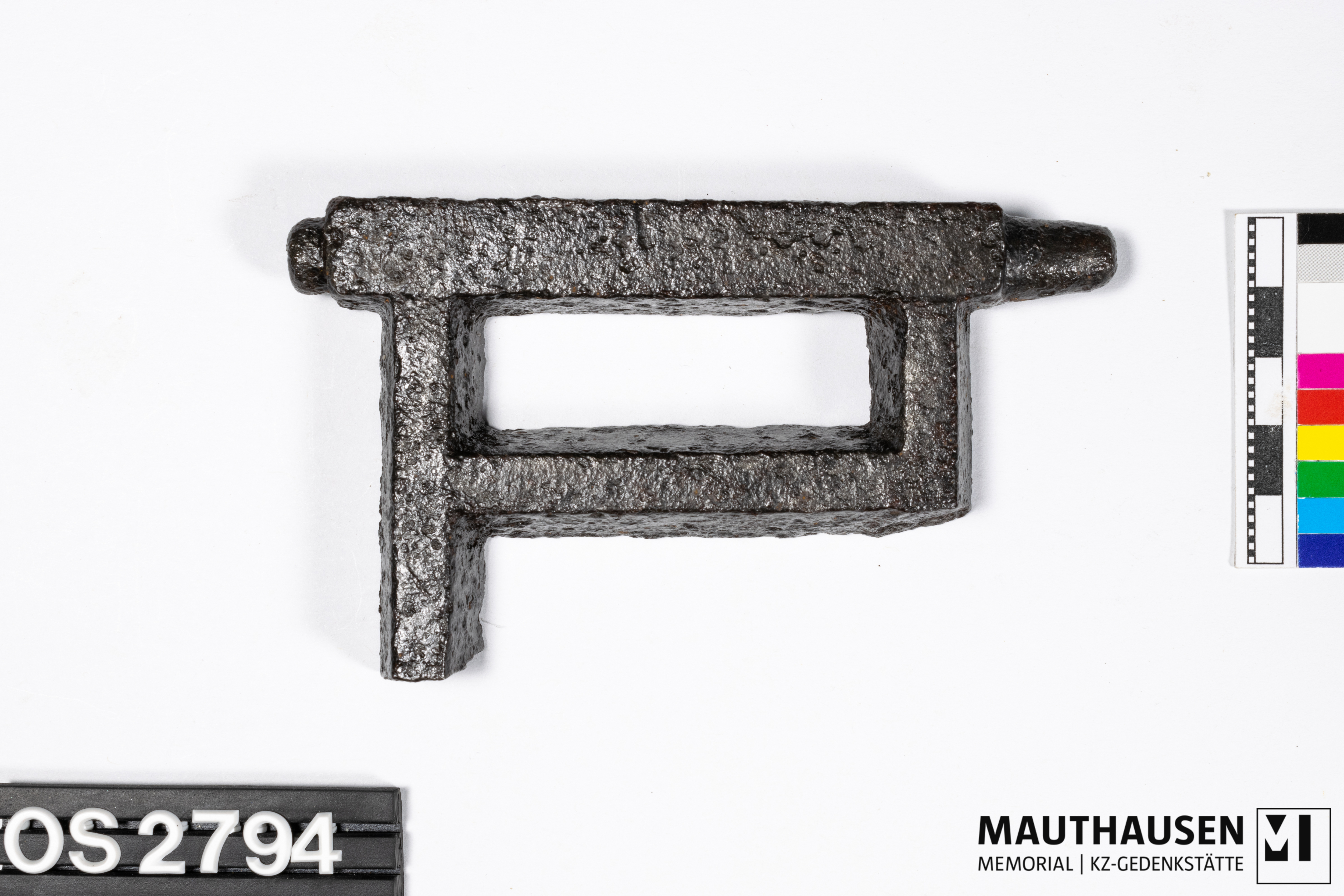 DescriptionGriff, fragmentiert; zwei parallel verlaufende Geraden mit 22mm Abstand; verbunden durch zwei senkrecht parallel verlaufende Geraden, Abstand zwischen Geraden: 63mm; linke senkrechte Gerade (vom Objekt aus gesehen) 53mm lang, abgebrochen; rechte Gerade 29mm lang; Geraden weisen abgeschrägte Kanten auf; nur untere horizontale Gerade quadratisch (l=b=14mm); Bolzen durch quadratische Gerade; links rundes Bolzenende erkennbar, rechts langes, spitz zulaufendes Ende, Durchmesser Spitze: 6mm;