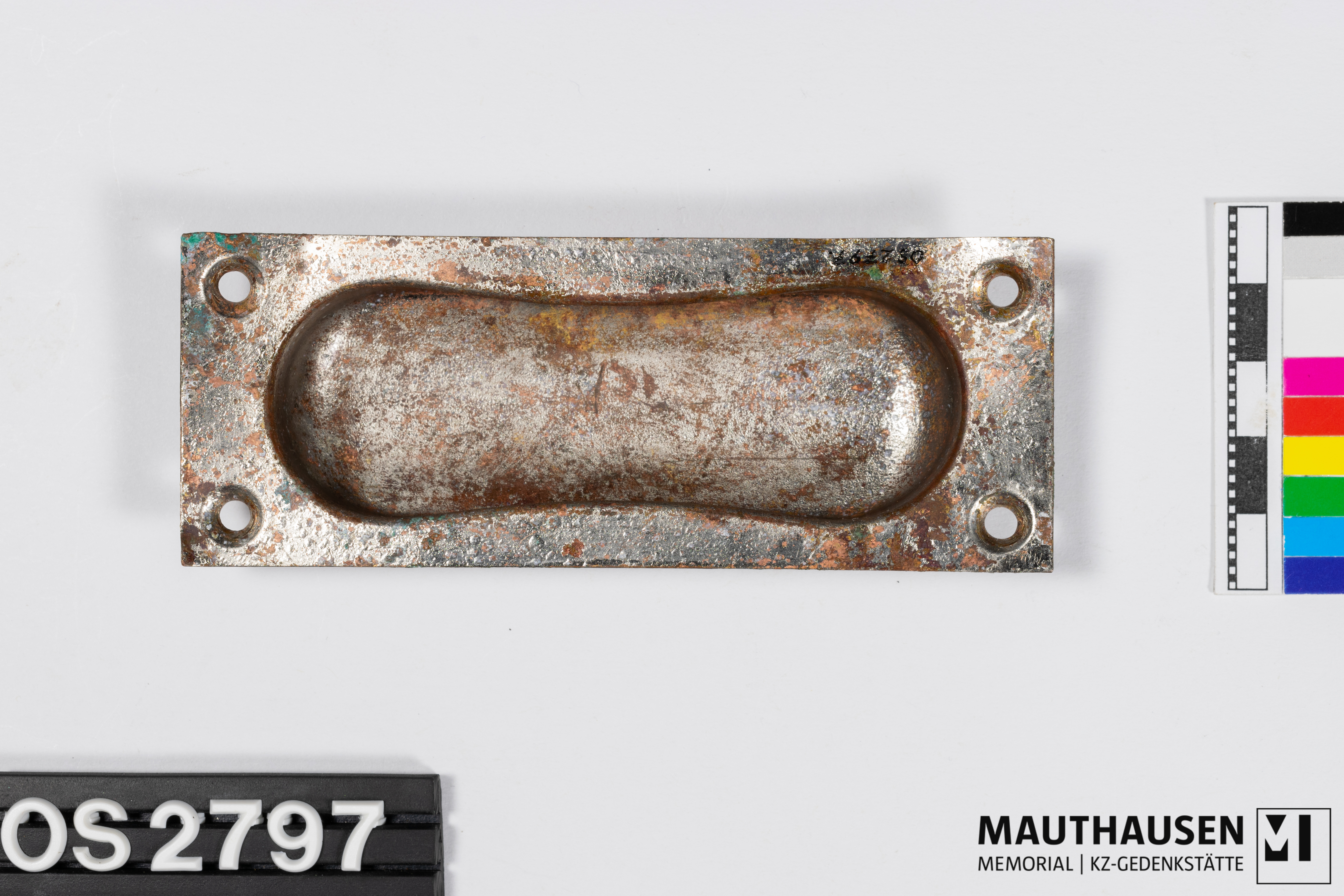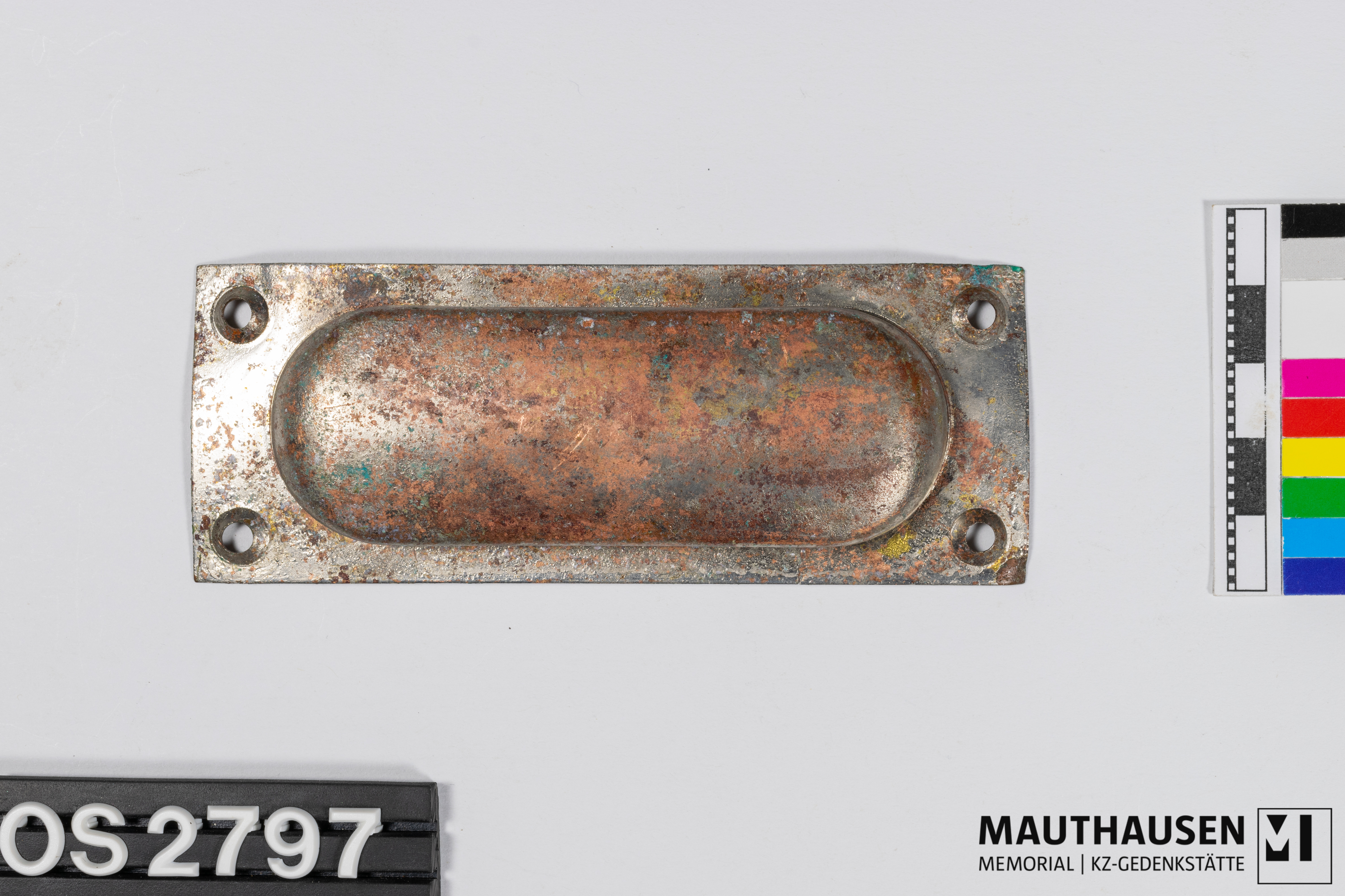 DescriptionGriff; rechteckige Kupferplatte mit einem nach außen gebohrtem Loch in jedem Eck; Ecken leicht verbogen; längliche nach außen gewölbte Erhöhung auf der Außenseite mit abgerundeten Ecken, Vertiefung auf der Innenseite; 90mm lang, 32mm breit;