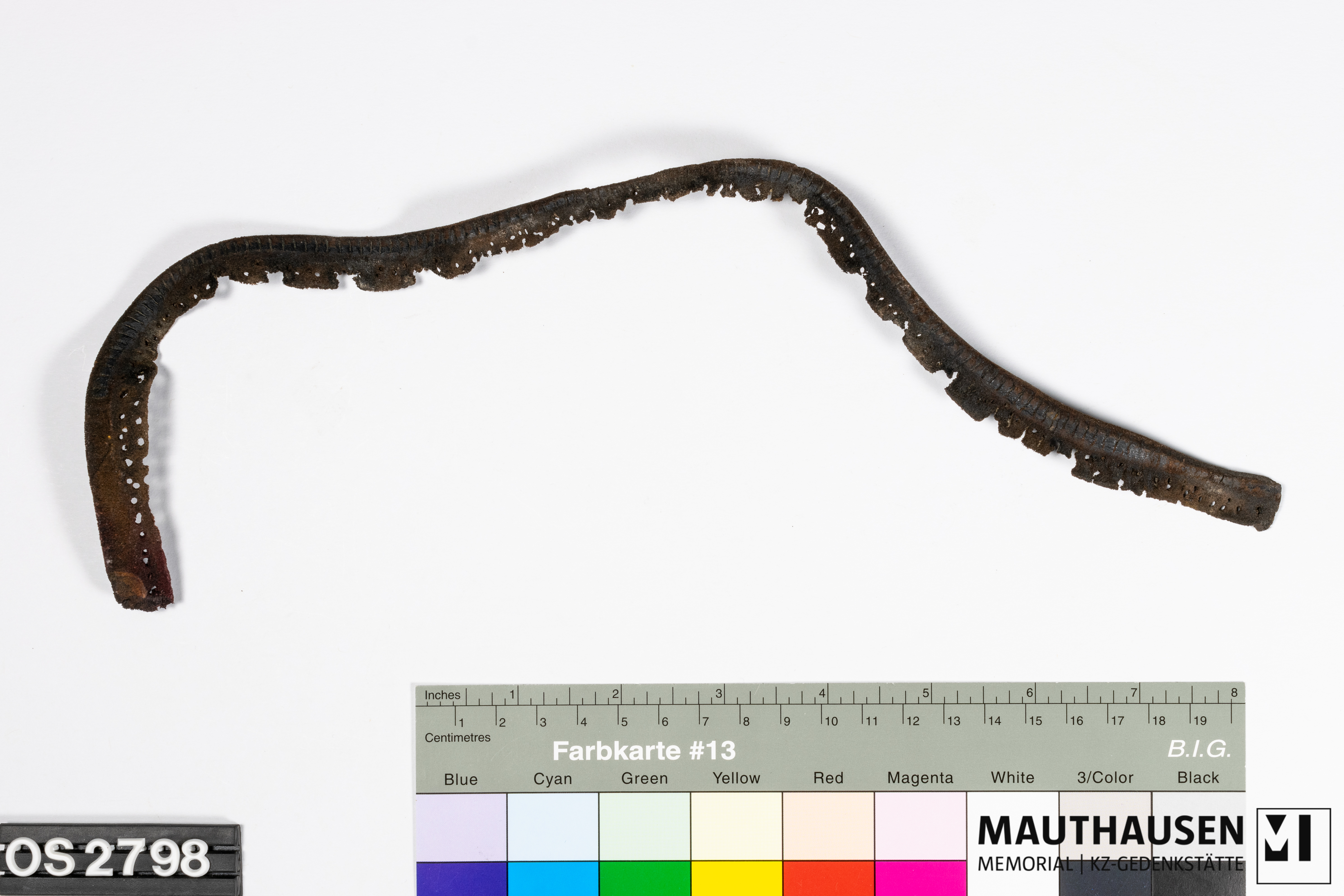 Band, verbogen; braunes Leder mit Rotpigmenten; ein- bis zweireihige Nahtlöcher; oberes Ende ausgefranst; einseitig geprägte Striche unter Nahtlöchern; senkrecht, 3mm Abstand zwischen Strichen; Breite des Bands inkl. erhaltene Nahtlöcher: 1,5mm; beide Enden abgebrochen; ein abgebrochenes, spitz zulaufendes Ende erhalten, 18mm lang;