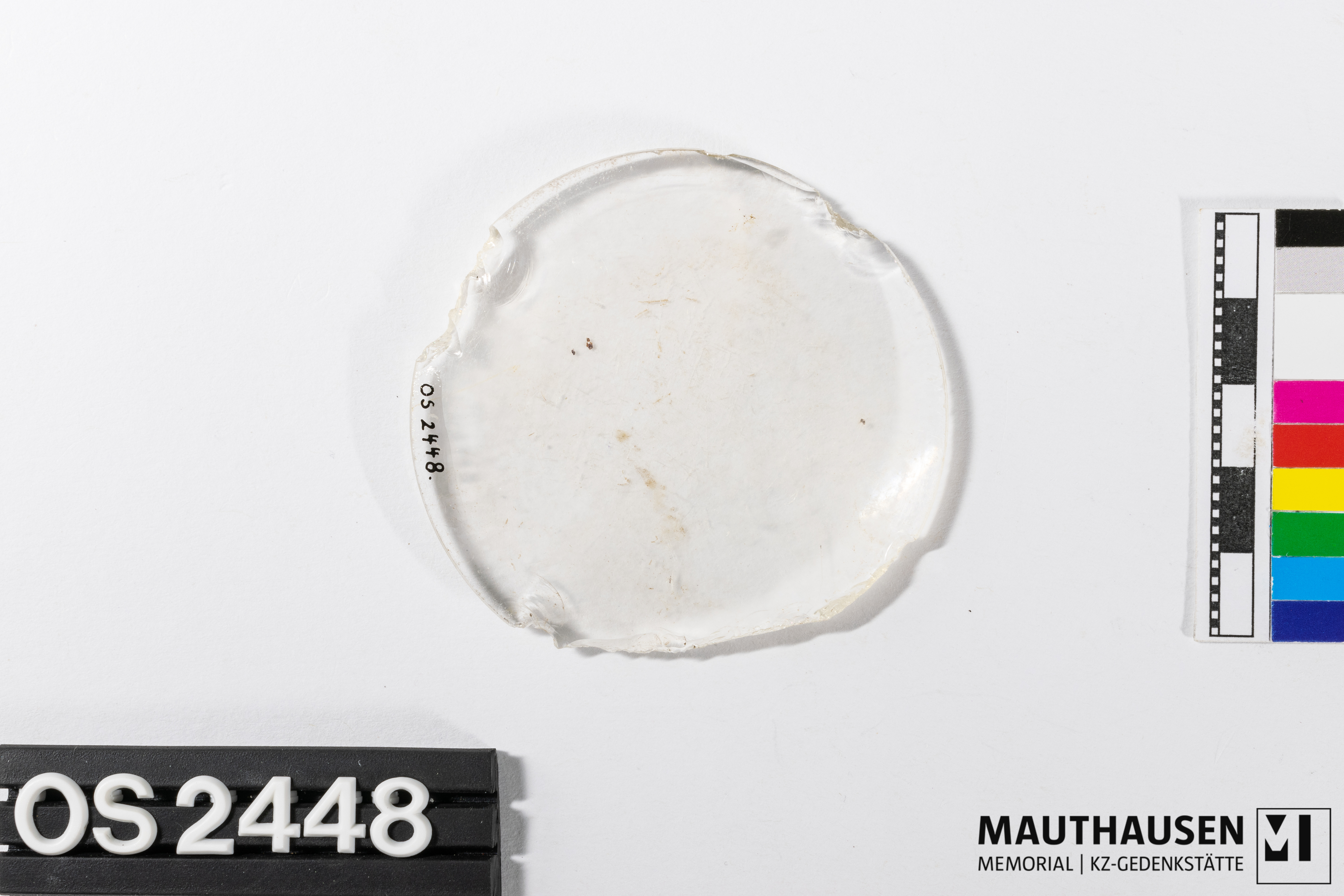 DescriptionGlas; rund, konvex geformt; Weißglas; Rand teilweise abgeschlagen