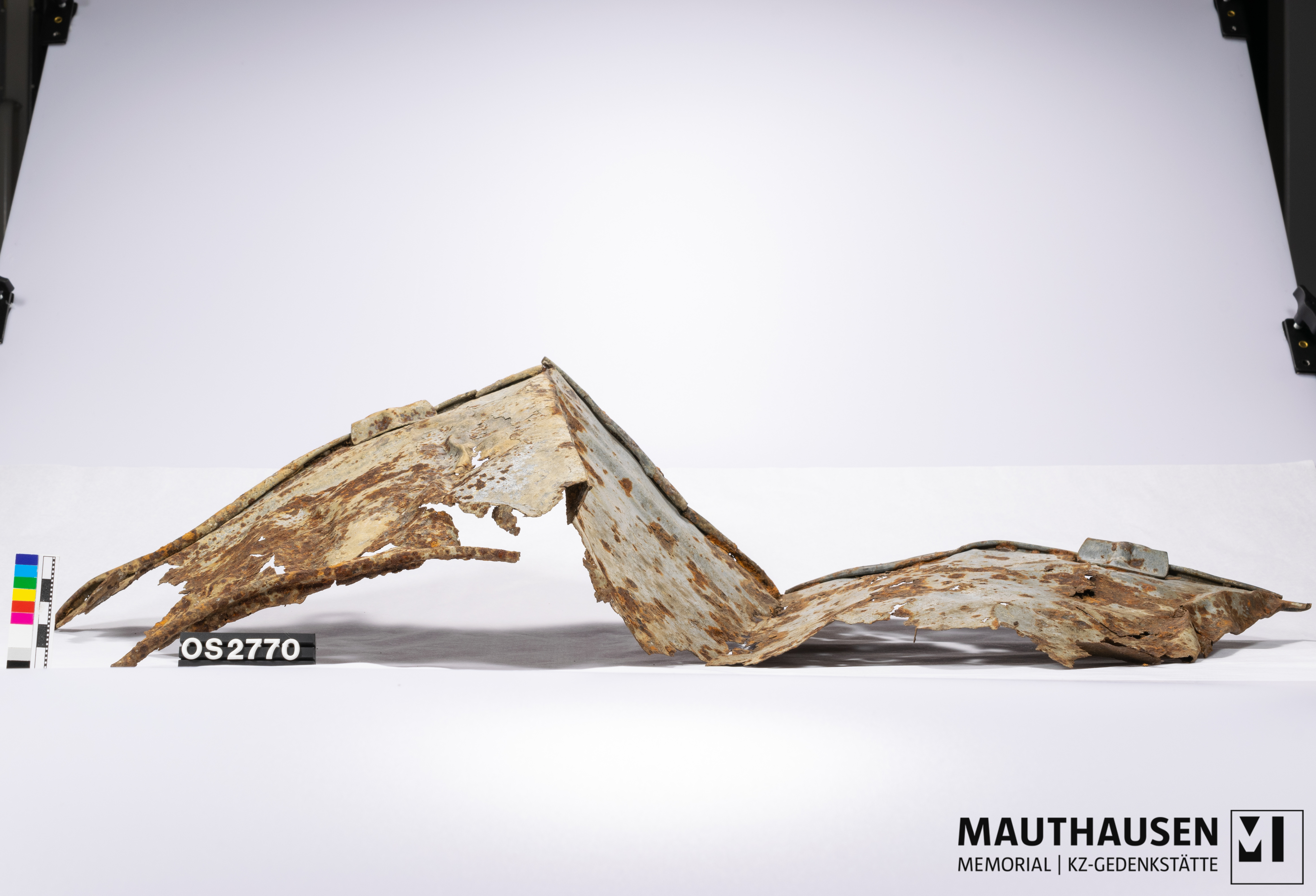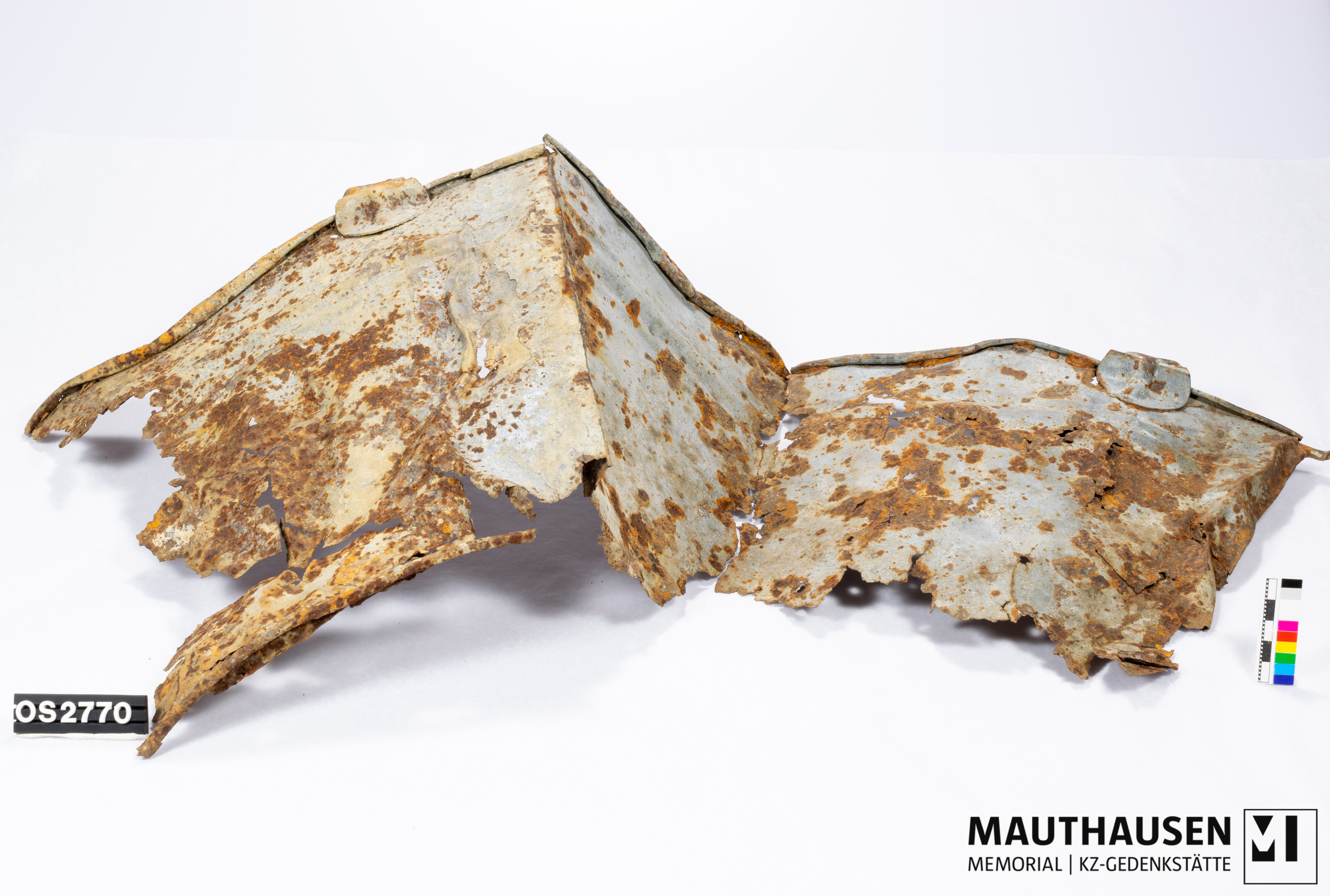 Kübel/Eimer; fragmentarisch erhalten; deformiert; auseinandergebrochen; OS-Nr. Teilung in a und b, da zwei Fragmente; OS2770a: größeres Fragment; geknickt; Rand umgebogen, nicht mehr durchgehend verbunden; Oberfläche Außen und Innen grau (Email oder verzinkt?); im oberen Bereich umlaufend 3 erhabene Rillen; 2 Bleche zwischen Wand und Rand mit Durchlochung als Befestigung für Henkel (nicht erhalten): je ein Blech an Wand befestigt, unterer Teil halbrunde Form, oberer Teil reicht über Rand hinaus, verjüngt sich, mit einer Durchlochung (Durchmesser ca. 18mm), erhabener Bereich mittig reicht bis äußerer Rand Durchlochung, zeigt sich auf Innenseite eingetieft; Ansatz Bodenbereich fragmentarisch erhalten; Innenseite: Rillen ebenso sichtbar; ein Teil des Wandbereiches nach Innen gefalten; senkrechte Naht (Schweißnaht?) an der Wand entlang sichtbar; OS2770b: kleineres Fragment; nicht sicher, ob es tatsächlich Teil des Eimers ist; weist jedoch auch drei erhabene Rillen auf; Oberfläche grau; Rand umgebogen; auf einer Seite Wand senkrecht Blech gefalten