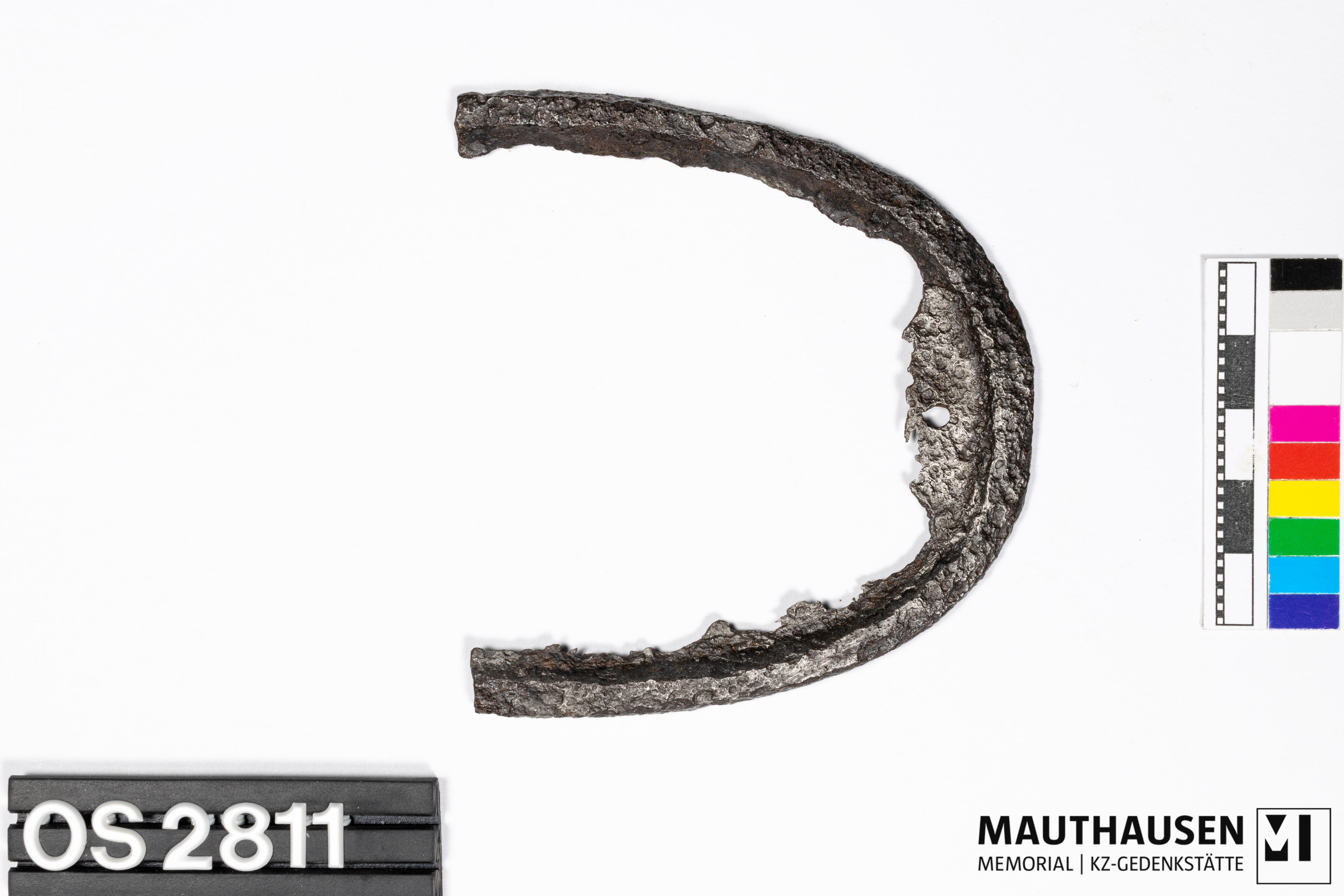 DescriptionSchuheisen; hufeisenförmig, nach oben hin geöffnet; 67mm zwischen den zwei Längsseiten; Längsseiten nach unten hin abgeschrägt; abkorrodierte Metallfragmente zwischen den Längsseiten mittig erhalten; darauf mittig Loch mit 3mm Durchmesser;