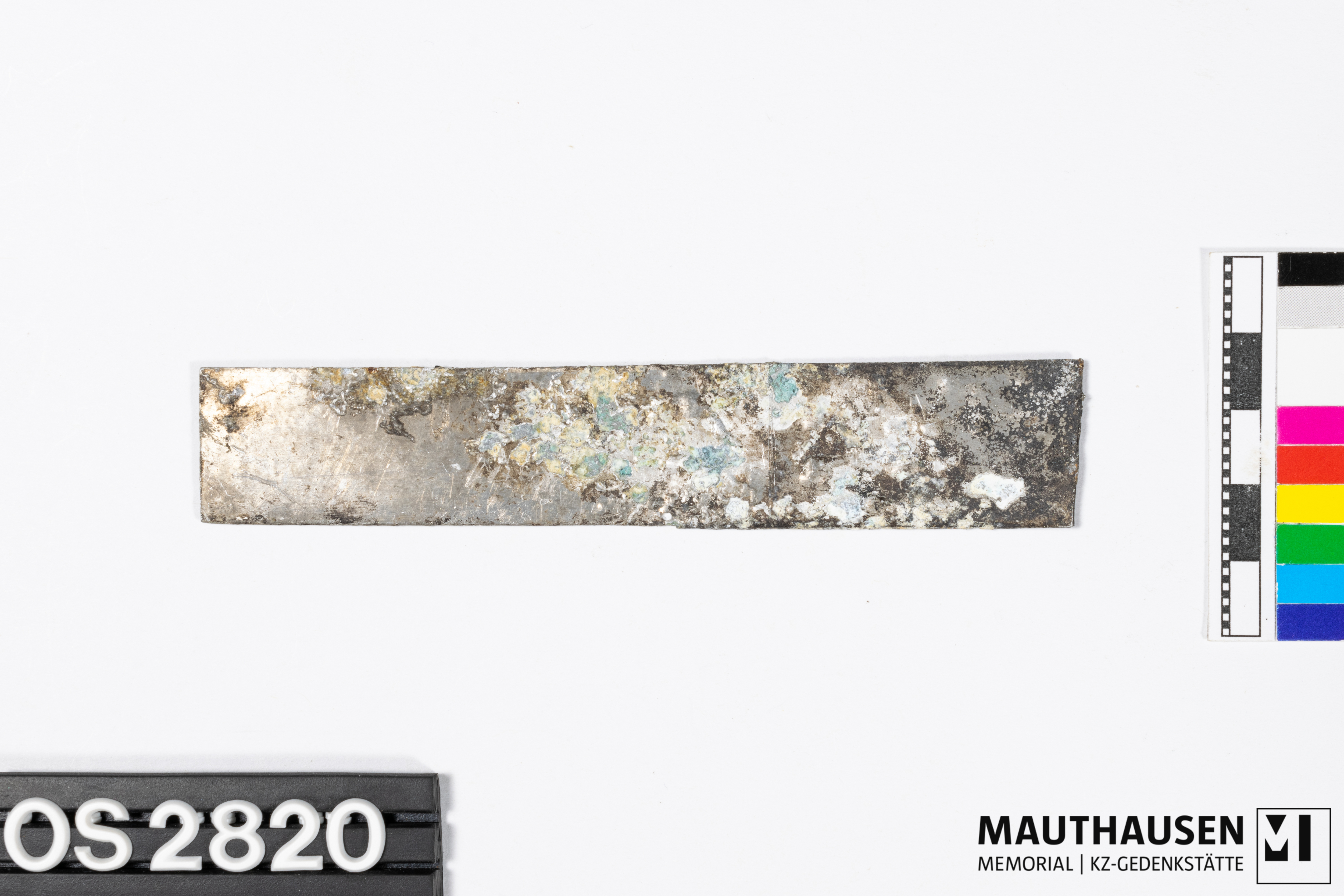 Eventuell Teile eines Flugzeugblechs; möglicherweise für die Herstellung von Häftlingsmarken zugeschnitten