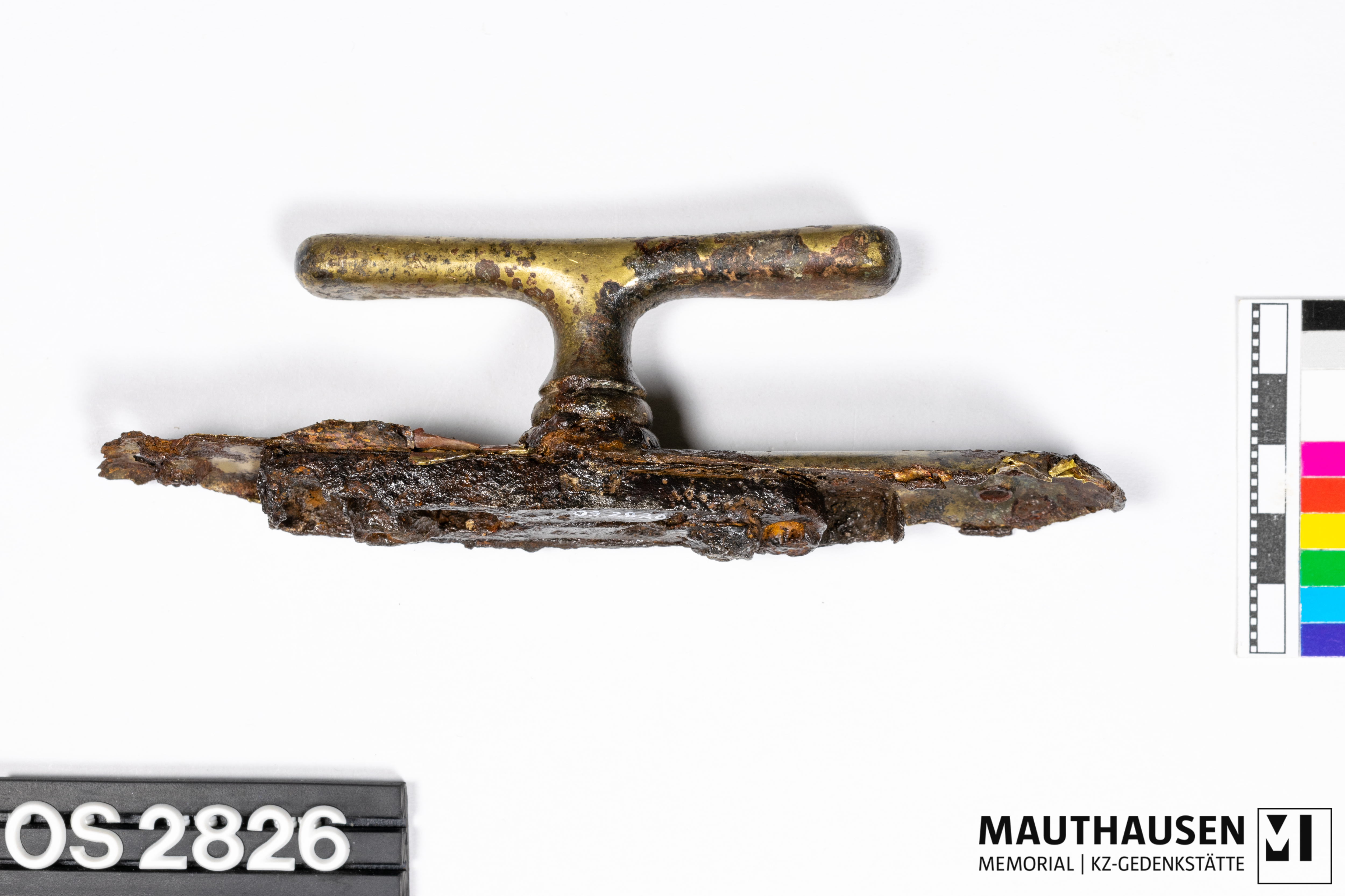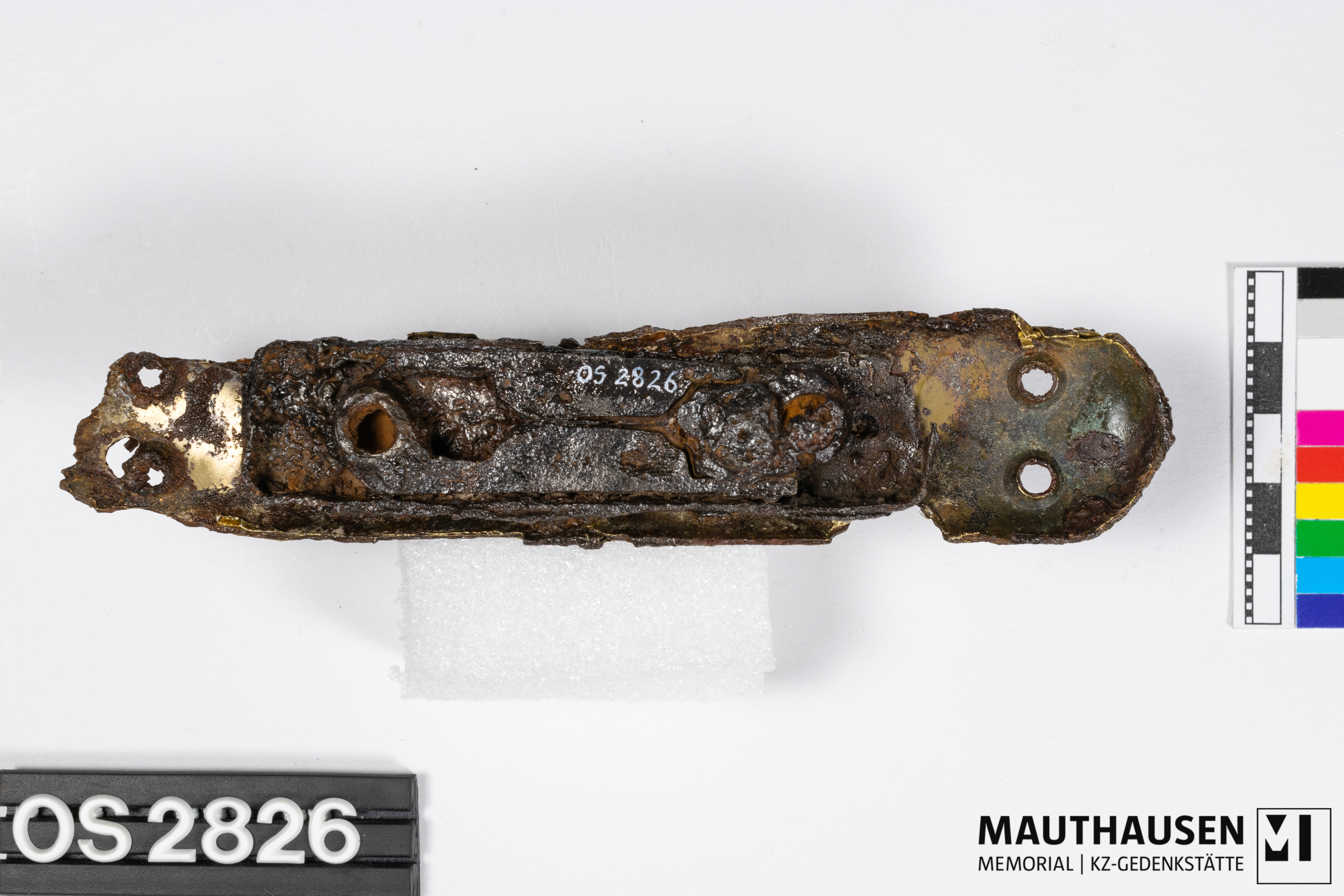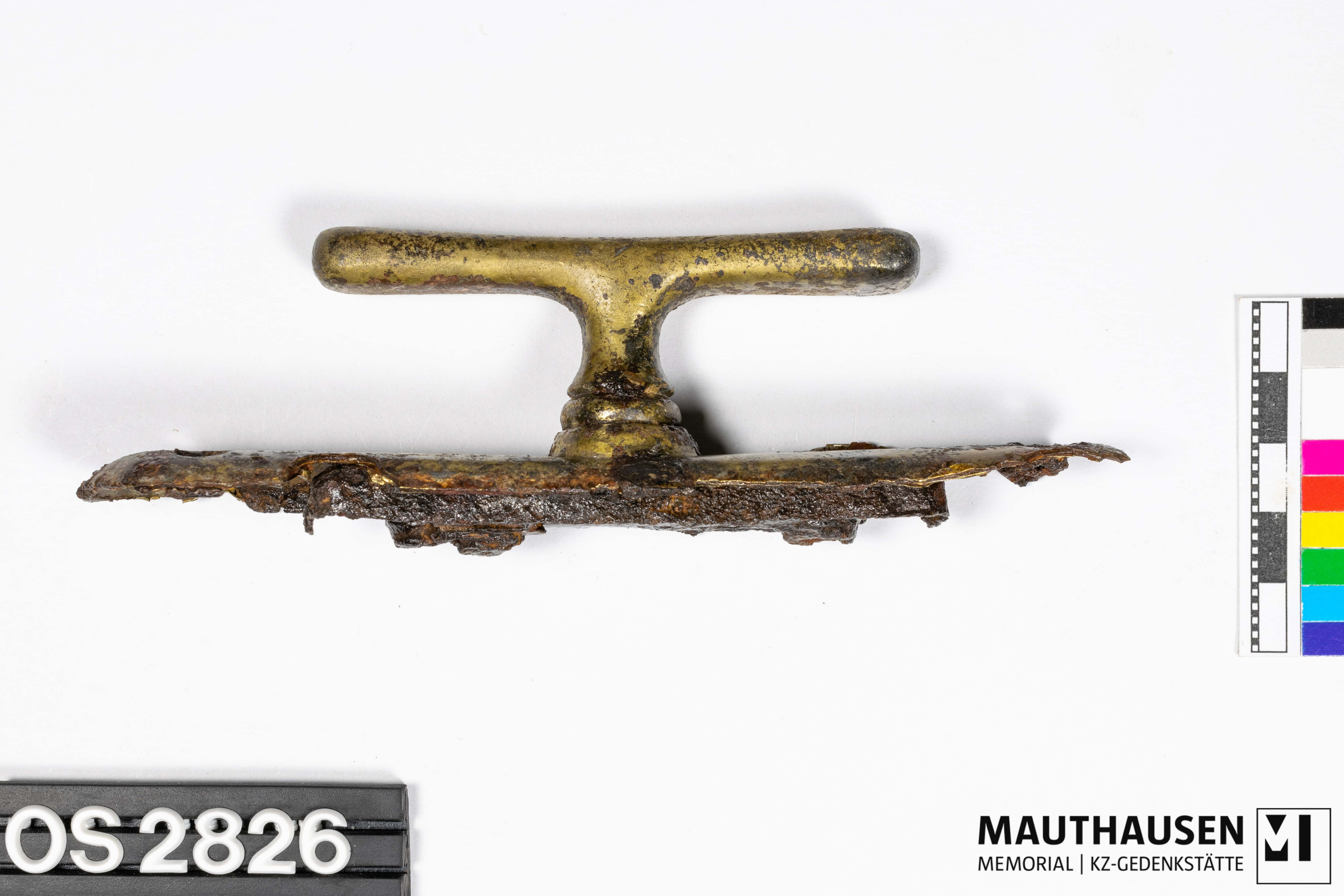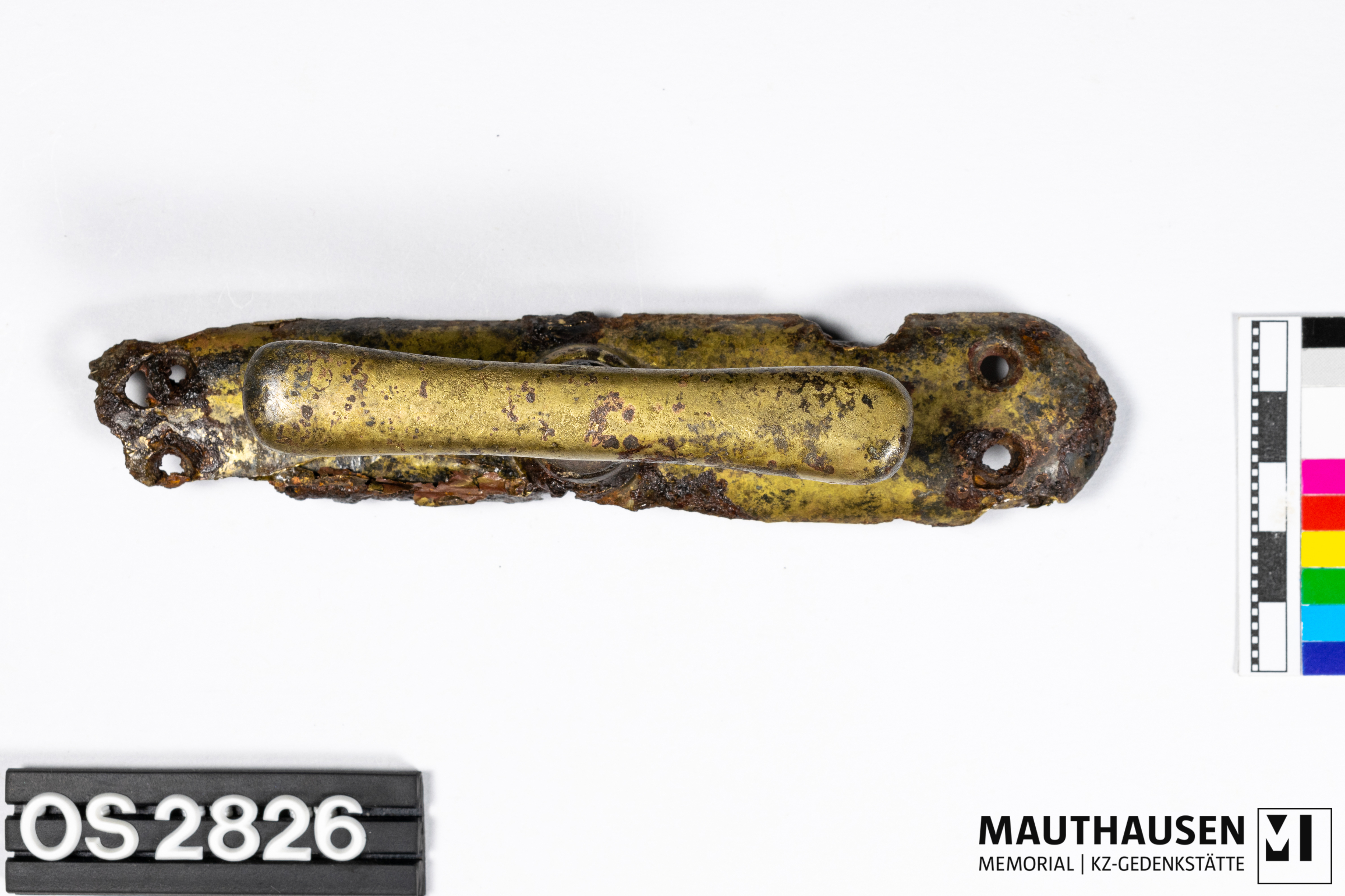 DescriptionGriff/Fenstergriff; längliches Metallstück mit abgerundeten Ecken; ein Ende abkorrodiert; zwei Bohrlöcher an jedem Ende erkennbar; mittig Anbringung des geraden, länglichen Drehgriffs; 84mm lang, 34mm hoch; Rückseite 83mm langer Apparat zum Öffnen und Schließen, ein Loch zur Befestigung, zweites Loch zukorrodiert;