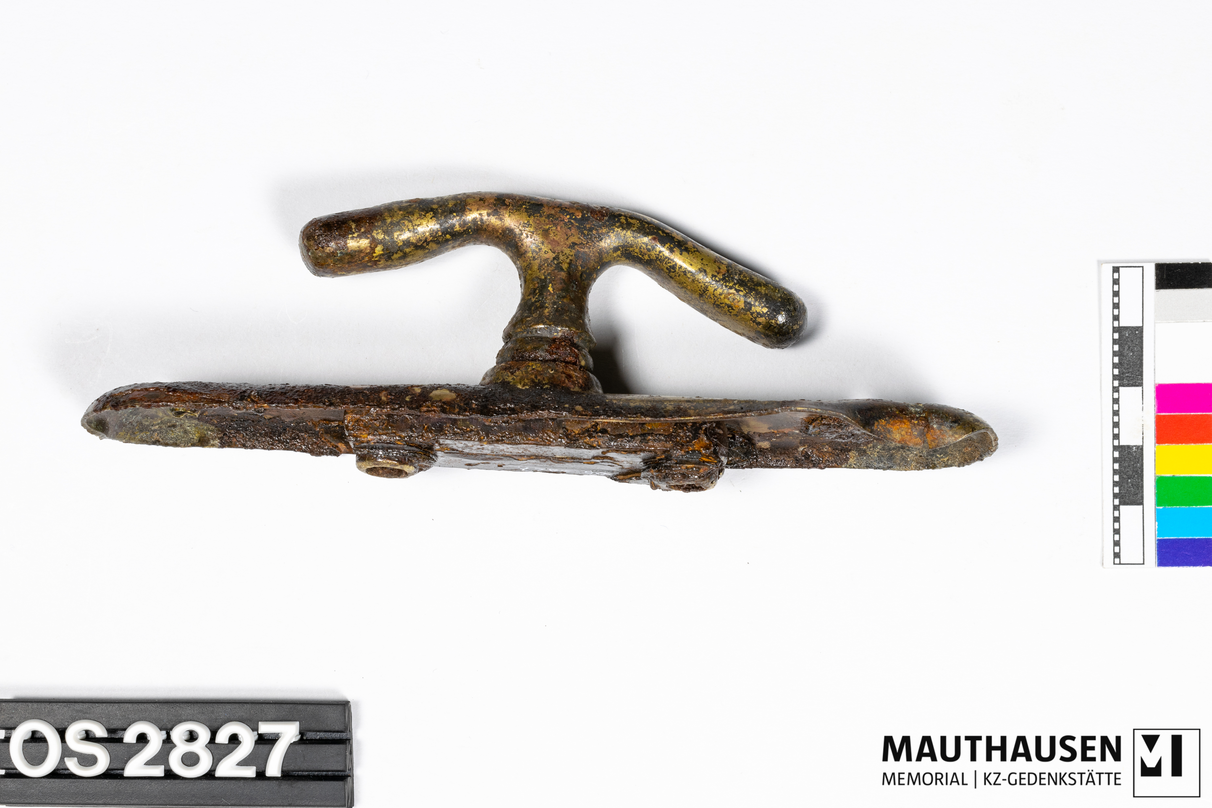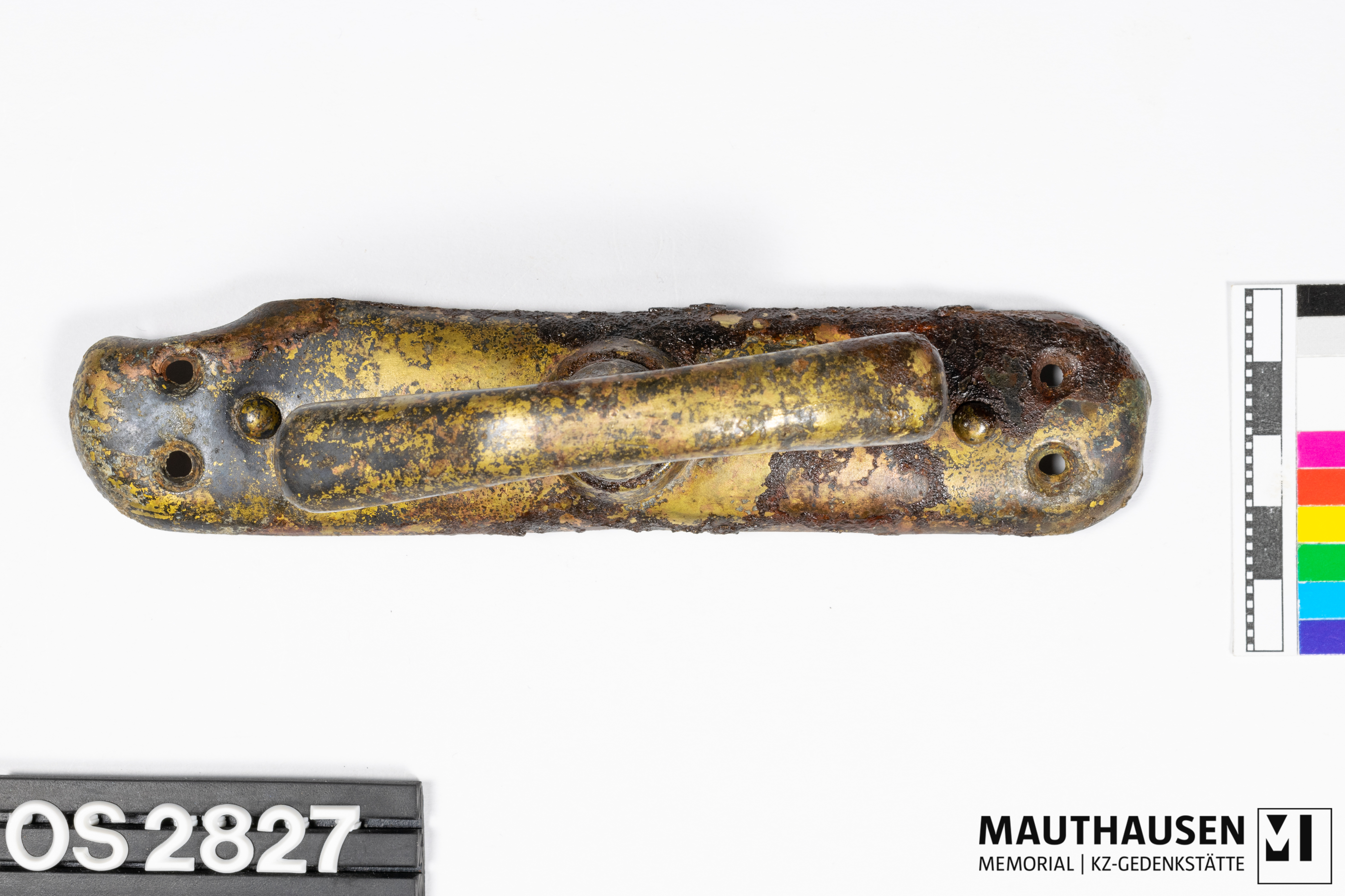 DescriptionGriff/Fenstergriff; längliches Metallstück mit abgerundeten Ecken; zwei Bohrlöcher an jedem Ende erkennbar; mittig Anbringung des gebogenen, länglichen Drehgriffs; 85mm lang, 35mm hoch; Rückseite 60mm langer Apparat zum Öffnen und Schließen angebracht, zwei erhöhte Löcher zur Befestigung