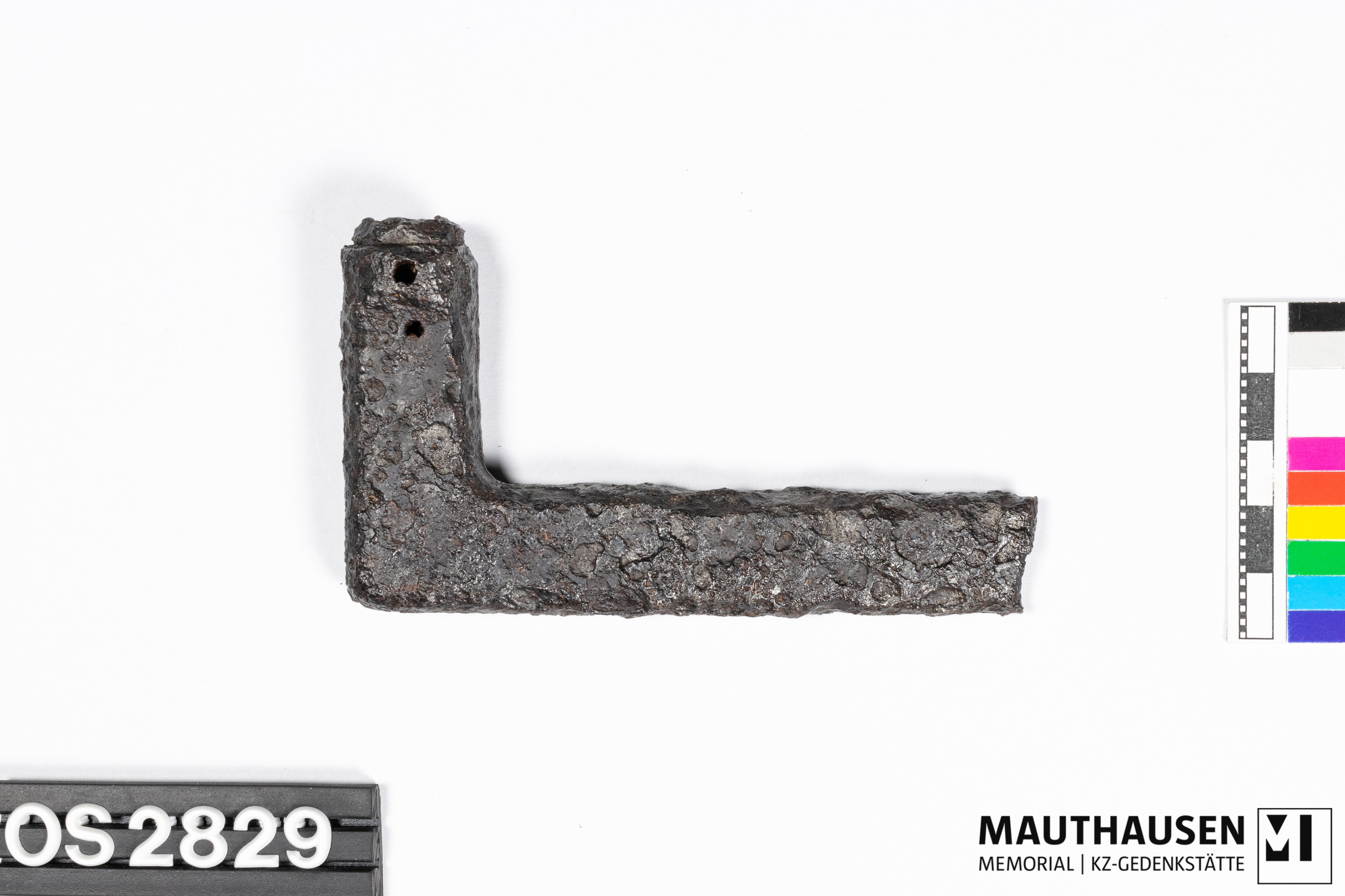 DescriptionGriff/Türgriff; länglicher Klinkengriff, verdickt sich gegen Ende; im rechten Winkel abgehend breiter werdendes Element mit 2 Bohrlöchern pro Seite, 53mm lang, runder Abschluss, ca. 15mm Durchmesser; quadratischer Auslass für Drückerstift