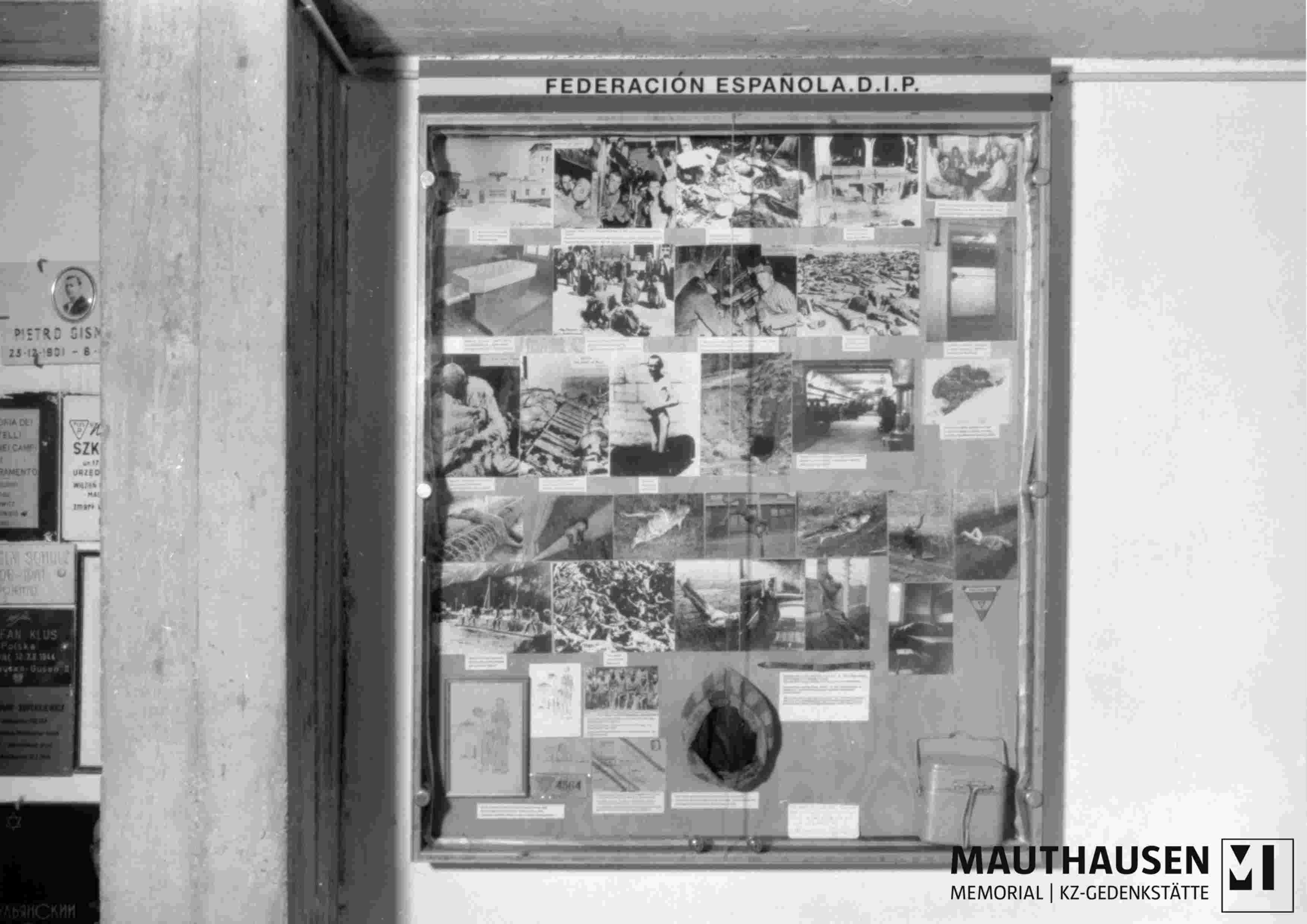 DescriptionVitrine des Überlebendenverbandes FEDIP in Erinnerung an die spanischen Deportierten, gestaltet mit Fotografien, Zeichnungen und Artefakten