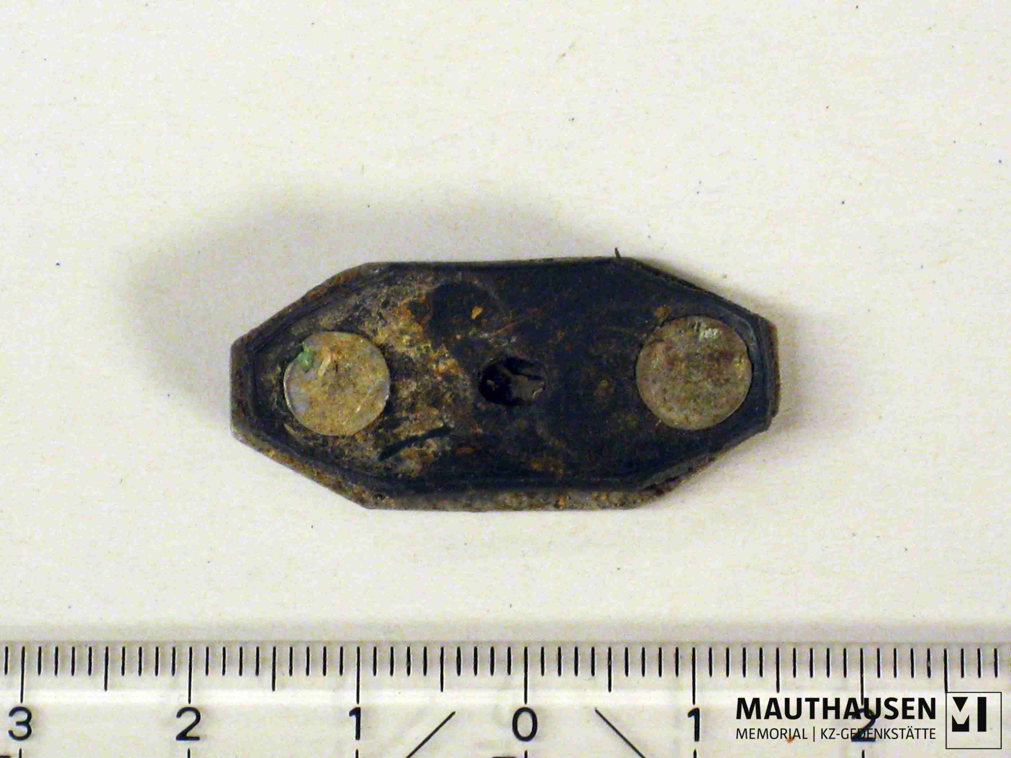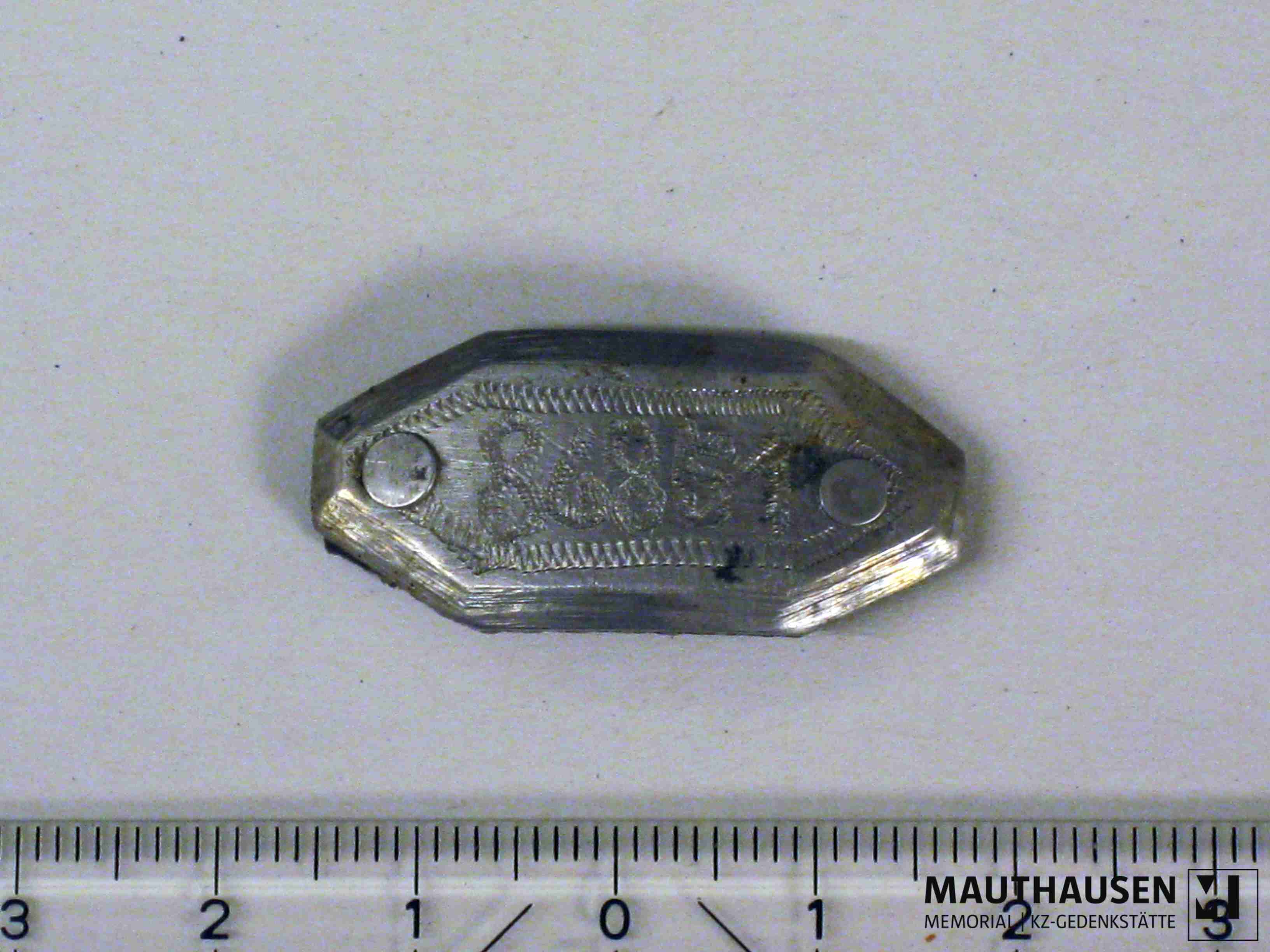 mit der Nummer 86851 eingemeißelt. in gleicher Technik Nummer eingerahmt. Korpus achteckig länglich. auf einem [ jetzt nur mehr ein in Form der Marke zugeschnittenes Stück] Kunststoff(?)Band befestigt