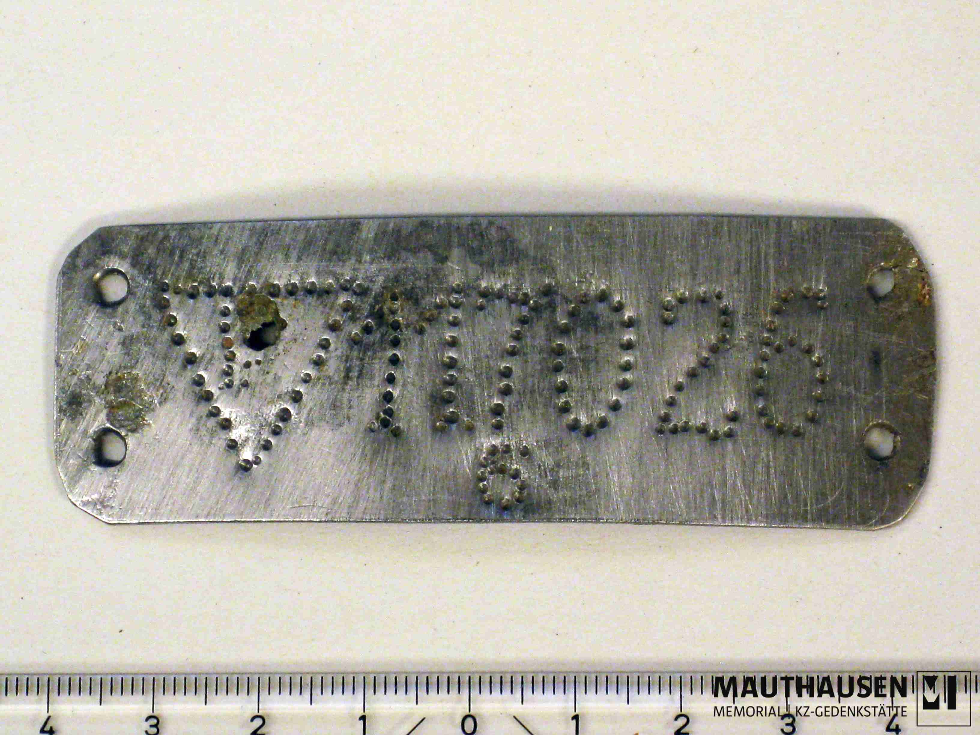 Häftlingsmarke; lang rechteckig und breit; abgerundete Ecken; je zwei runde Durchlochungen an den Schmalseiten; Marke nach unten gebogen; auf Vorderseite linke Schmalseite Risslinie; auf Rückseite an beiden Schmalseiten auch eine Risslinie; Beschriftung: auf Vorderseite linker Bereich Winkel (nach unten gerichtetes Dreieck) ziseliert, darin Buchstabe "P"(?) ziseliert, nicht eindeutig lesbar; rechts neben Winkel Zahl "117026" ziseliert, unter der Ziffer "7" die Ziffer "6" ziseliert; für die Ziselierung wurde Rundpunze verwendet; auf Rückseite ist Bereich der Beschriftung erkennbar und lesbar durch punktförmige Erhebungen