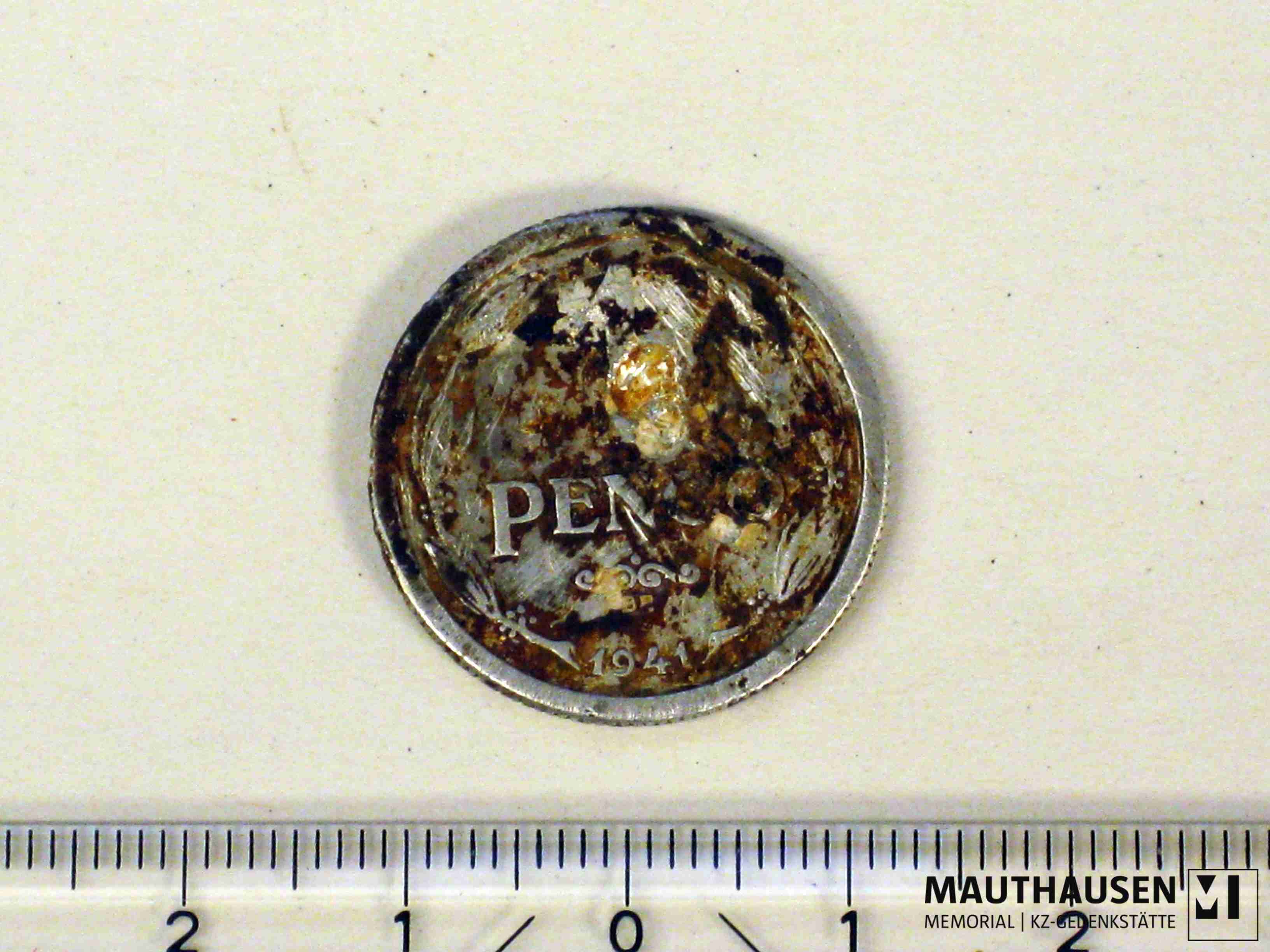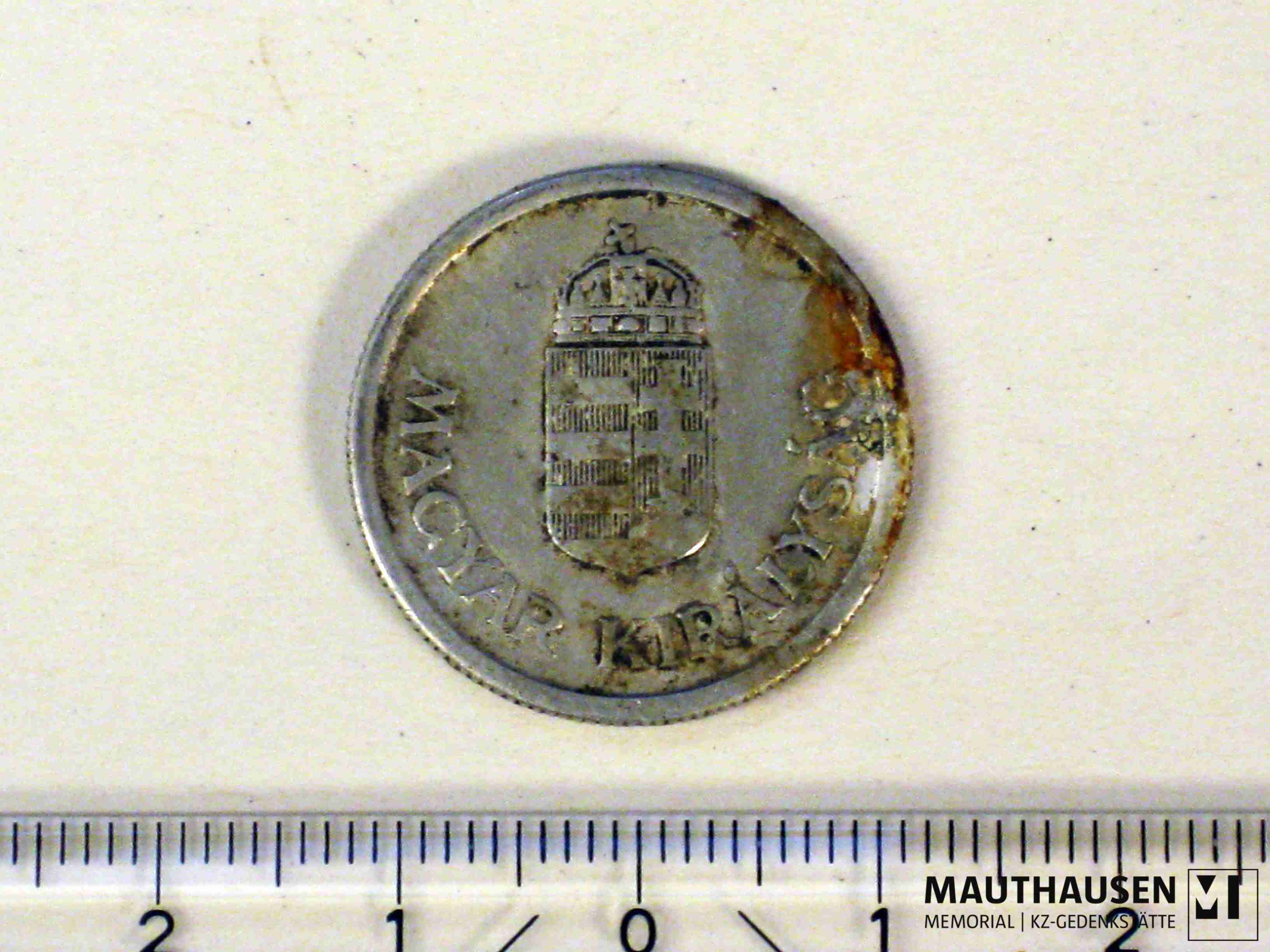 ungarische Münze aus dem Jahre 1941; Vorderseite (Avers): "1 PENGO 1941" und ornamentalischer Verzierung; Rückseite (Revers): als Münzbild das ungarische Wappen und Schriftzug "MAGYAR KIRALYSAG"; am Avers starke Oberflächenveränderung; Korrosion; am Revers nur ansatzweise.