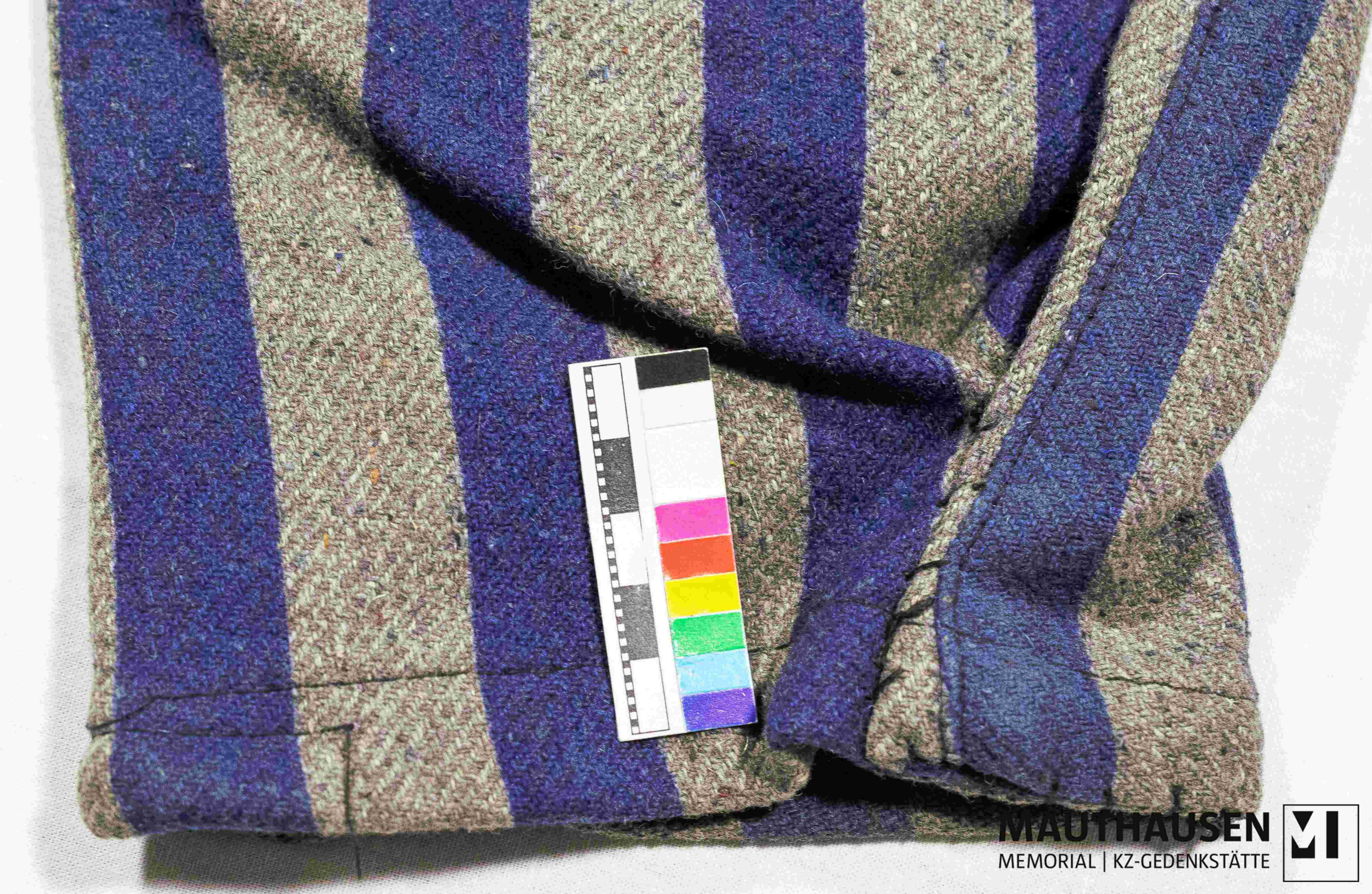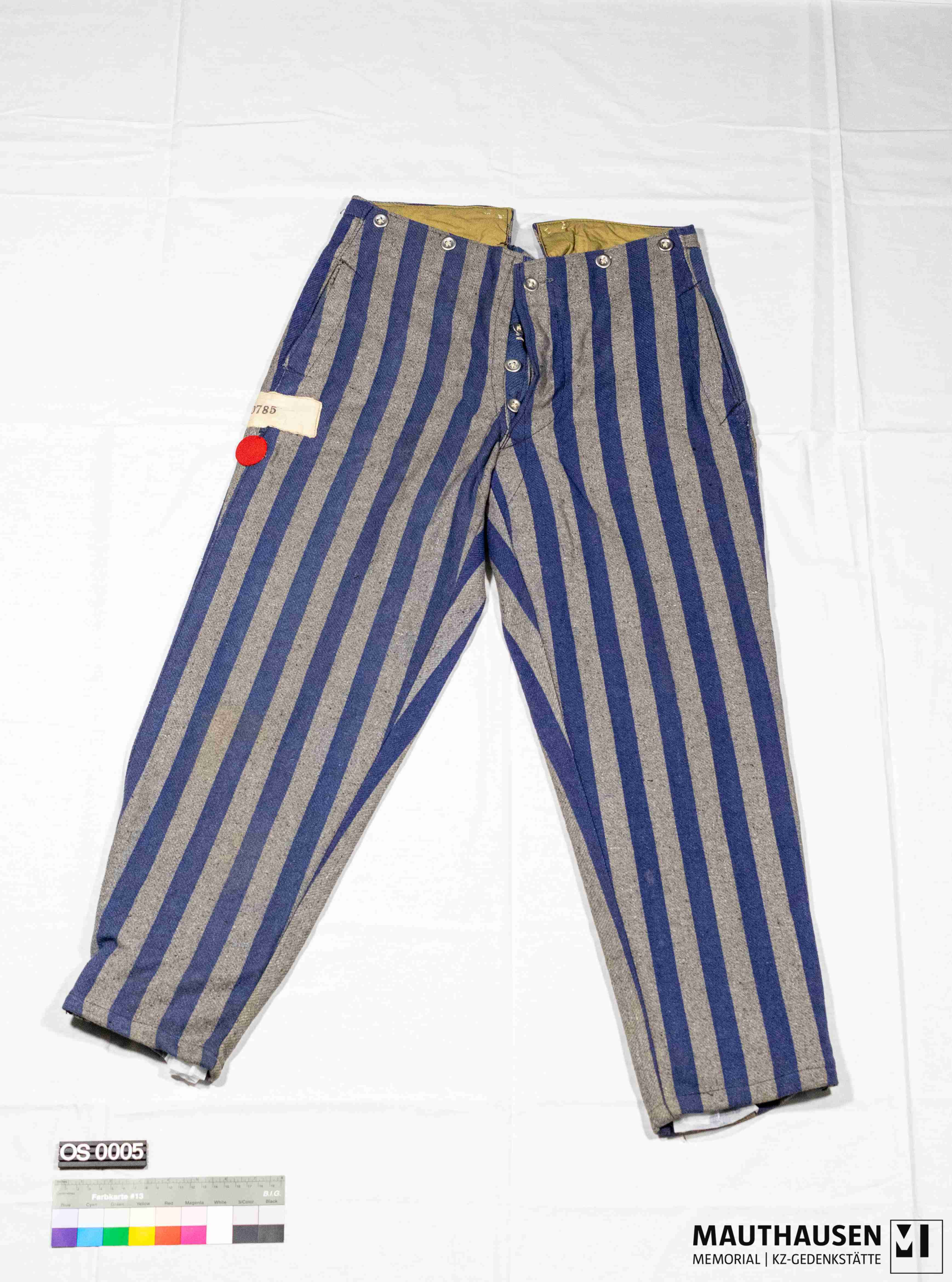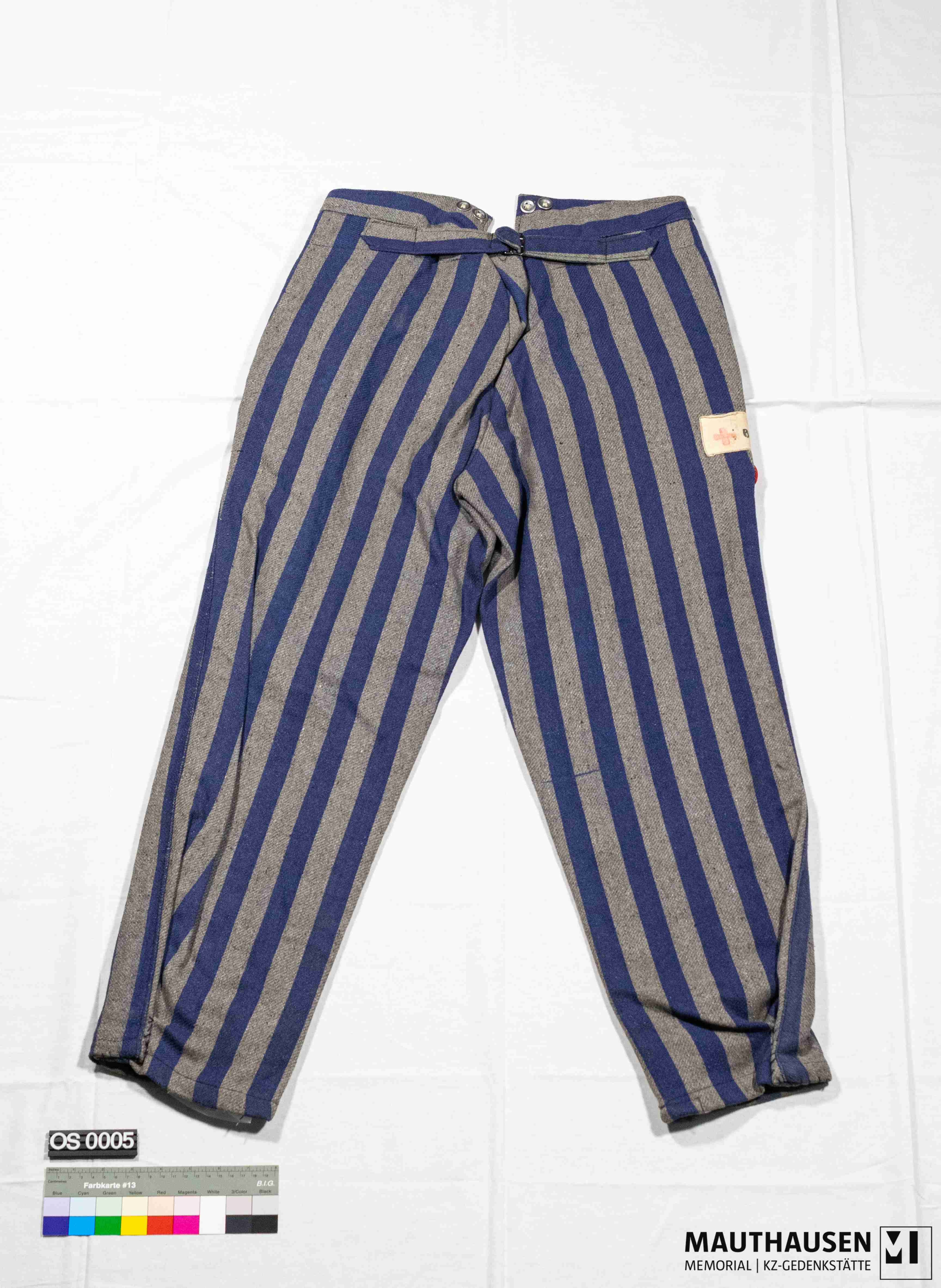 gestreift, am rechten Hosenbein in Oberschenkelhöhe Stück Stoff mit Häftlingsnummer "60785" aufgenäht, darunter rotes rundes Stoffstück; Am Saum durch Zusammennähen die Hosenbeine verengt; Gehört zusammen mit Sanitäterhäftlingsjacke OS0004.
