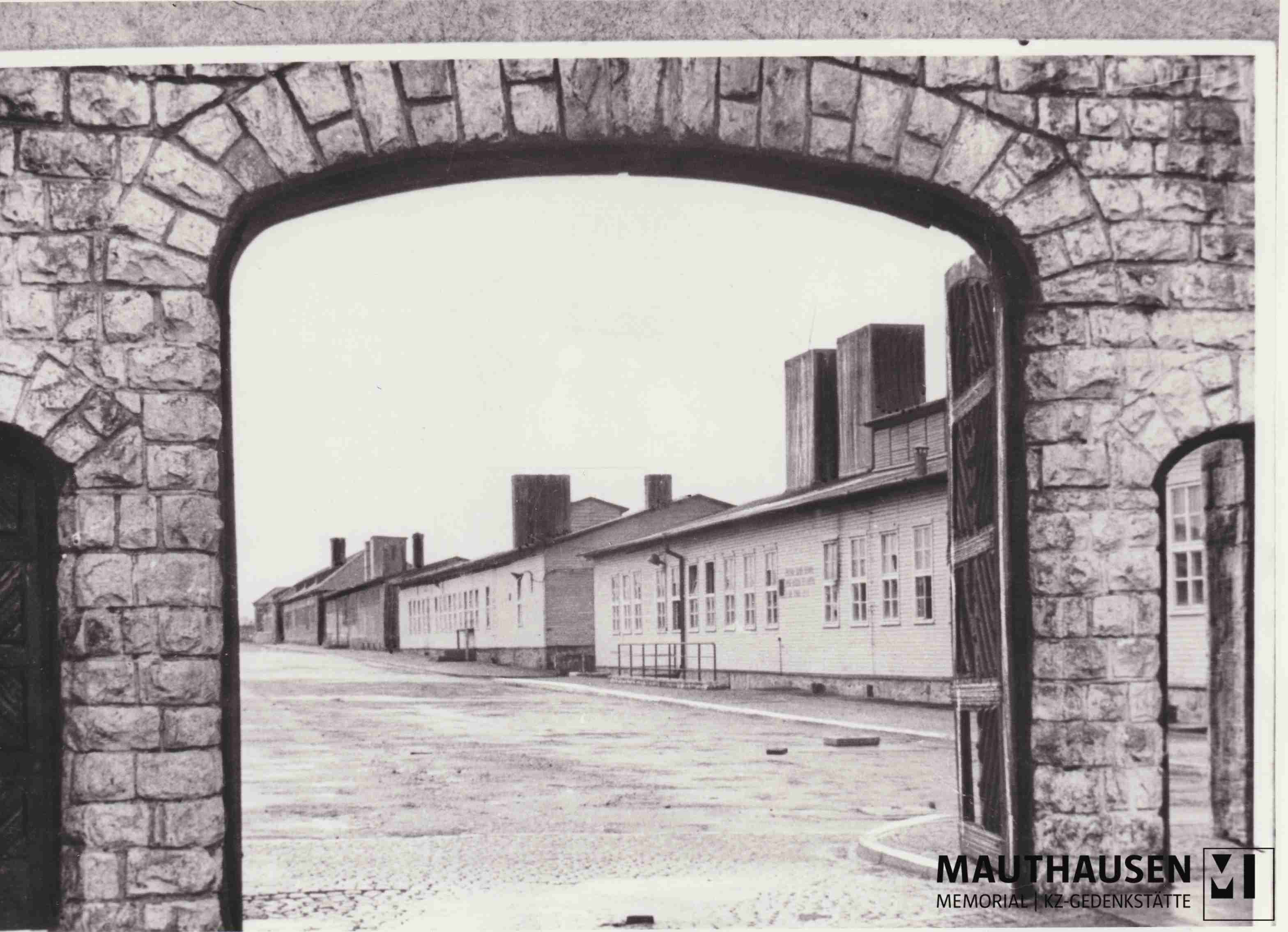 KZ-Gedenkstätte Mauthausen: Jourhaus (Lagertor), Blickrichtung Wäscherei- und Küchenbaracke, Konturen nachgezeichnet