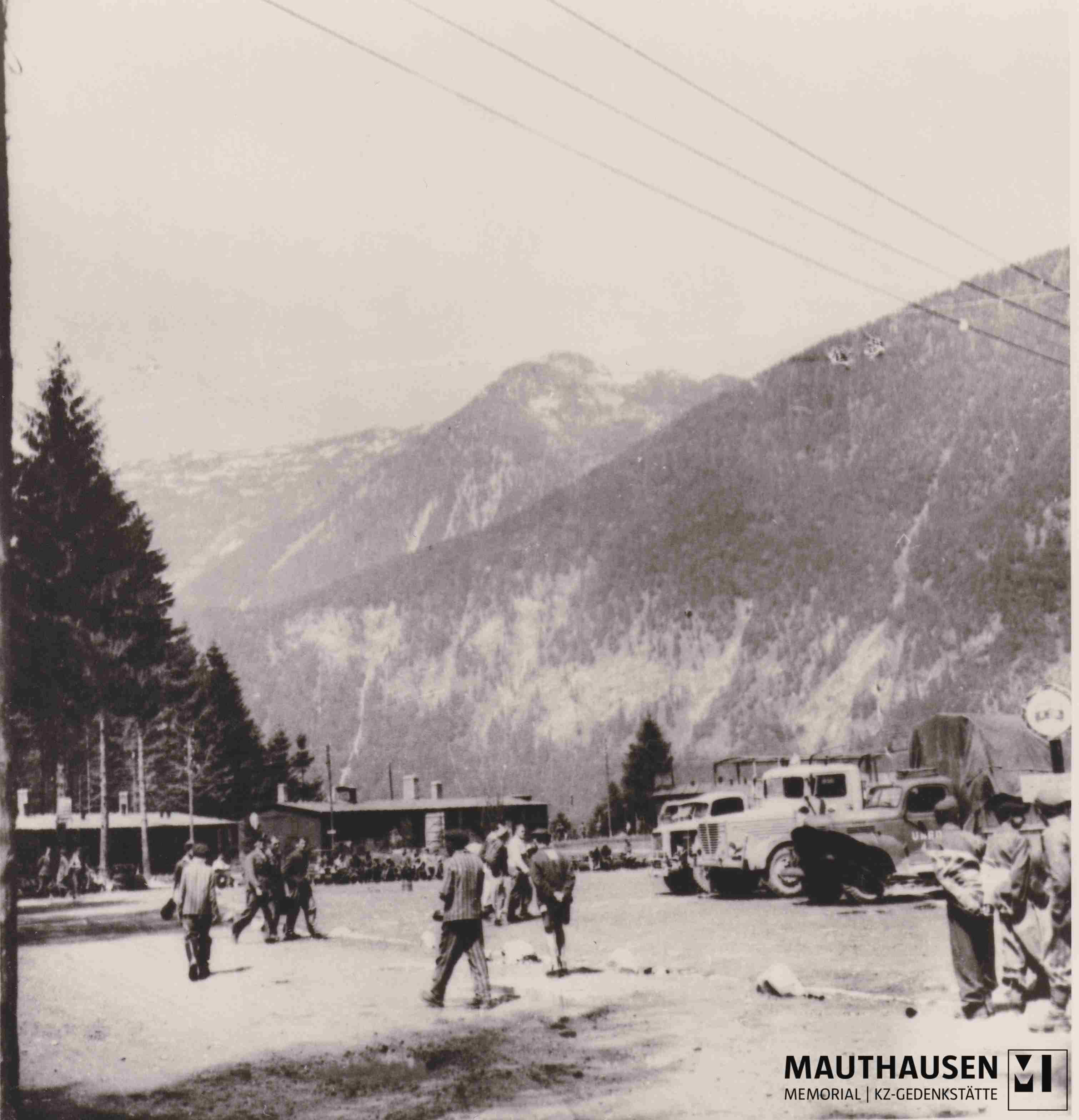 TitleBefreites Außenlager Ebensee: Befreite Häftlinge gehen auf dem Appellplatz, im Hintergrund Baracken und LKWs, ein LKW mit Aufschrift "UNRRA", Großformat