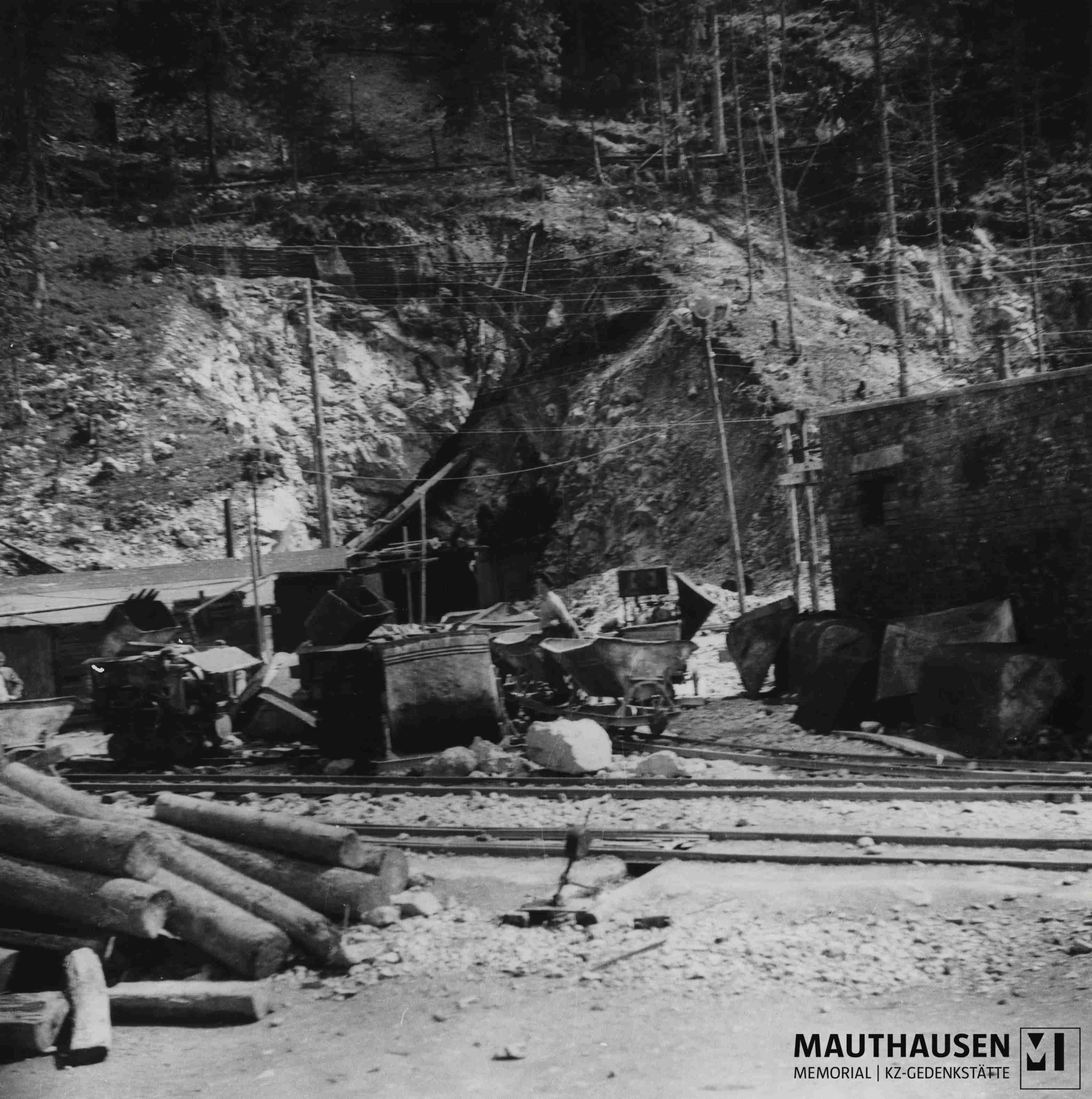 TitleBefreites Außenlager Ebensee: Holzpflöcke, Schienen einer Feldbahn und Loren vor einem Zugang einer Stollenanlage, zwei Männer sind zu erkennen, rechts ein Ziegelbauwerk, Großformat