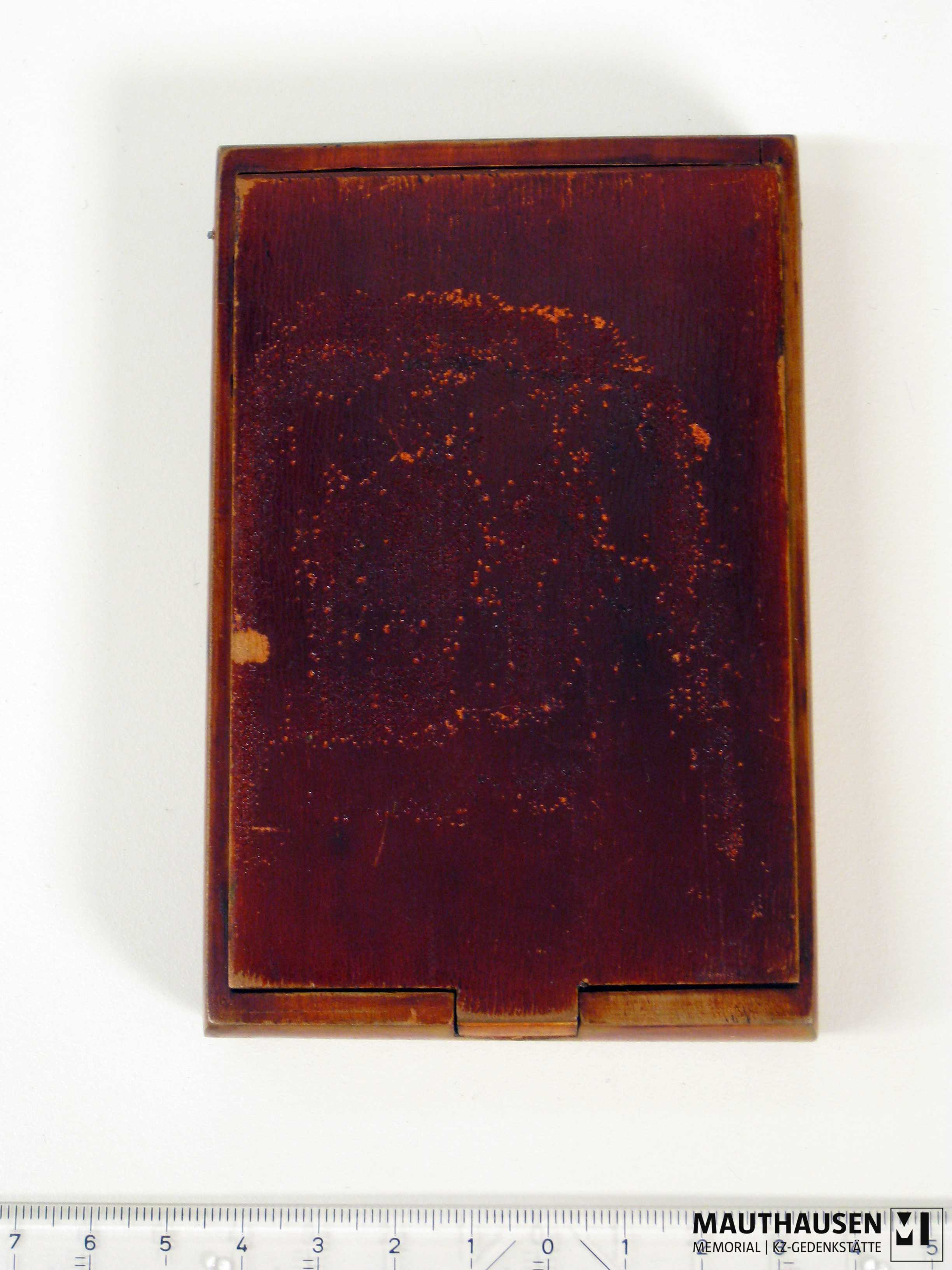 Dunkelrot; läßt sich nicht mehr öffnen; Intarsie am Verschluss; Farbe stellenweise abgerieben; Kratzspuren; Oberflächenveränderung besonders mittig an Deckel und Boden.