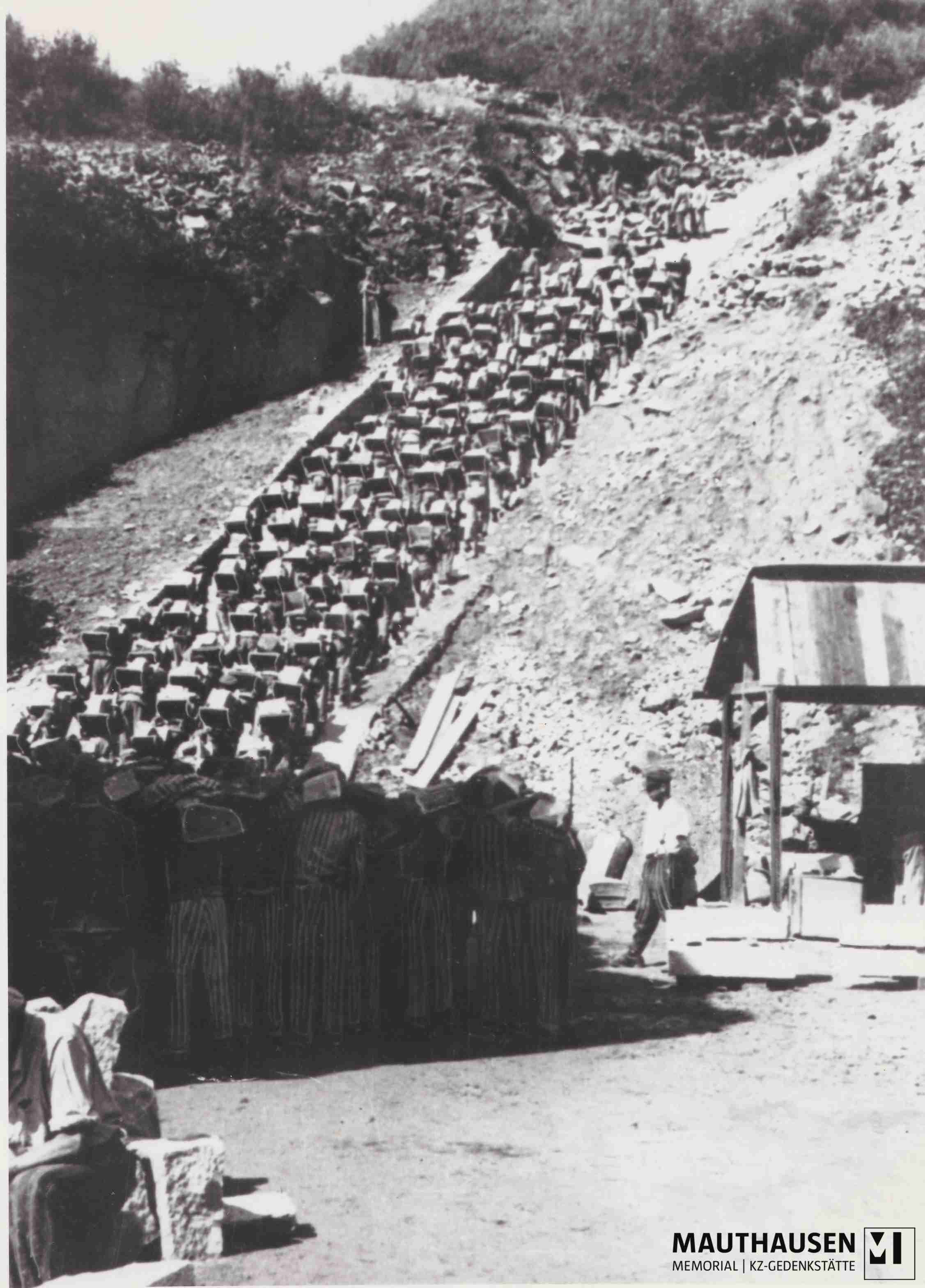 TitelSS-Erkennungsdienst im KZ Mauthausen: Häftlinge der Strafkomplanie beim Tragen von Granitblöcken auf der "Todesstiege"