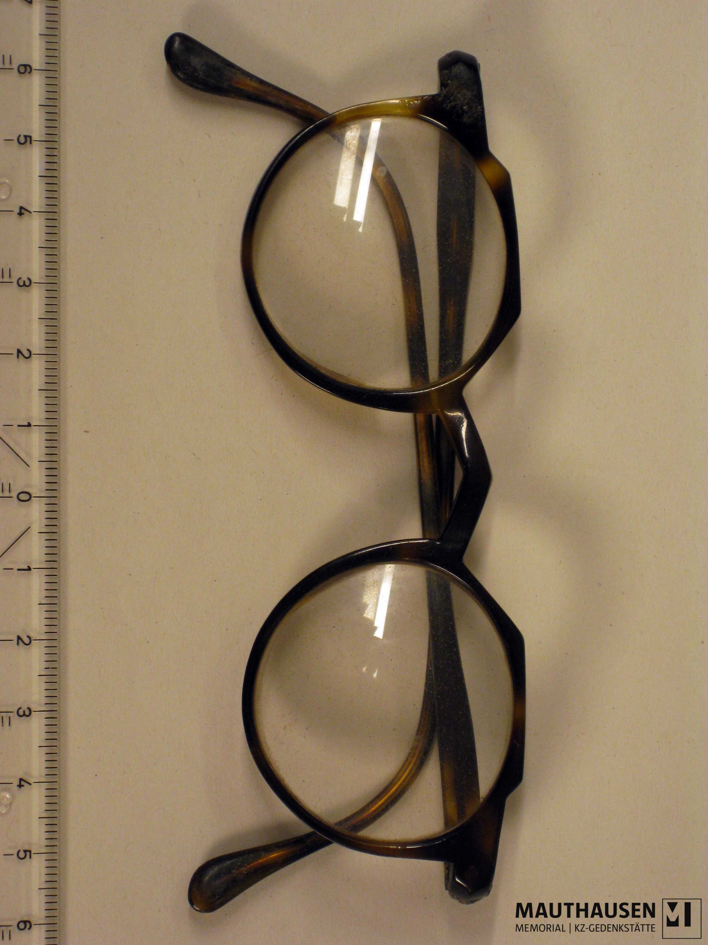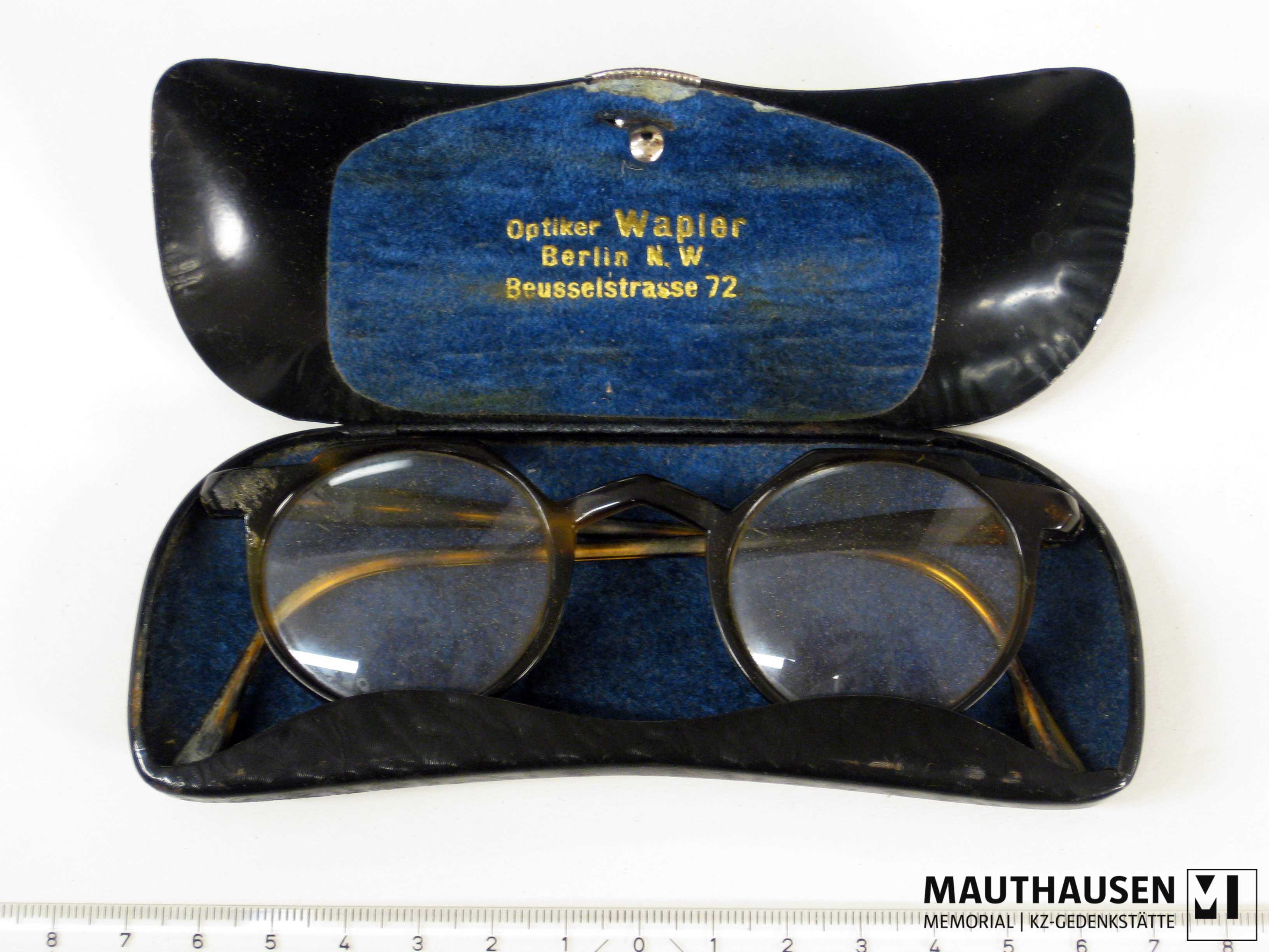 DescriptionBrille in schwarzem Etui (Frage ob Etui in die Zeit des Lagers fällt? - vermutlich eher nicht); runde Gläser, Steg mit Knick, Fassung in HornOptik; Bügel über das bekannte Maß hinaus zu öffnen aufgrund starker Abnützung; Brille sehr filigran, besonders die Bügel; Oberflächenveränderungen: Weichmacher tritt stellenweise an Oberfläche, besonders bei Nasenaufsatz(?) Beidseits und Steg; Glas: Kratzspuren; Etui: stellweise abgerieben.