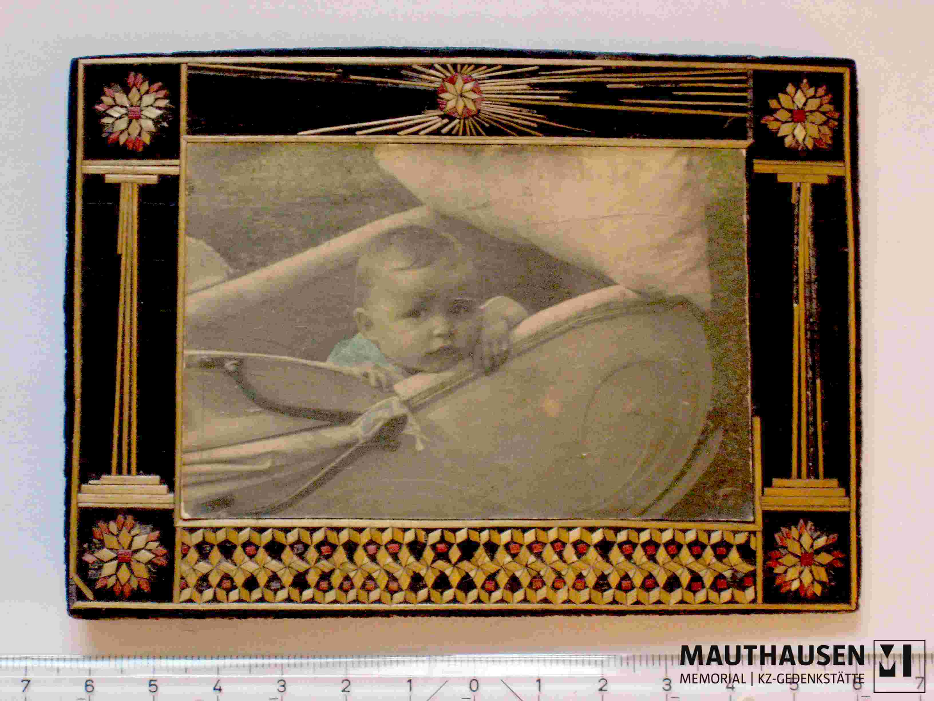 Descriptionmit Kleinkindfotografie; Rahmen: Stück Holz, dessen Rand mit Strohstückchen in floralem, ornamentalem Muster und in Linien aufgeklebt; einige Stückchen der Rahmenverzierung fehlen; In der Mitte das Foto; Auf der Rückseite handschriftlich notiert: "dieser Bilderrahmen: gefertigt 1944/45 von Häftlingen KZ Mauthausen." Foto: Kleinkind im Kinderwagen; Foto an einem Ende leicht abgehoben.