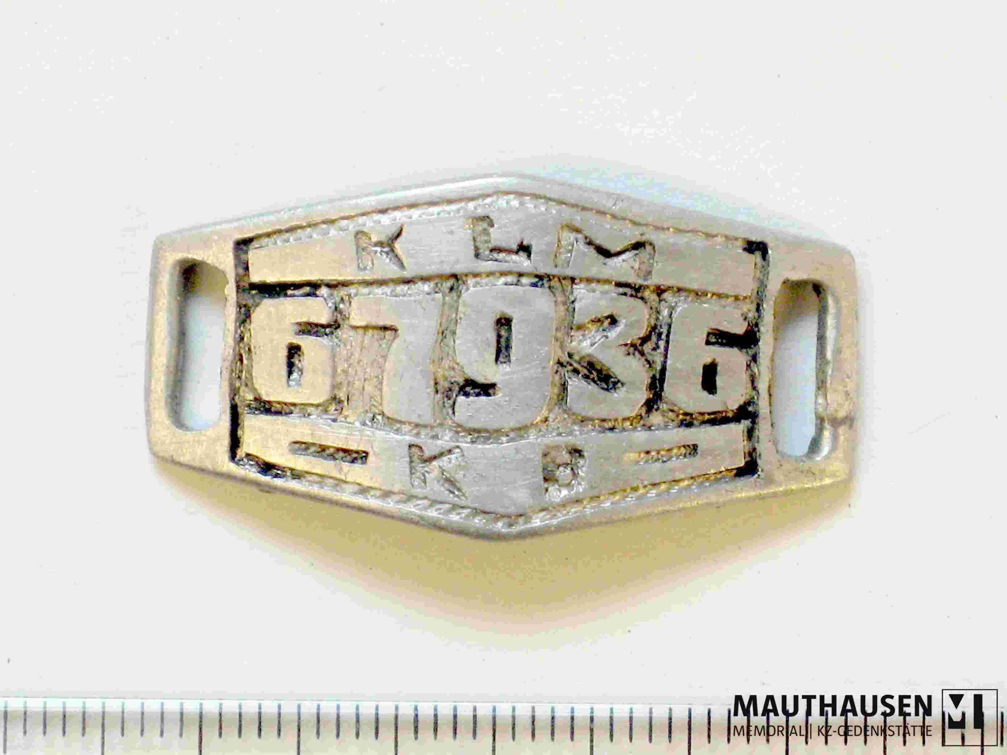 Häftlingsmarke von dem ungarischen Häftling Benjamin Kraizman mit der Häftlingsnr. 67936; Daten aus der Häftlingsdatenbank: Benjamin Kraizman, Ungarn, Jude, geb. 11.08.1930 in Magyrko_jat, 28.05.1944 von Auschwitz in das Zeltlager und weiter nach Gunskirchen verbracht, Todesort Gunskirchen 1945 (HDB. Quelle für HDB: Y/36). Siehe auch: MM 1.6.1.7511/25-IV/4/81 Bericht über Exhumierungen in Gunskirchen (1979); Yvonne Burger, Das vergessene Lager. Das ehemalige Waldlager Gunskirchen. Masterarbeit Universität Wien, 2019.