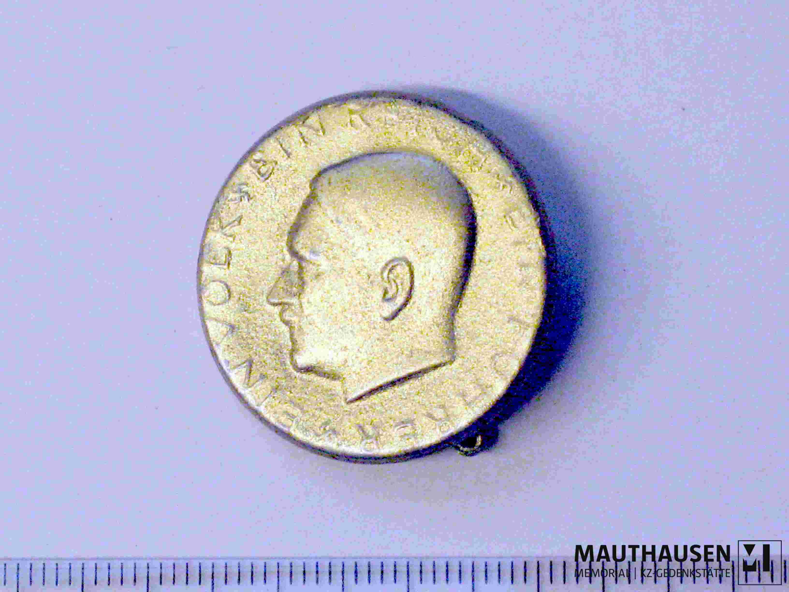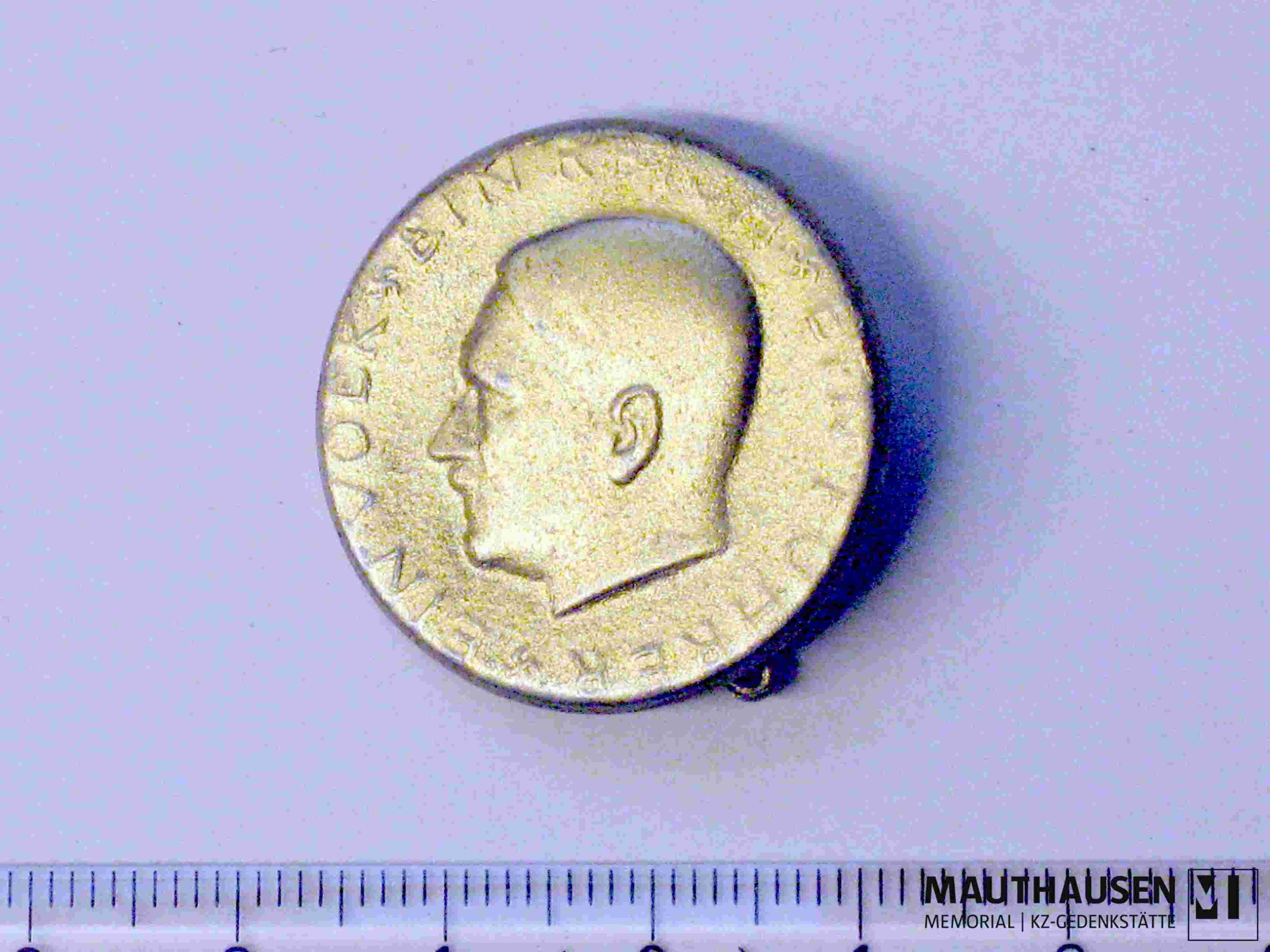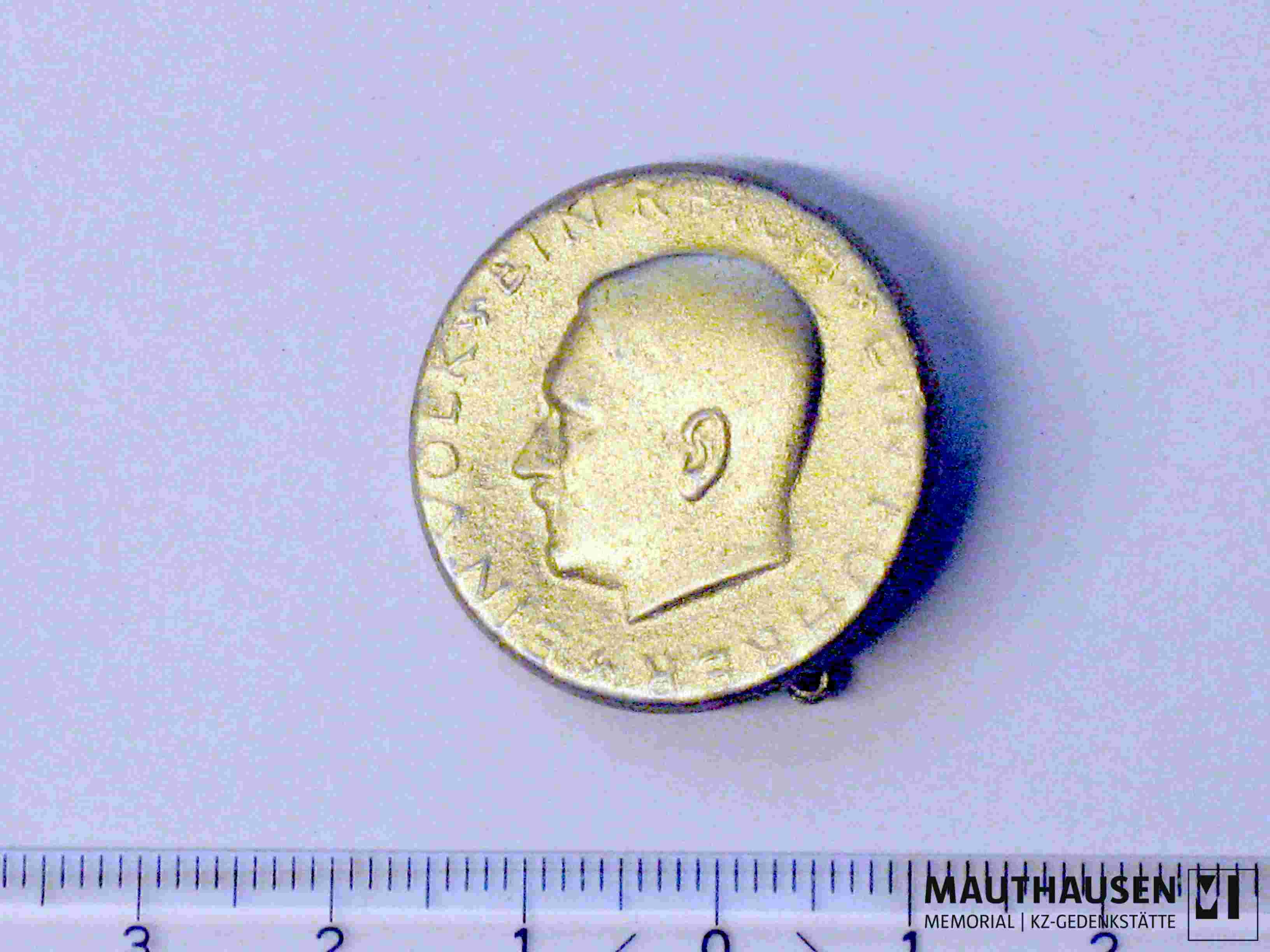 Plakette/Anstecker: Vorderseite: mit Schriftzug "Ein Volk, ein Reich, ein Führer", der nahe dem Rand umläuft; mittig Profil von Adolf Hitler, goldfarben. Rückseite: Nadel zum Befestigen.