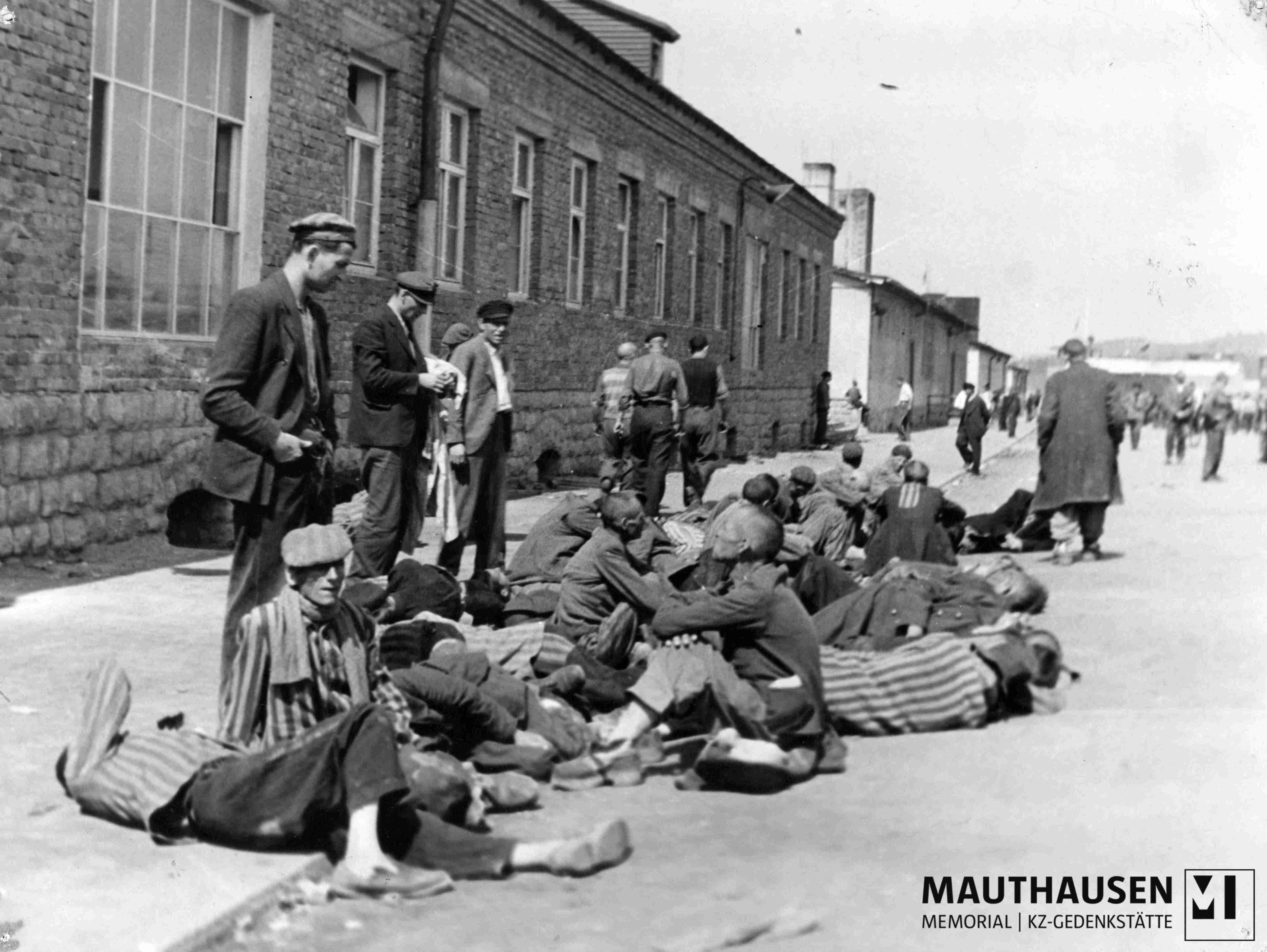 Befreites KZ Mauthausen: Überlebende am Appellplatz vor dem ehemaligen Krankenrevier in Mauthausen