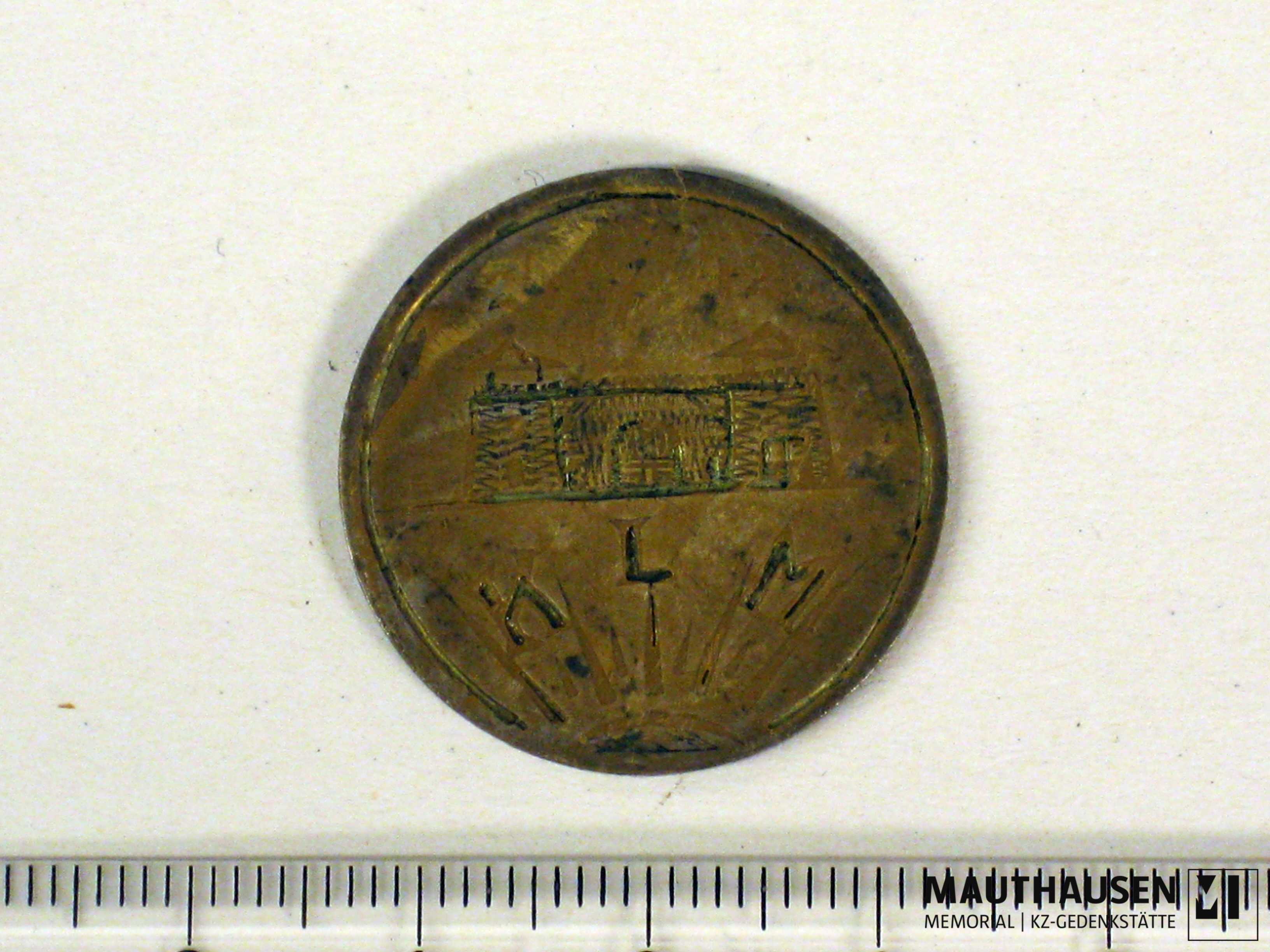 Vorderseite (Avers): Nummer "11882" eingraviert, in der gleichen Technik darüber die Initialen "GF", darunter das Geburtsdatum "20.X.03"; Rückseite (Revers): das Eingangstor des Konzentrationslagers Mauthausen eingeritzt, darunter die Buchstaben "KLM".