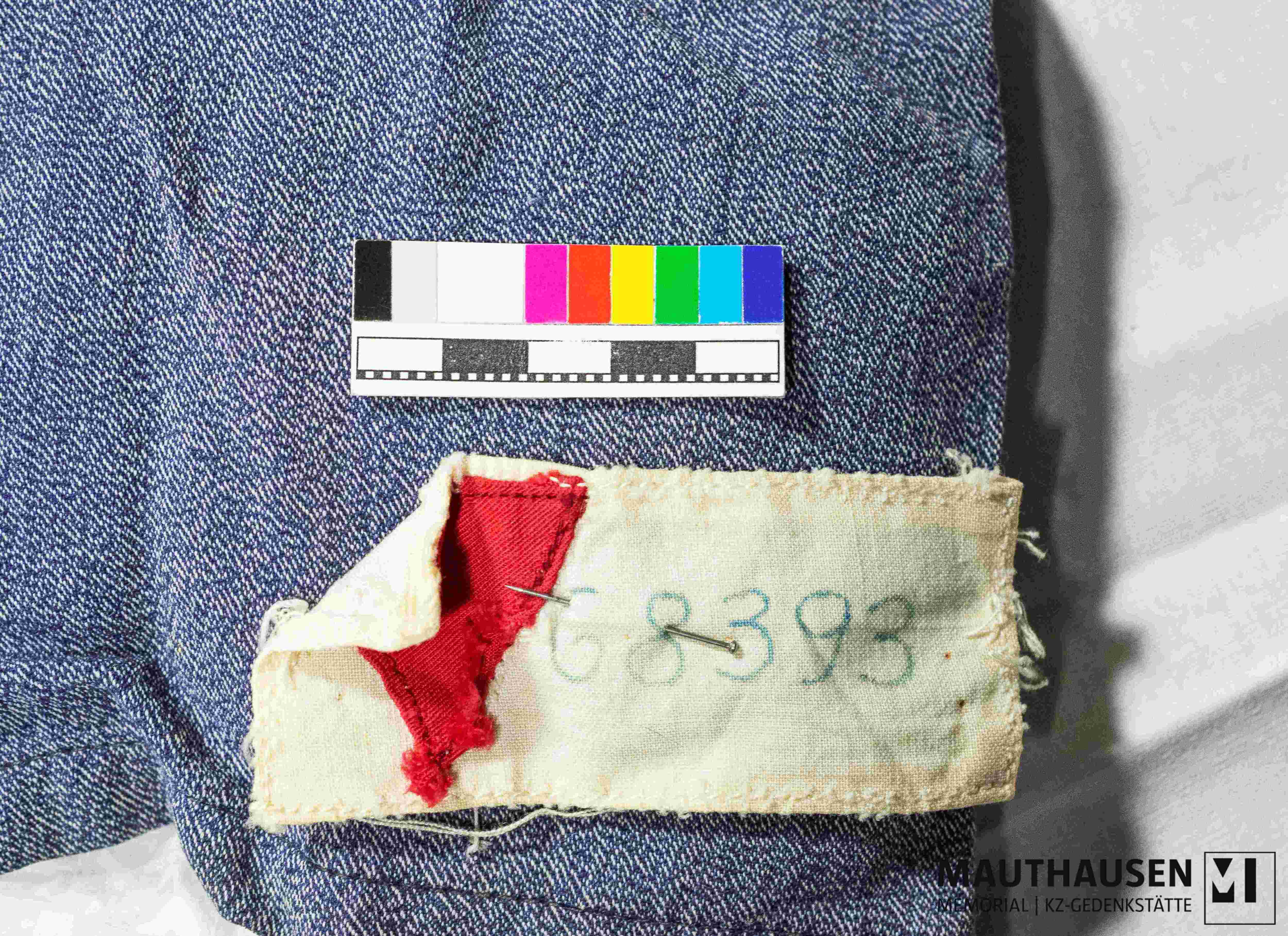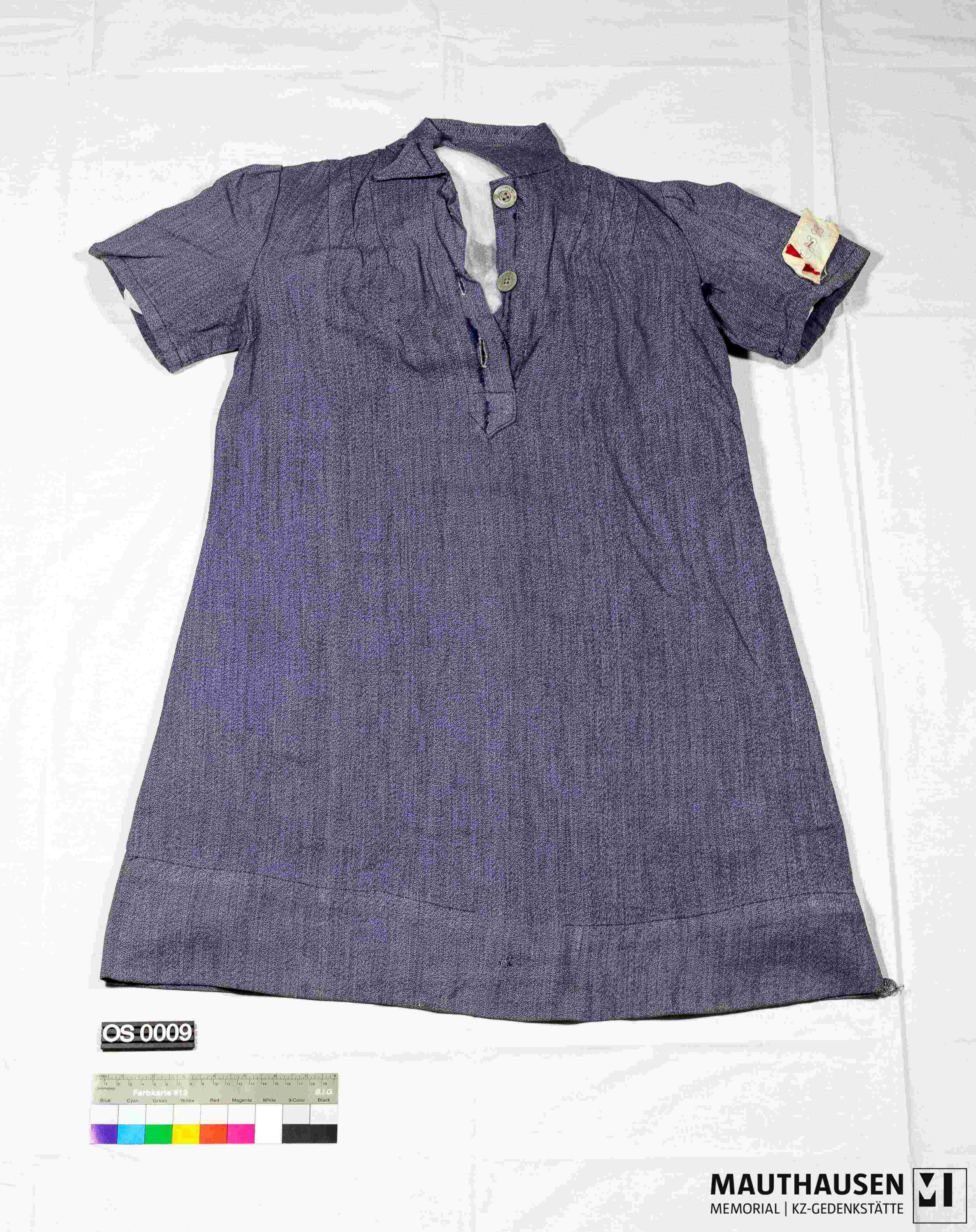 Descriptionmit am Ärmel aufgestecktem Stoffteil: darauf ist Häftlingsnummer "68393" und ein rotes aufgenähtes Dreieck (Winkel); blau, knielang, kurzärmelig, mit Kragen und Knopfleiste; guter Zustand; Gebrauchsspuren; 3 Stopflöcher; am linken Ärmel bei der Naht ein Loch; 3 von 3 Knöpfen erhalten.