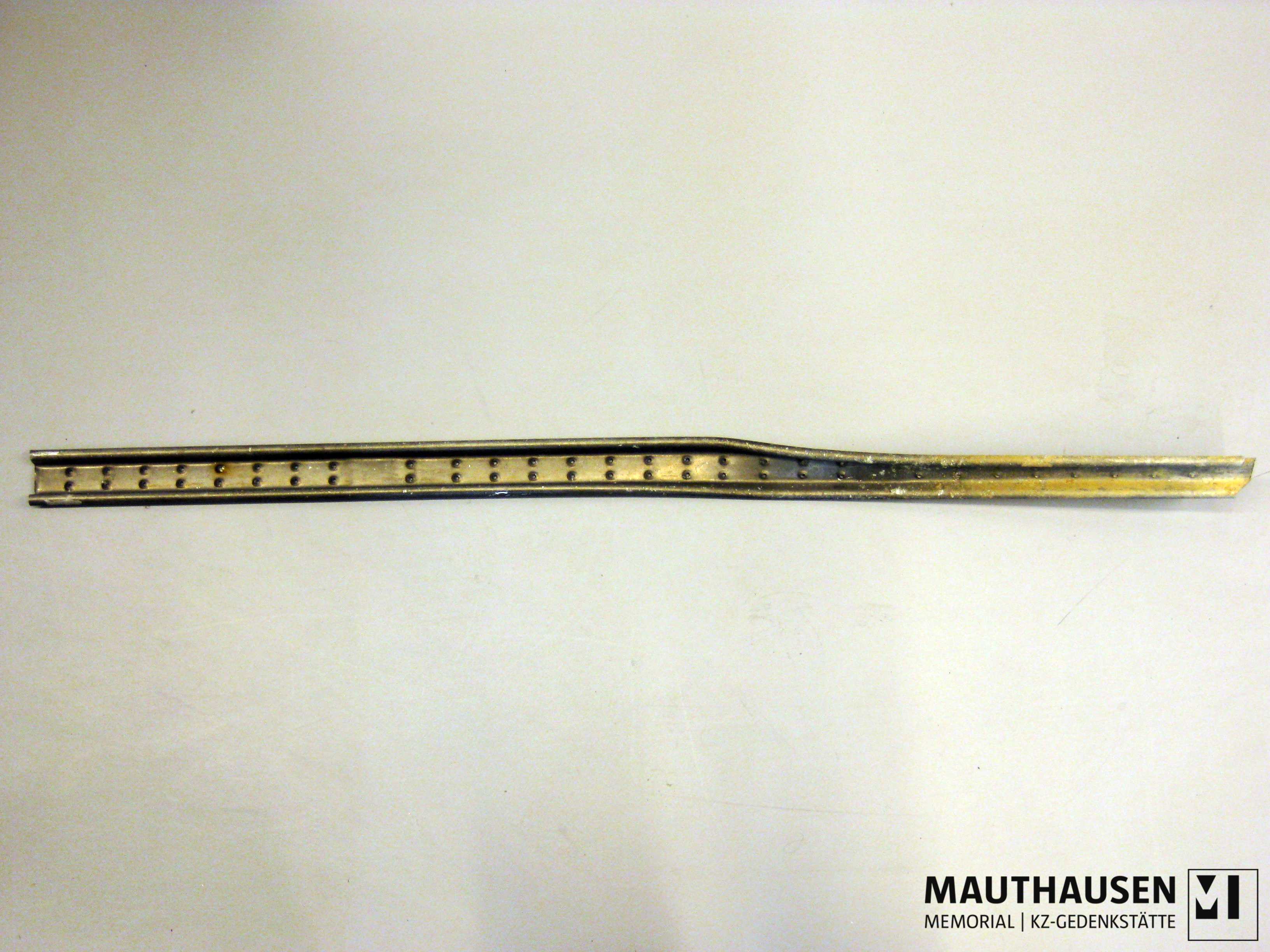OBJEKTBIOGRAPHIE: Leiste wurde zusammen mit drei weiteren von Niklas Bisenberger als Schenkung dem Archiv übergeben (am 12.06.2008, siehe BMI-Akt 3501/9673 – IV/7/08); Es handelt sich um originale Messerschmittleisten, aufgefunden im Raum St. Georgen/Gusen (Stollen); Objekt gehört zusammen mit OS0089, OS0090, OS0091.